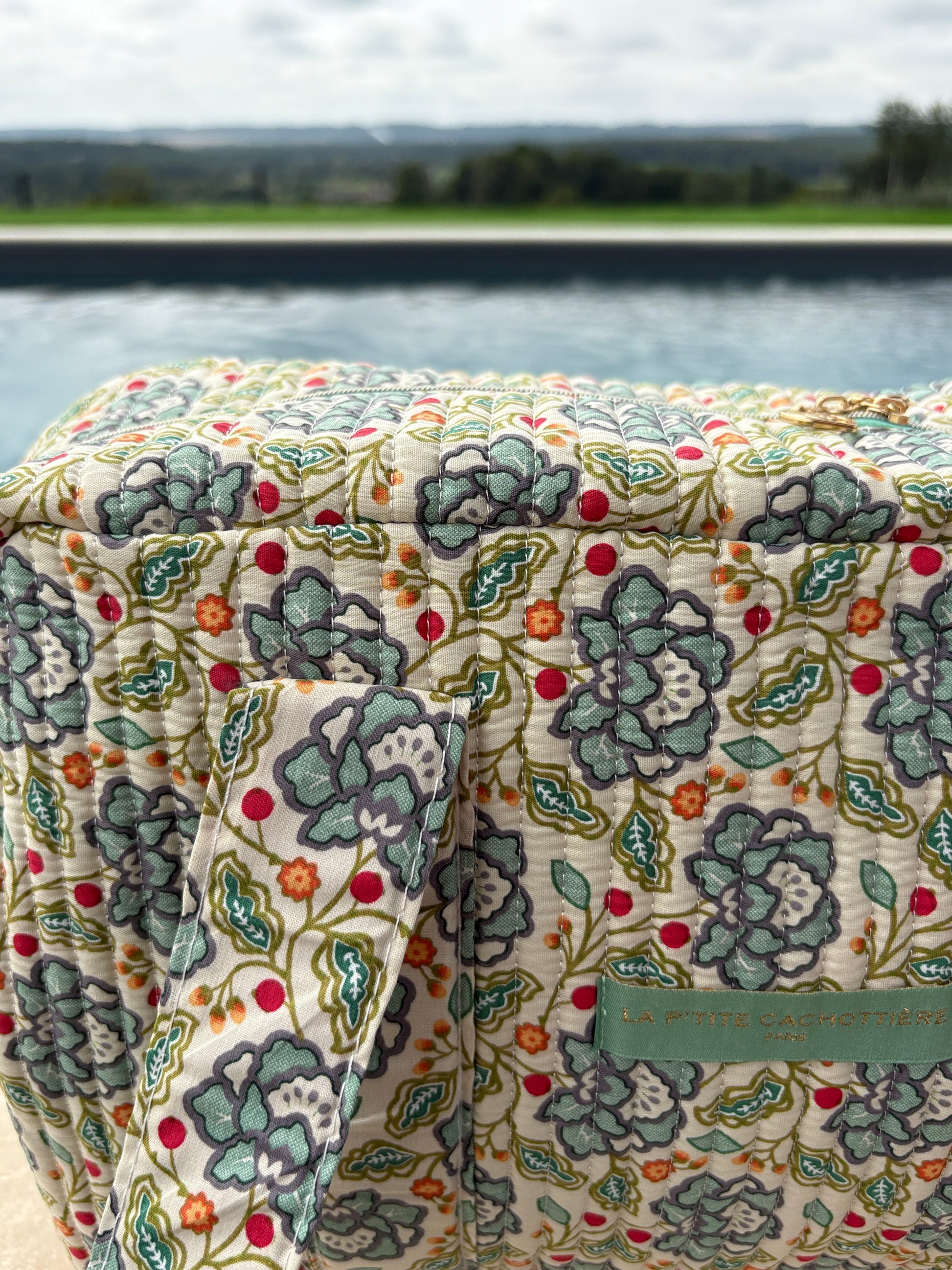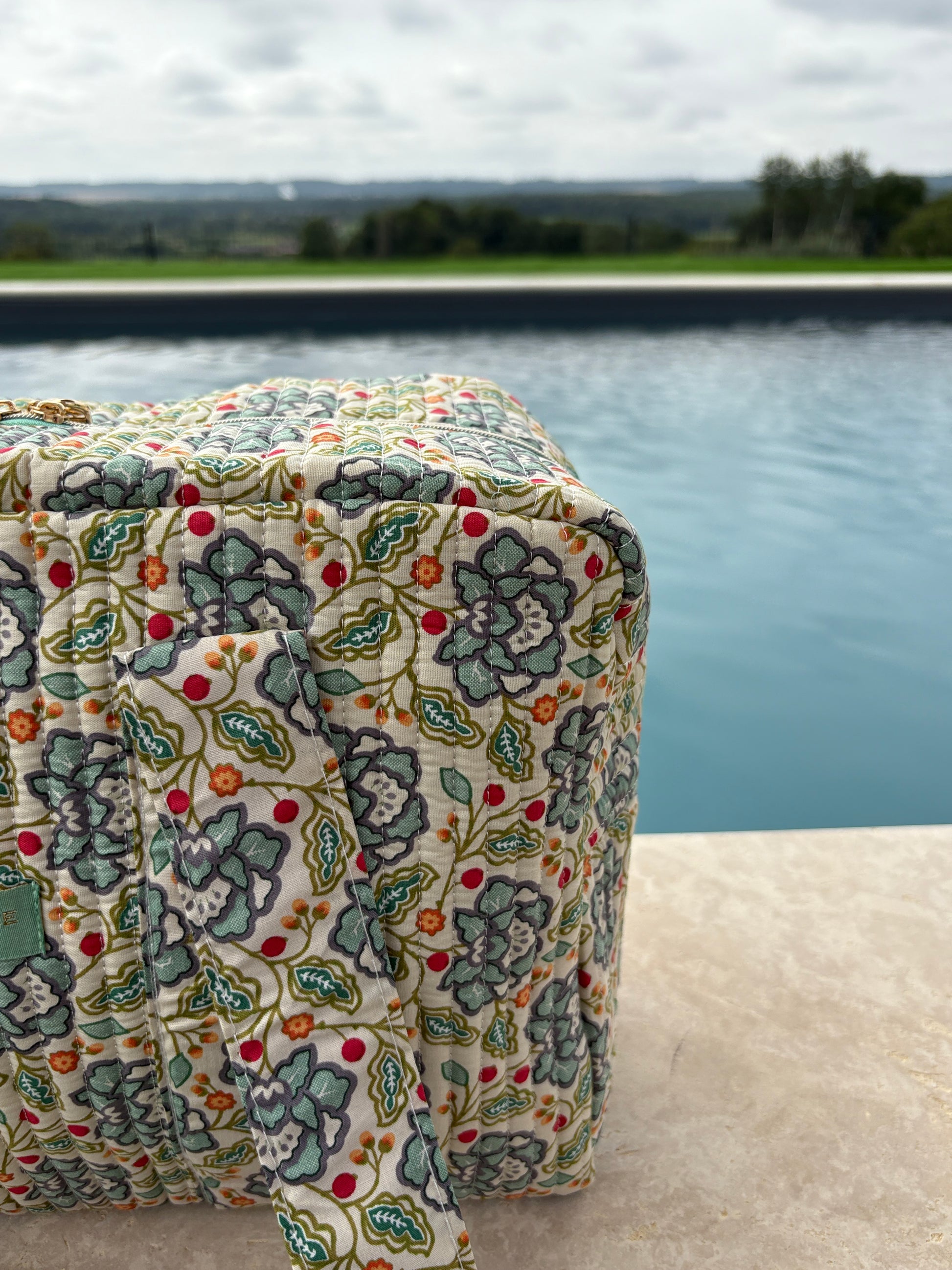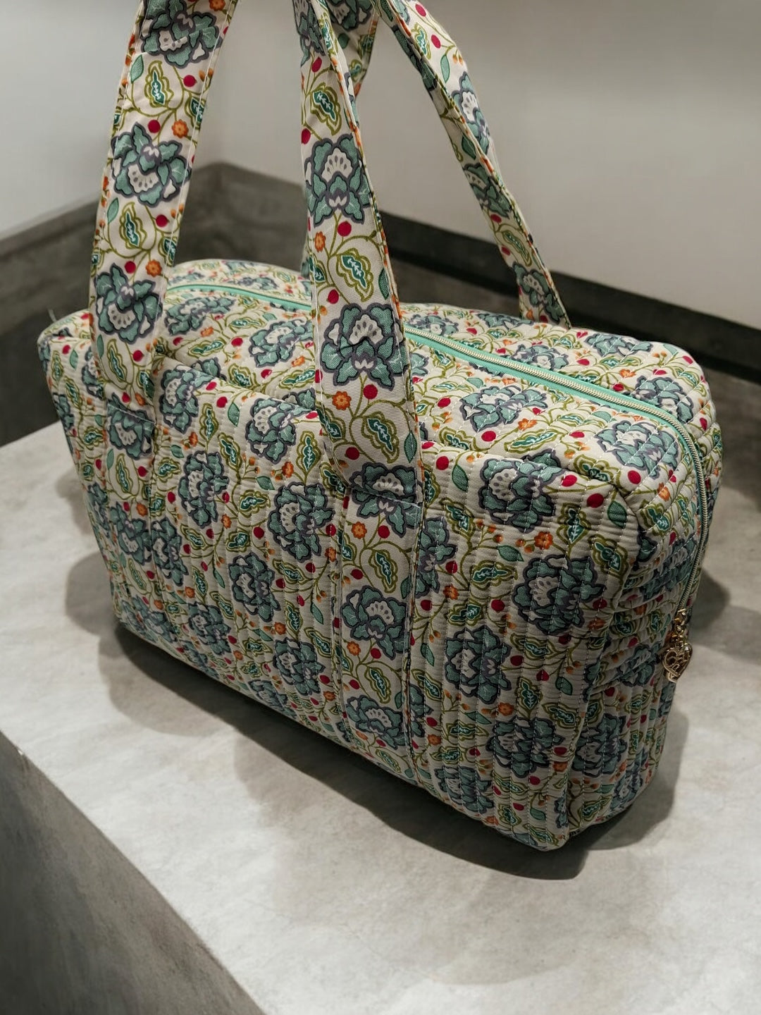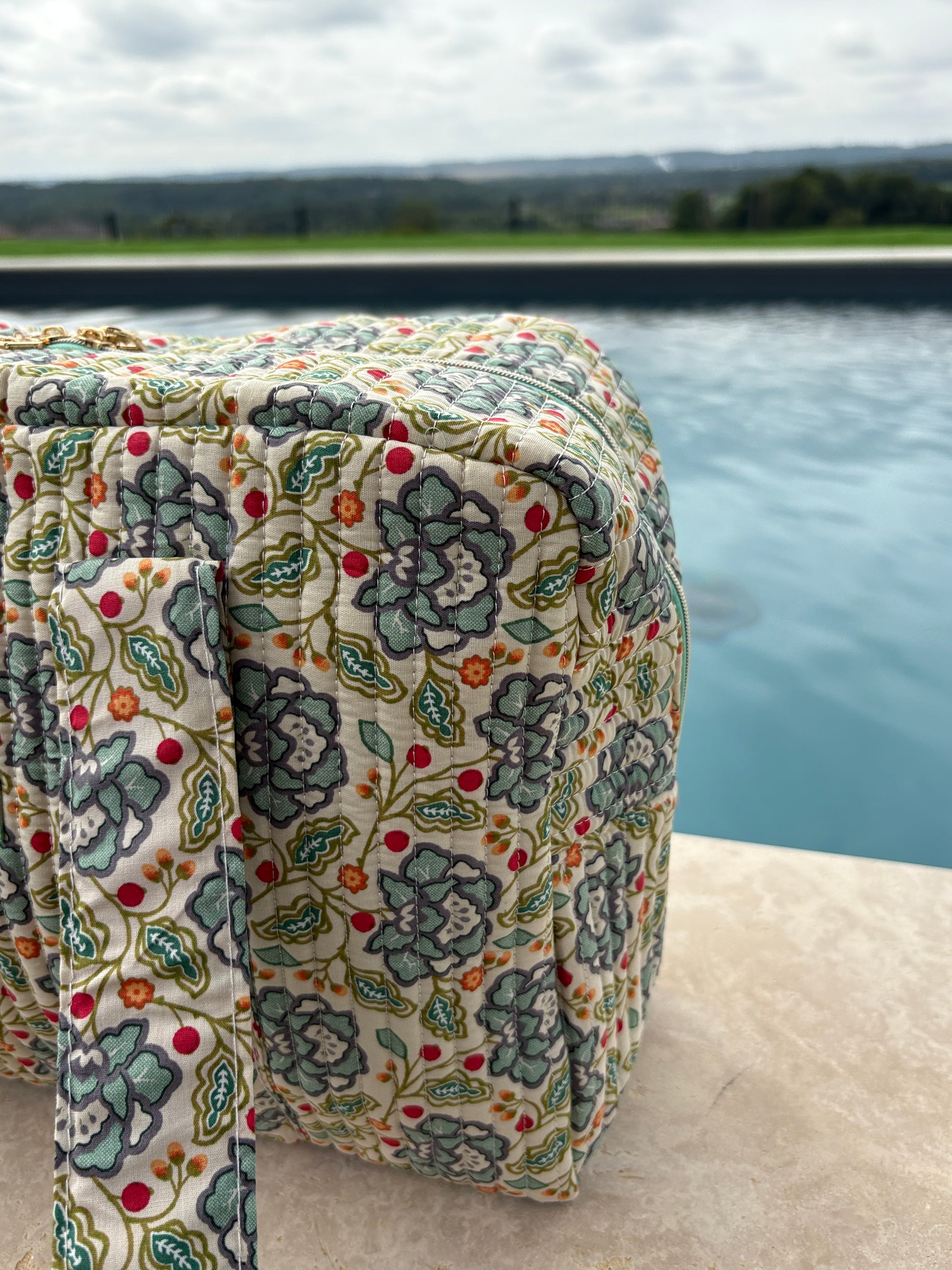 Sac week-end polochon en coton matelassé blanc liberty fleuri jaune et bleu