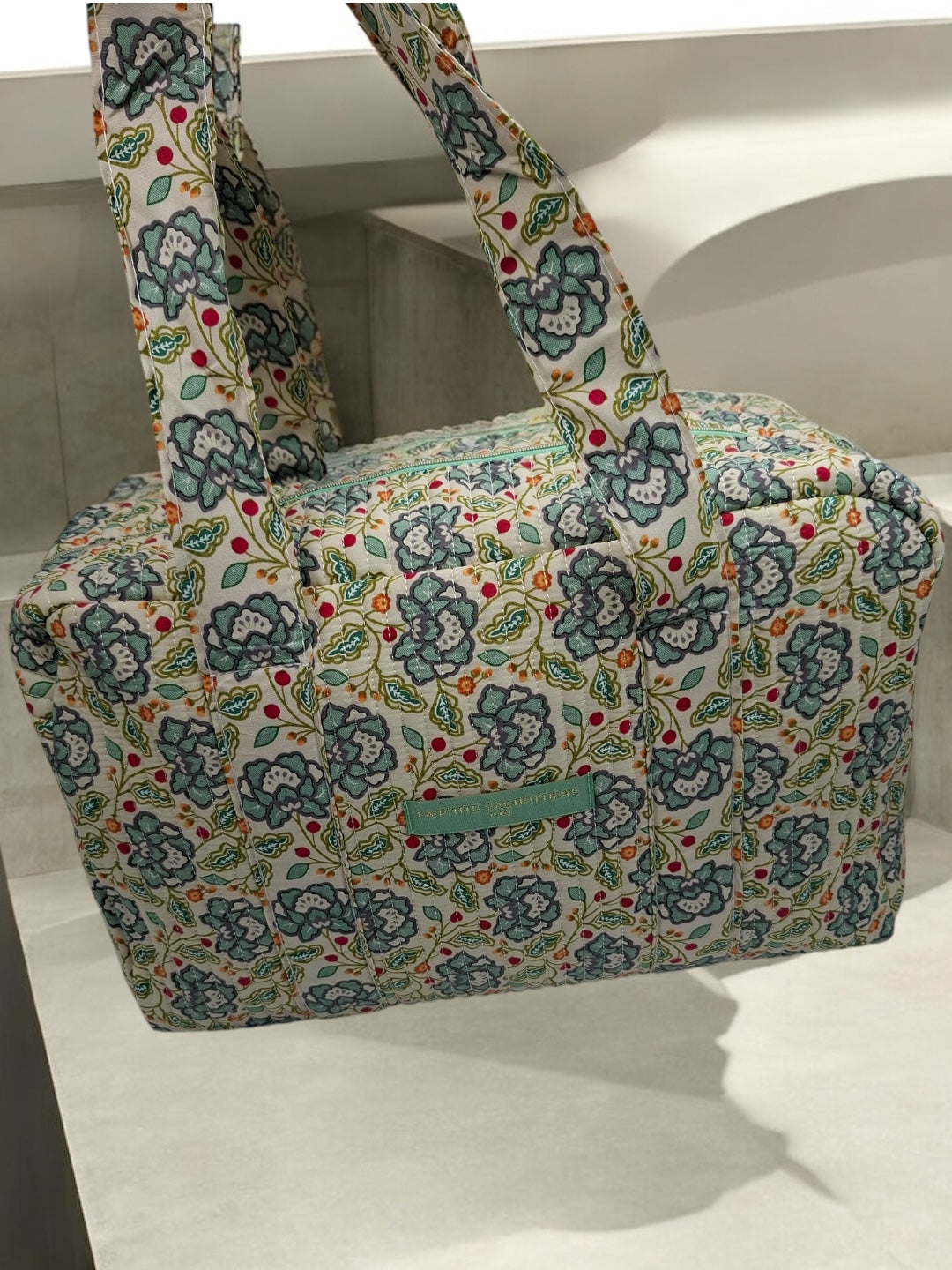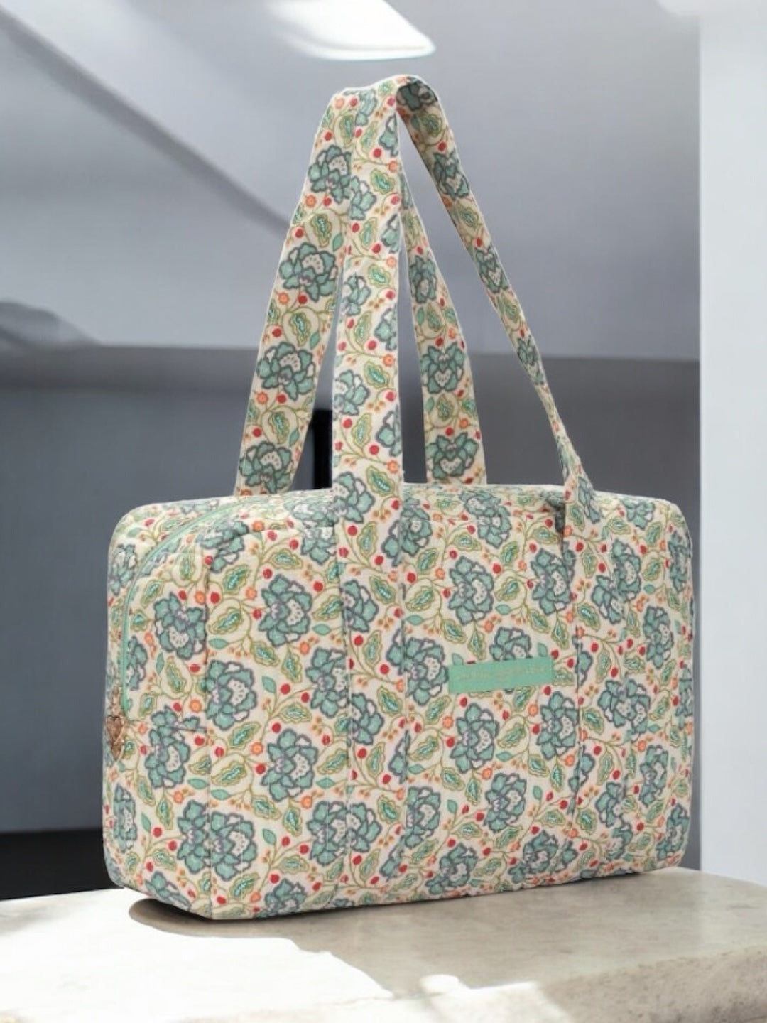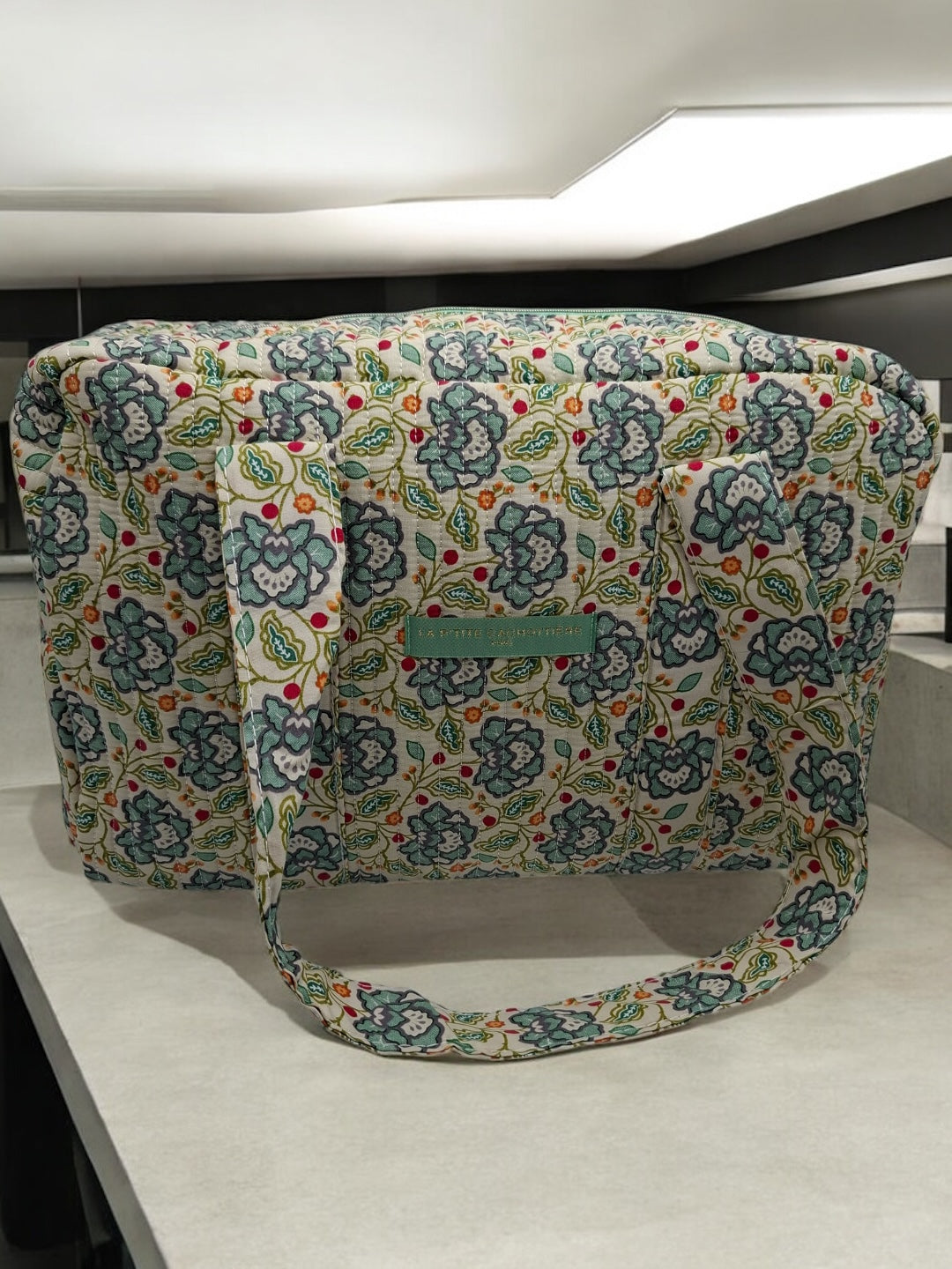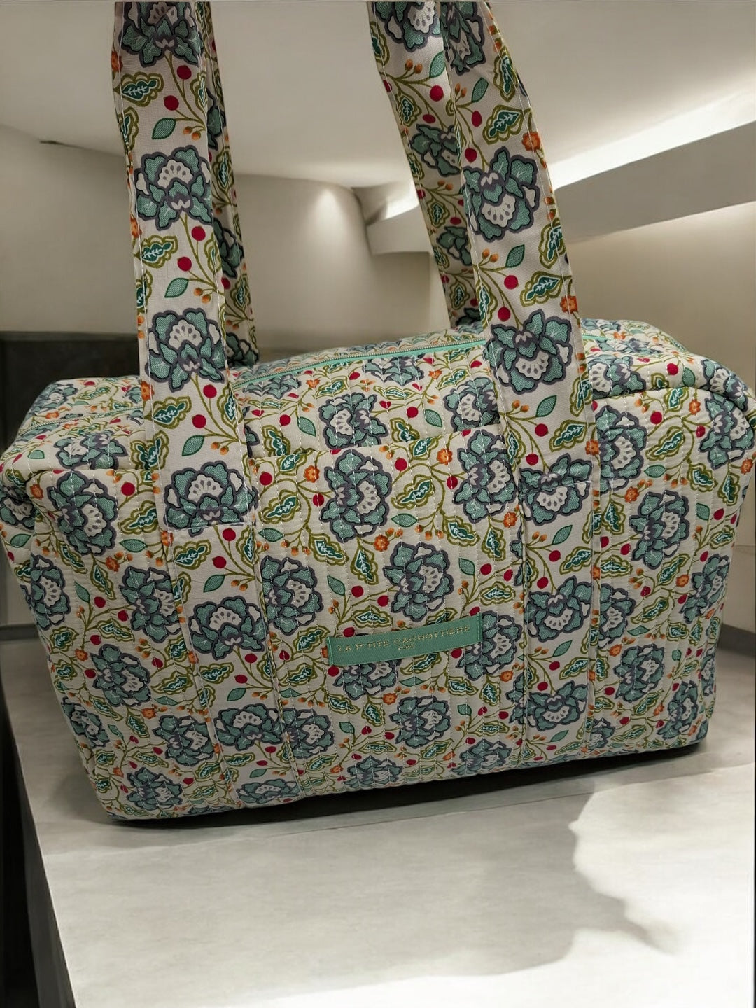 Le sac présente un motif floral multicolore. Les motifs comportent des fleurs dans des nuances de bleu, rouge et vert sur un fond écru. Le sac est doté de deux longues anses robustes pour un porté épaule. Les coutures sont discrètes et bien réalisées, assurant une finition soignée. Le design est rectangulaire et spacieux, offrant une bonne capacité de rangement. Une étiquette de couleur verte pastel est fixée sur le devant, ajoutant un détail subtil au design général.