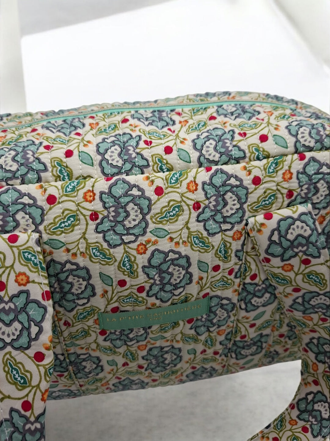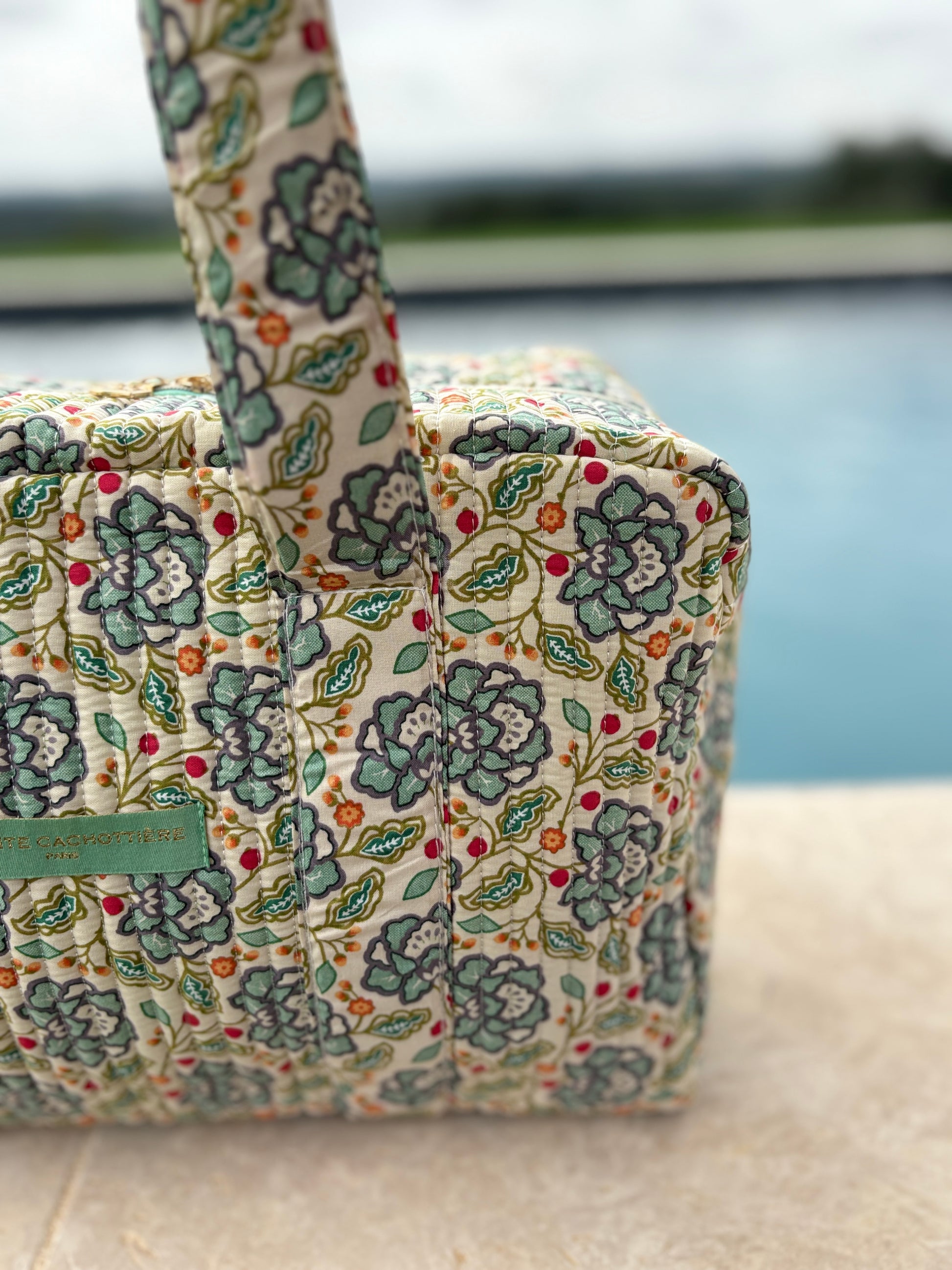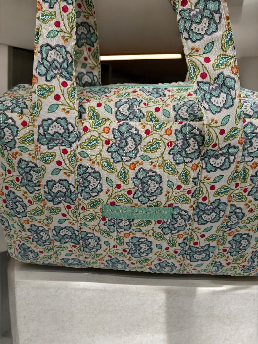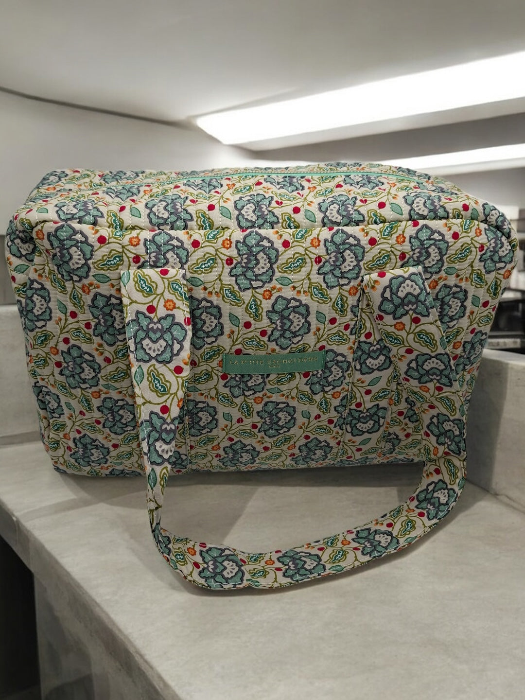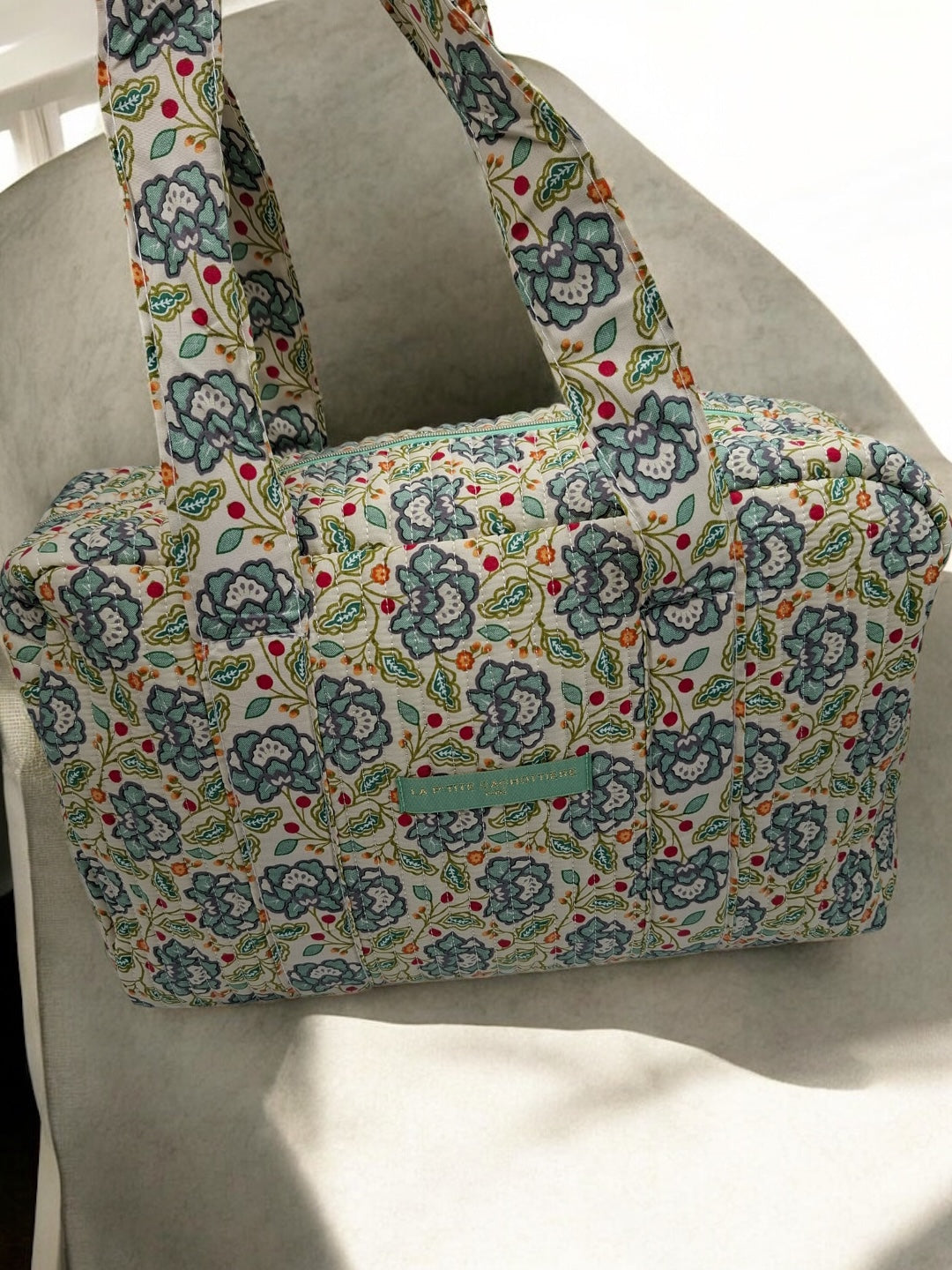 Le sac présente un motif floral multicolore. Les motifs comportent des fleurs dans des nuances de bleu, rouge et vert sur un fond écru. Le sac est doté de deux longues anses robustes pour un porté épaule. Les coutures sont discrètes et bien réalisées, assurant une finition soignée. Le design est rectangulaire et spacieux, offrant une bonne capacité de rangement. Une étiquette de couleur verte pastel est fixée sur le devant, ajoutant un détail subtil au design général.