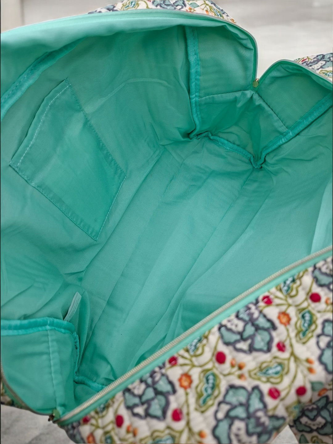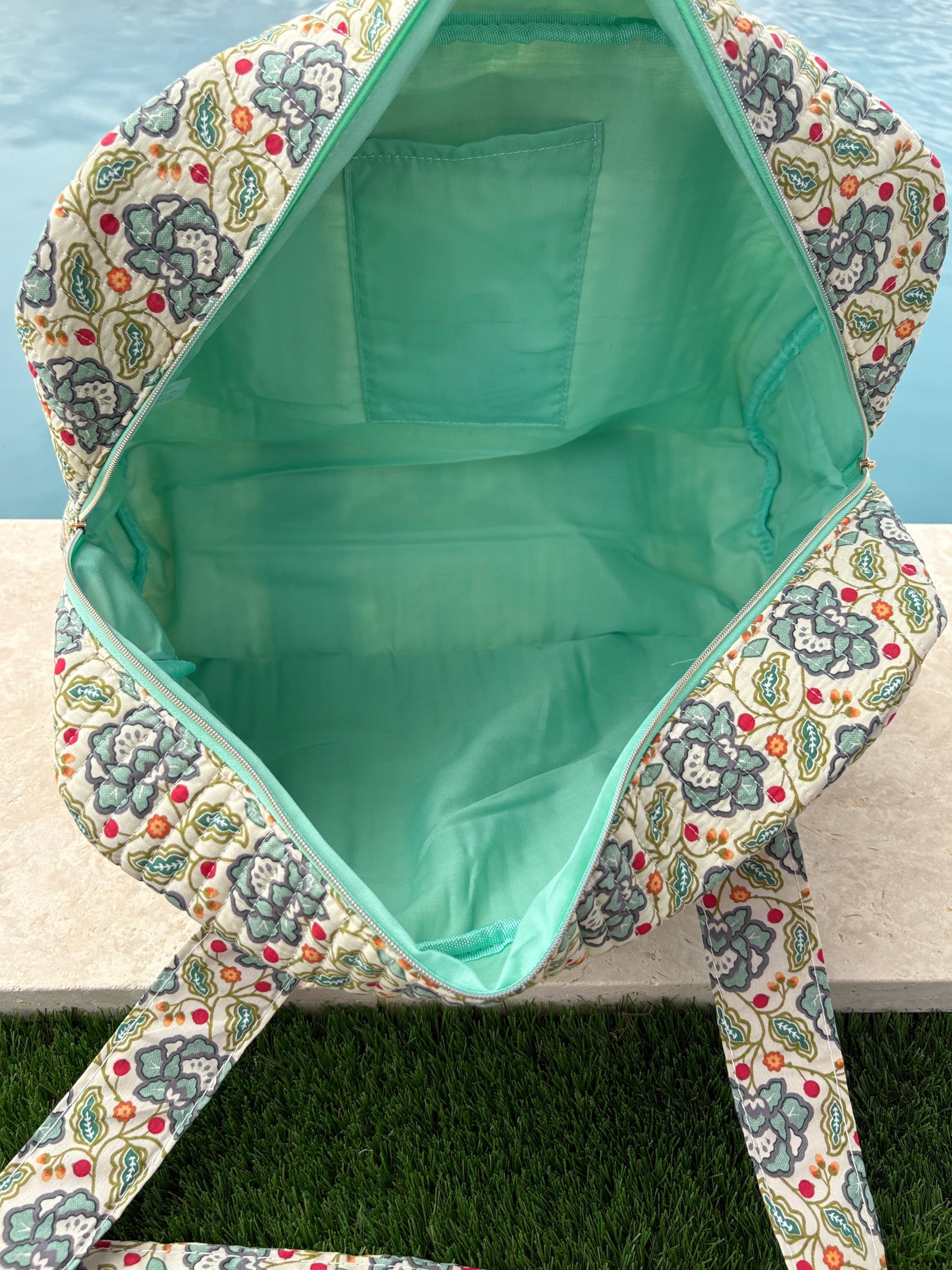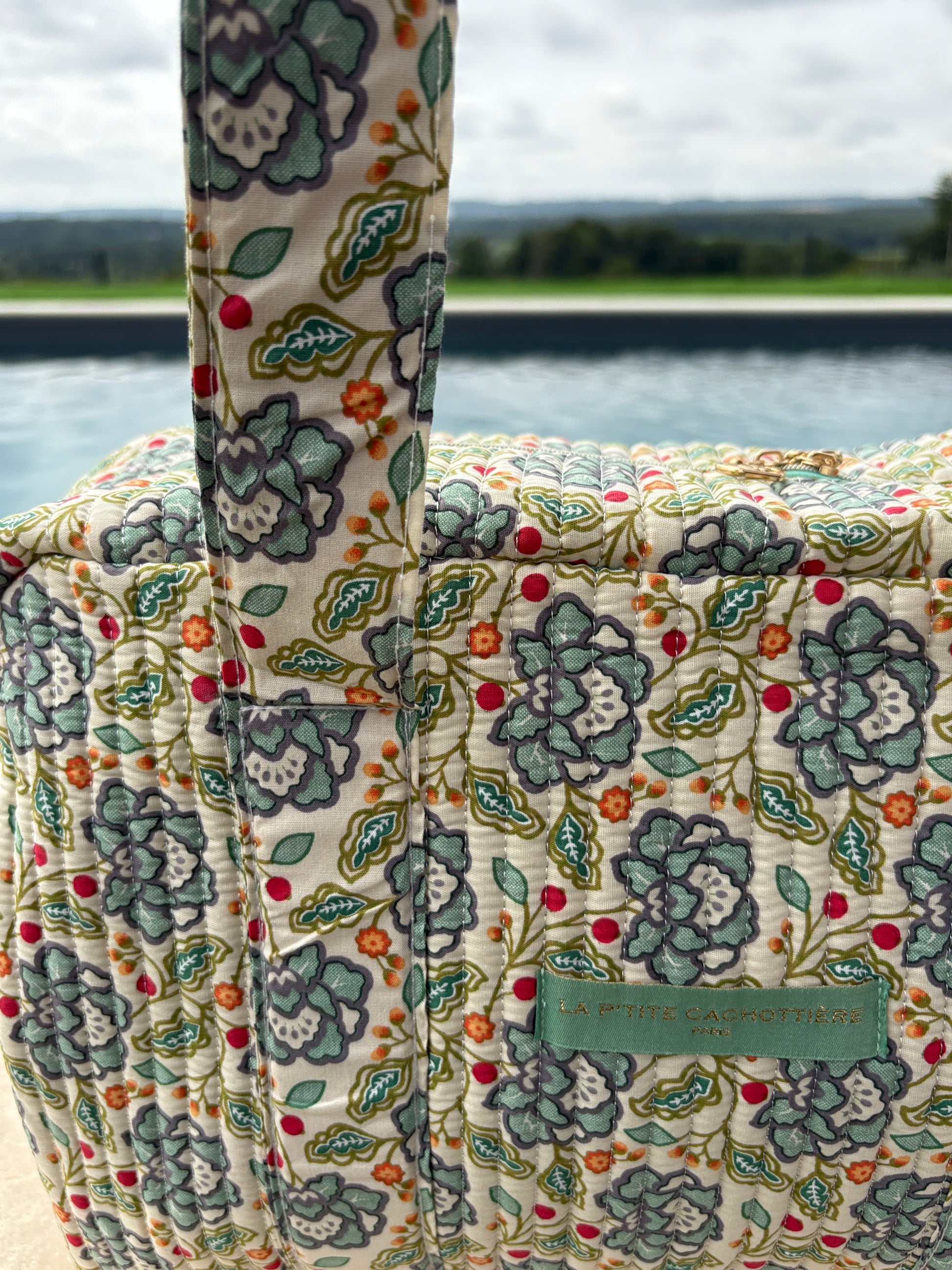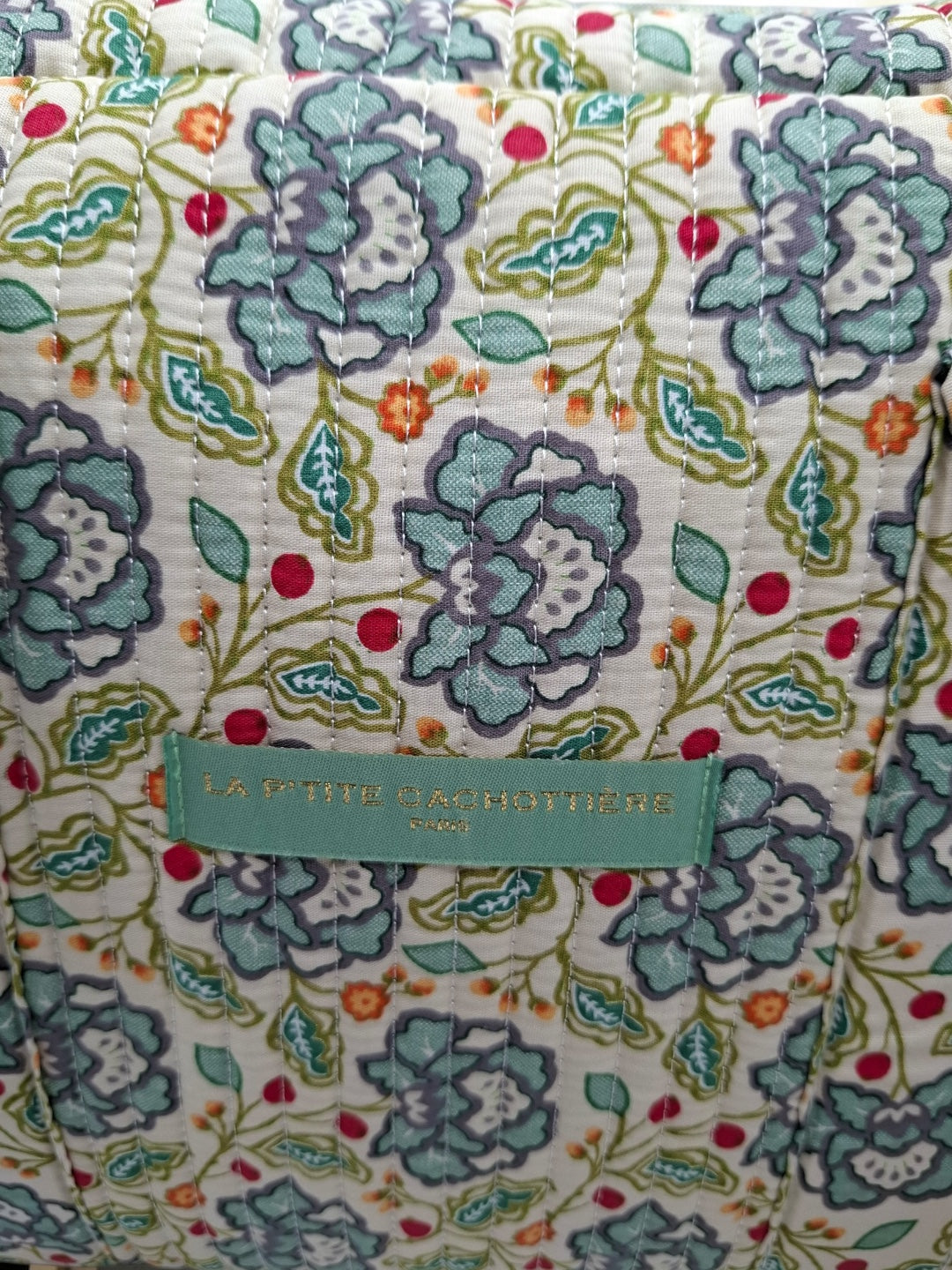 Le sac présente un motif floral multicolore. Les motifs comportent des fleurs dans des nuances de bleu, rouge et vert sur un fond écru. Le sac est doté de deux longues anses robustes pour un porté épaule. Les coutures sont discrètes et bien réalisées, assurant une finition soignée. Le design est rectangulaire et spacieux, offrant une bonne capacité de rangement. Une étiquette de couleur verte pastel est fixée sur le devant, ajoutant un détail subtil au design général.