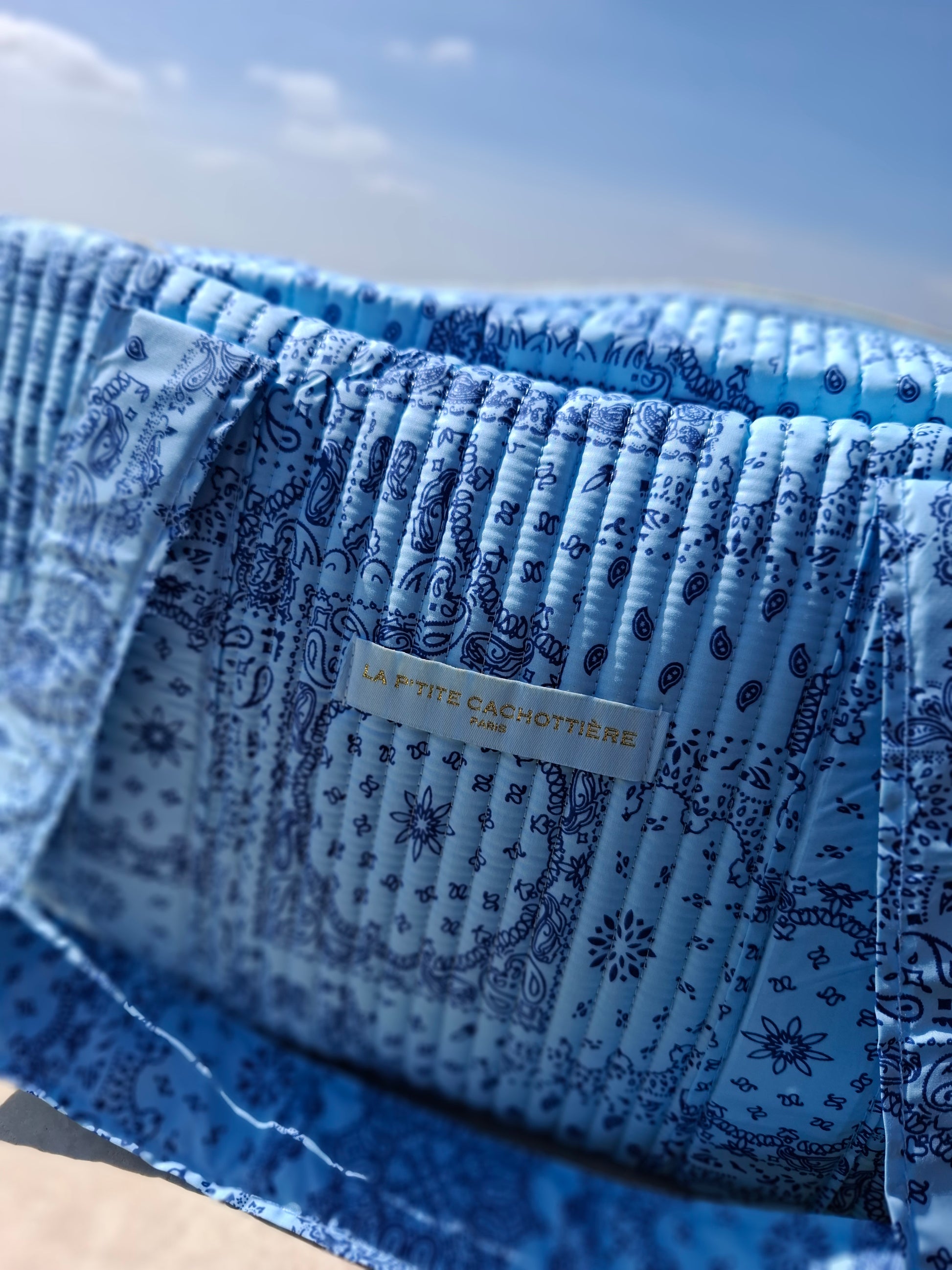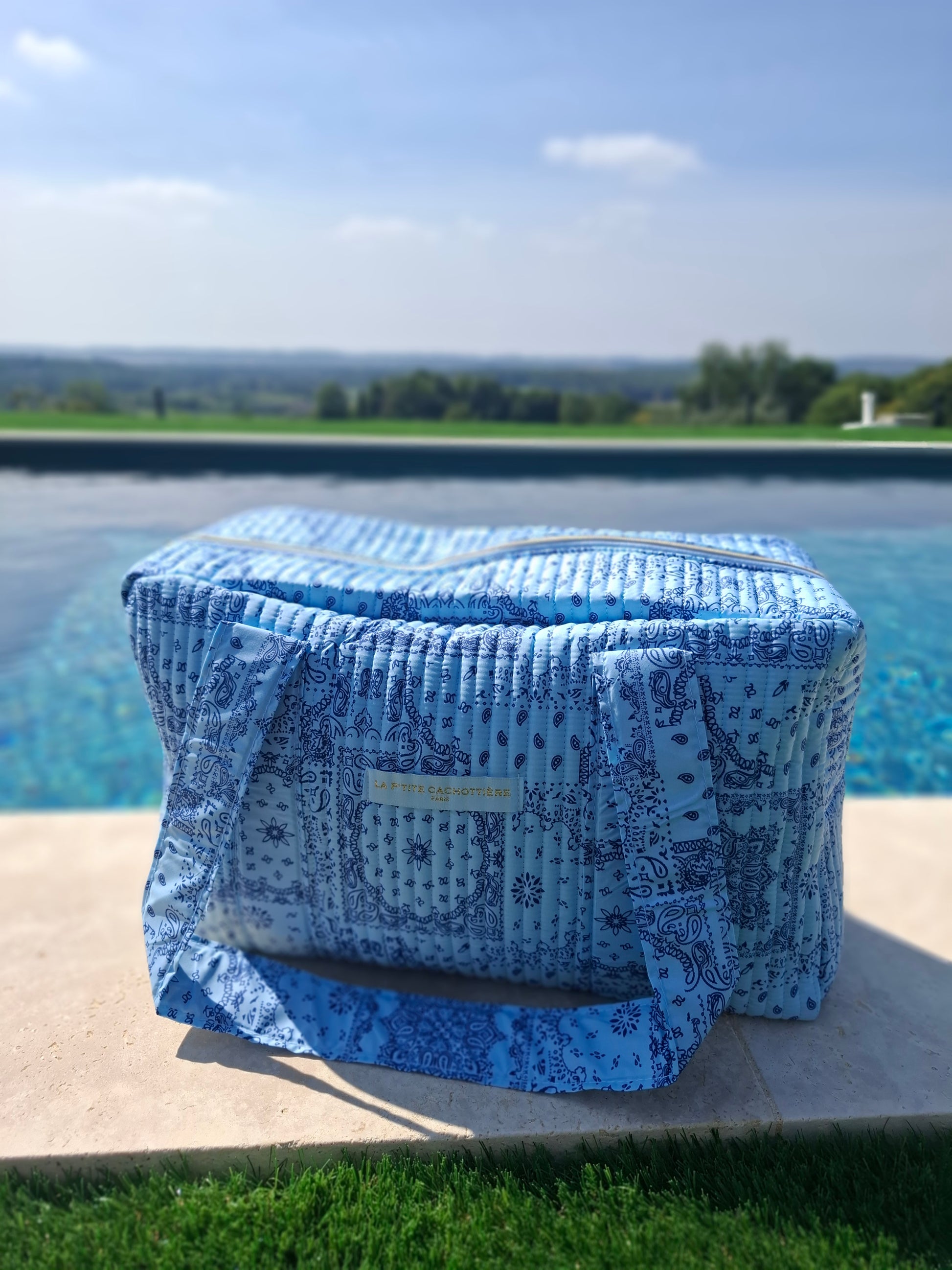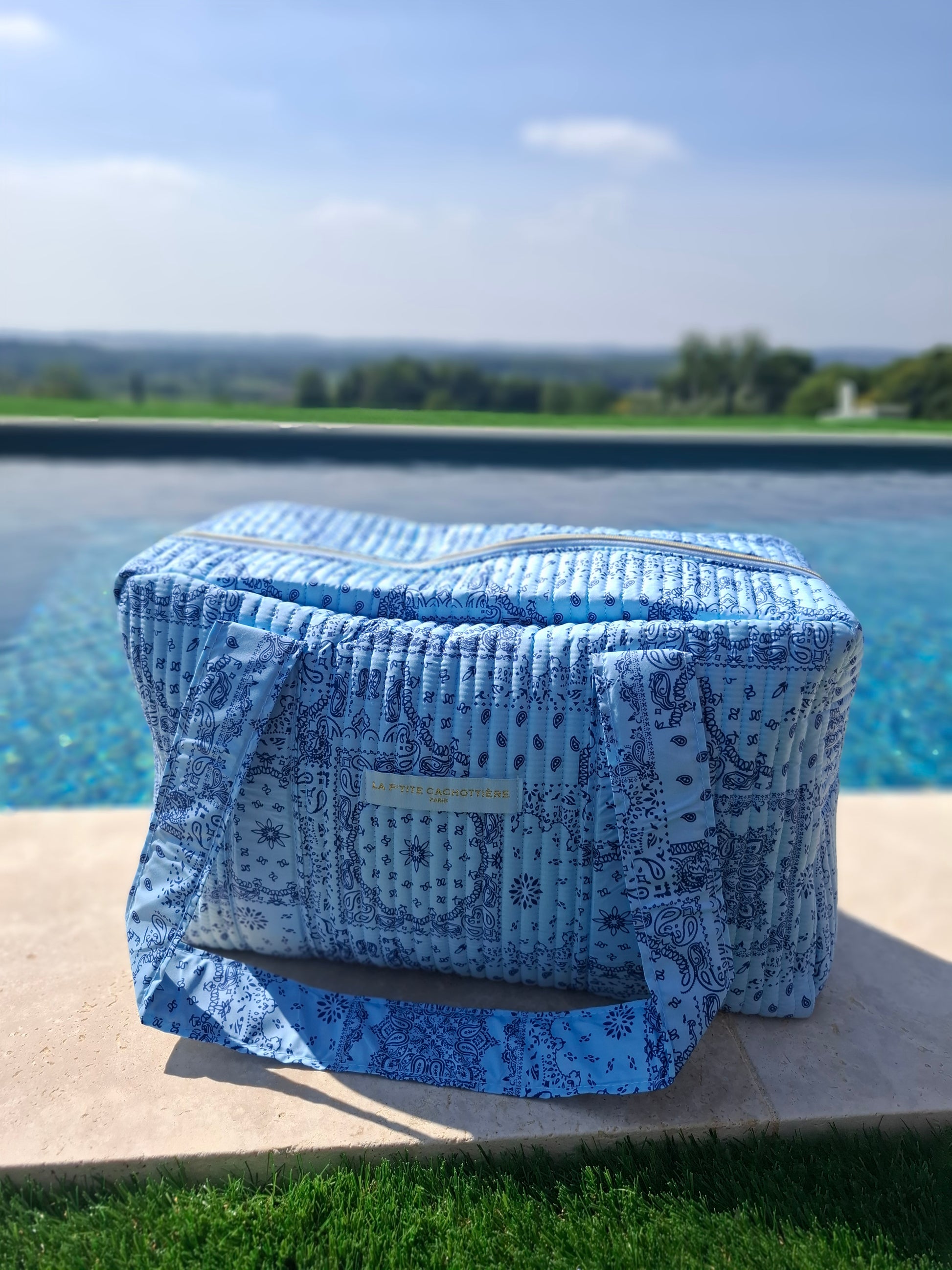 Sac week-end polochon en coton matelassé bleu design paisley bleu marine
