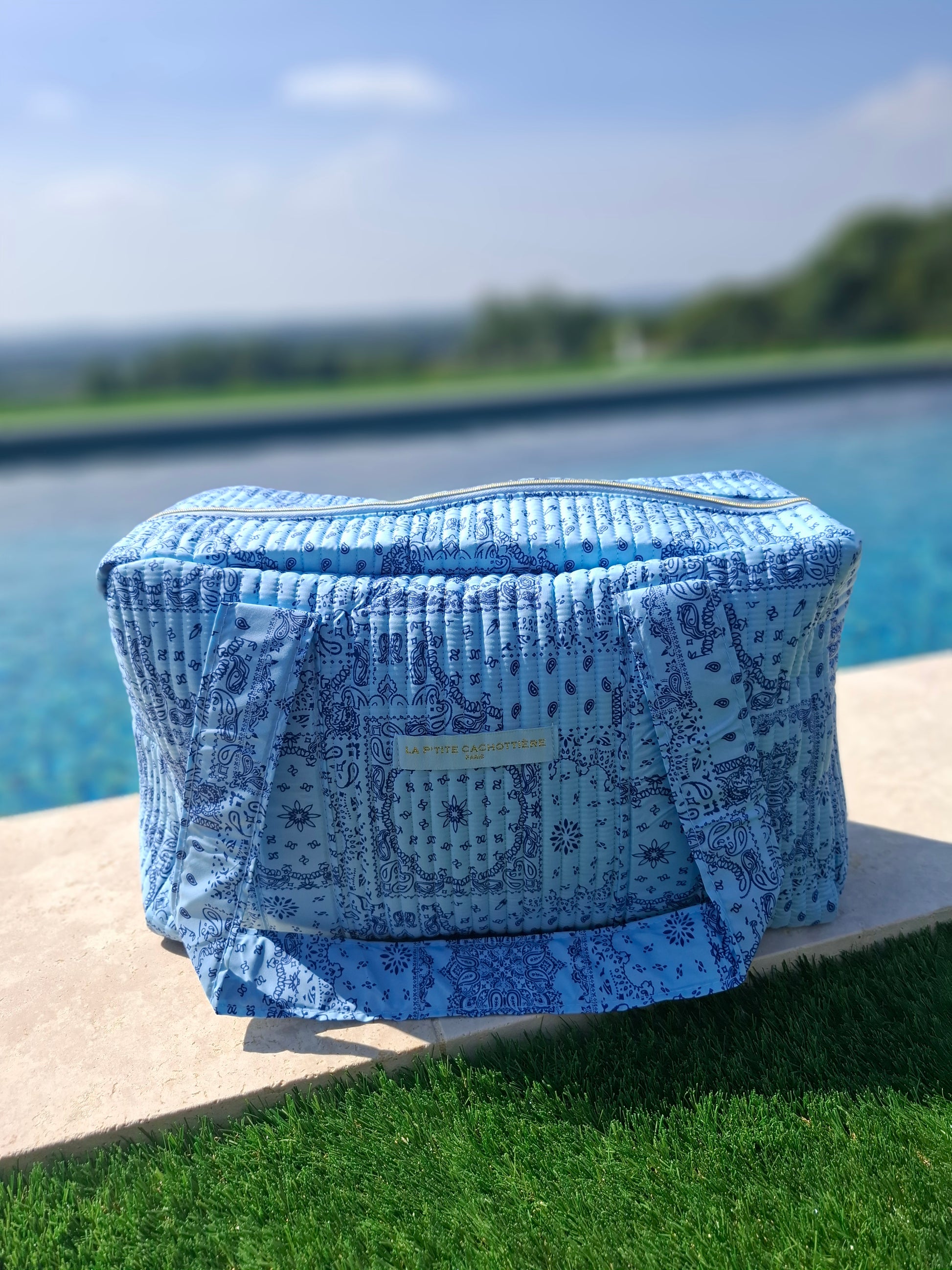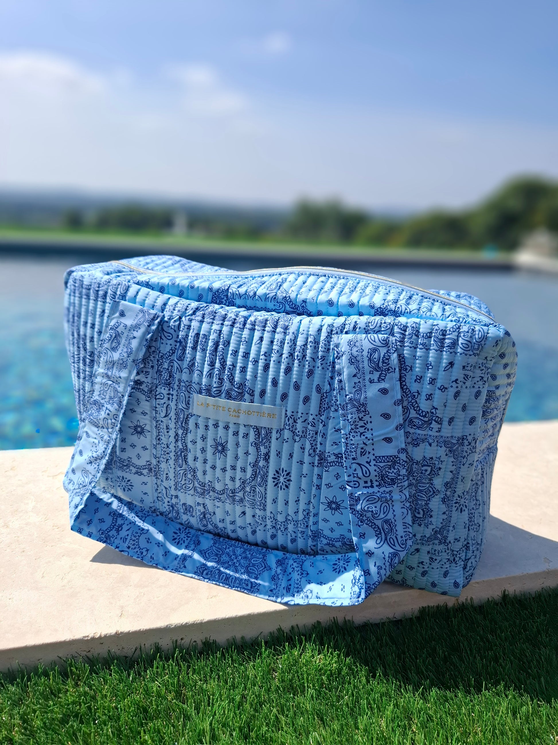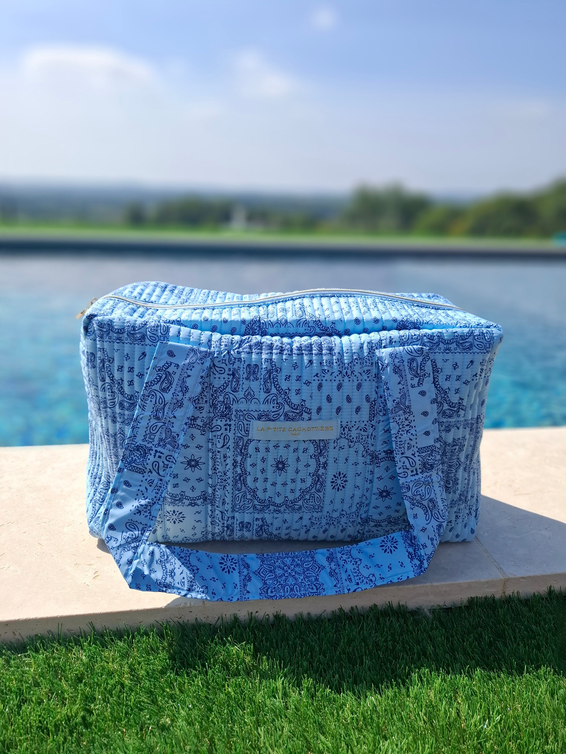 Le sac de voyage est de couleur bleue avec un design paisley bleu marine. Il est matelassé pour offrir une texture agréable et un confort supplémentaire lors du transport. Les poignées du sac sont également décorées des mêmes motifs, assurant un style harmonieux à l'ensemble.