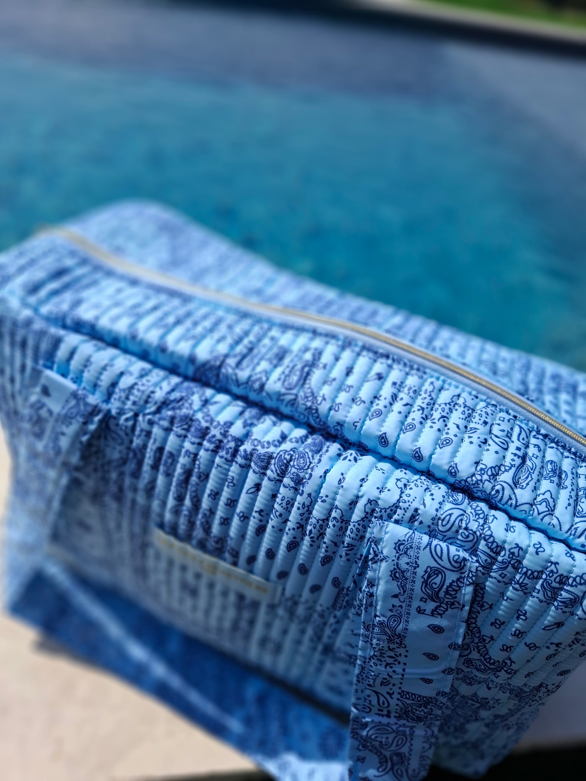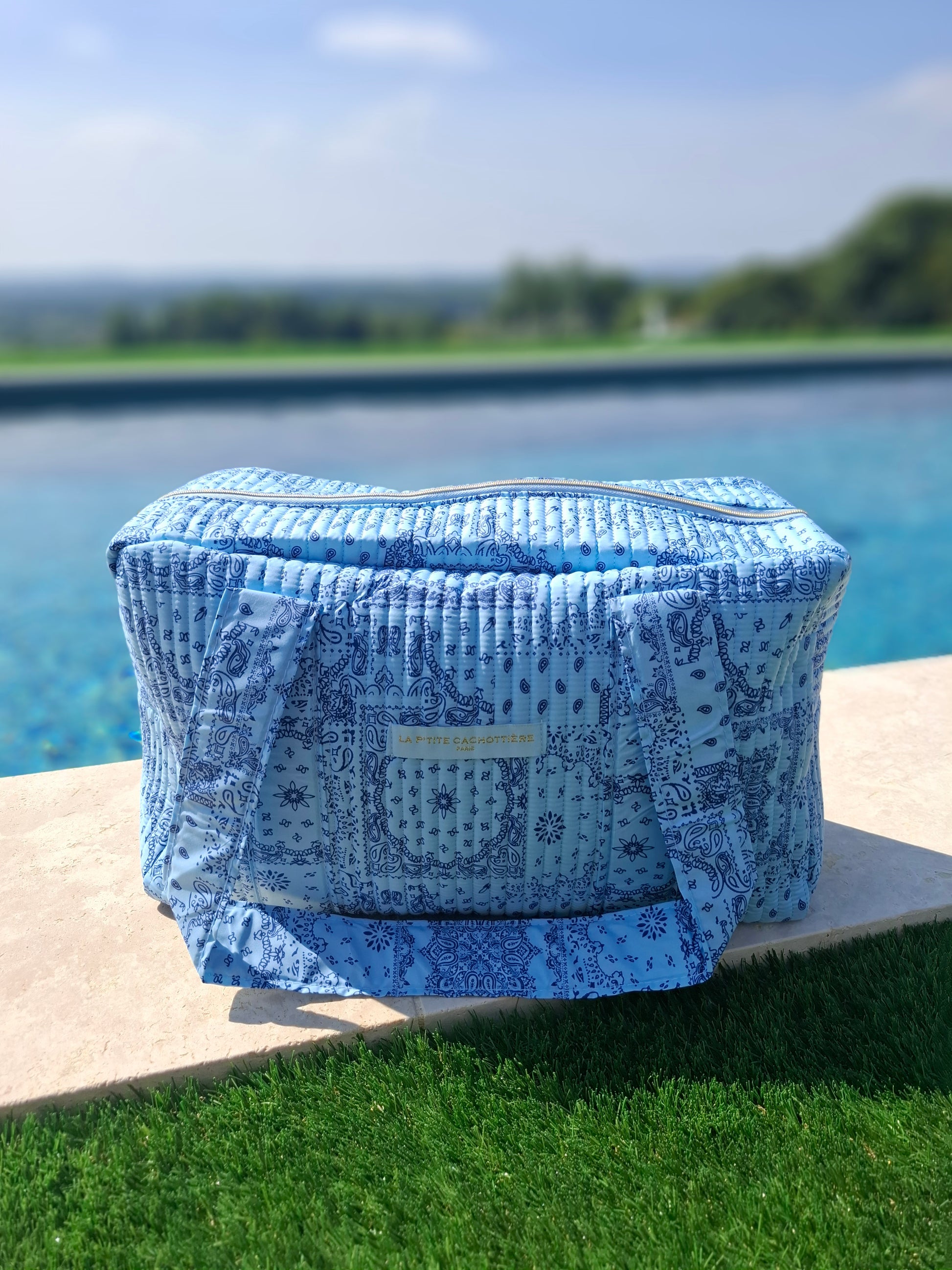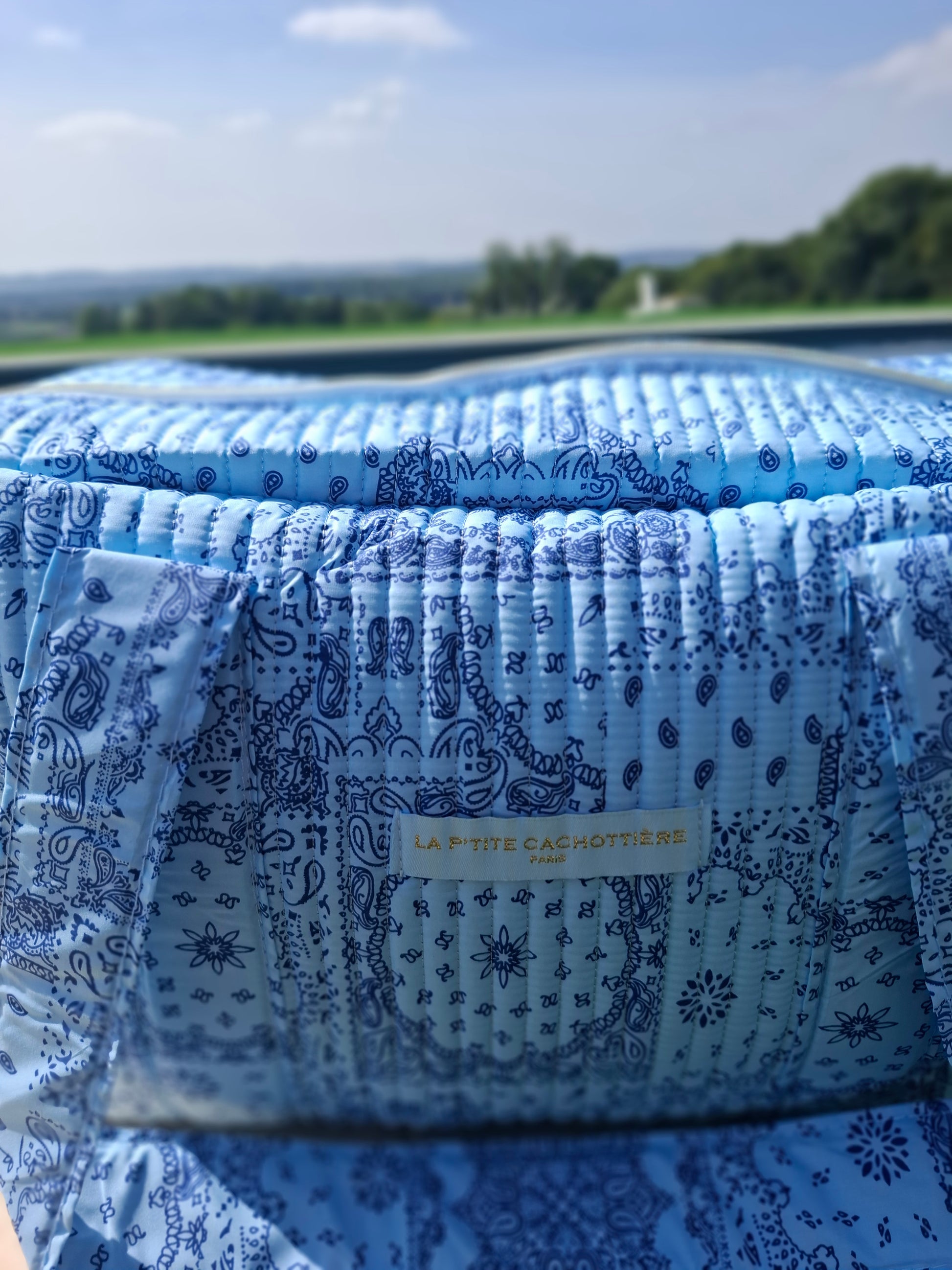 Le sac de voyage est de couleur bleue avec un design paisley bleu marine. Il est matelassé pour offrir une texture agréable et un confort supplémentaire lors du transport. Les poignées du sac sont également décorées des mêmes motifs, assurant un style harmonieux à l'ensemble.