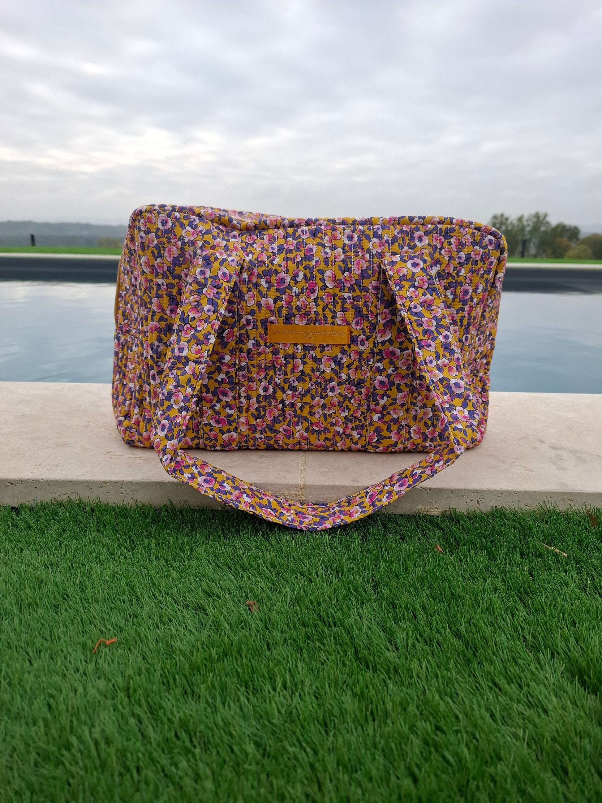 Sac week-end polochon en coton matelassé jaune liberty fleuris rose et violet
