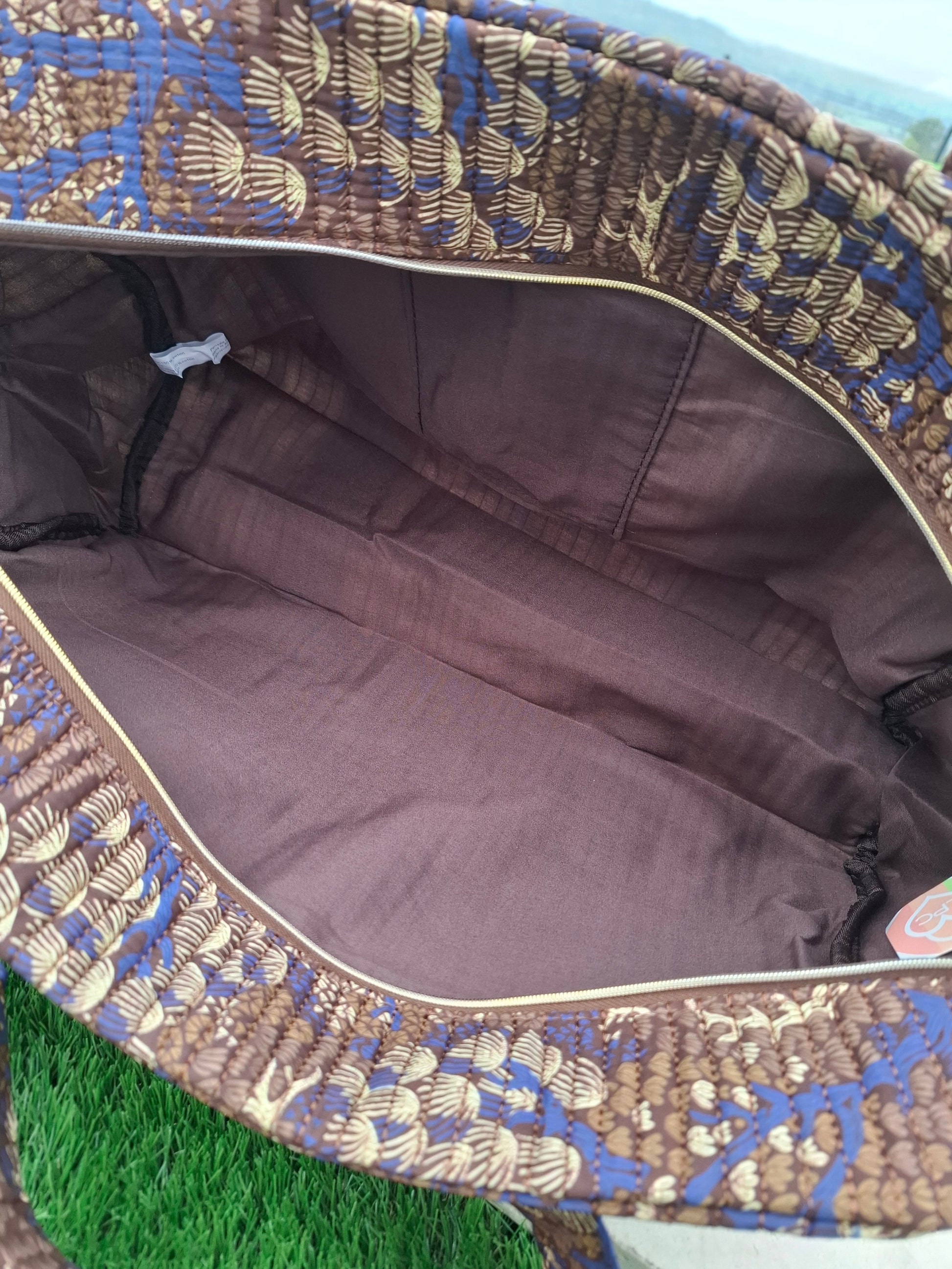 Sac week-end polochon en coton matelassé marron liberty fleuris beige et bleu