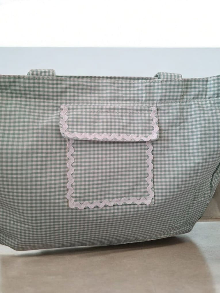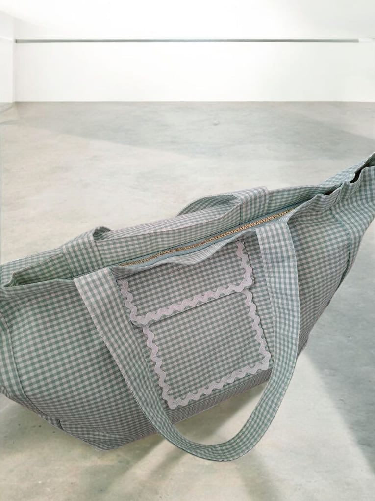 Sac week-end voyage en coton motif à carreaux vert d'eau et blanc