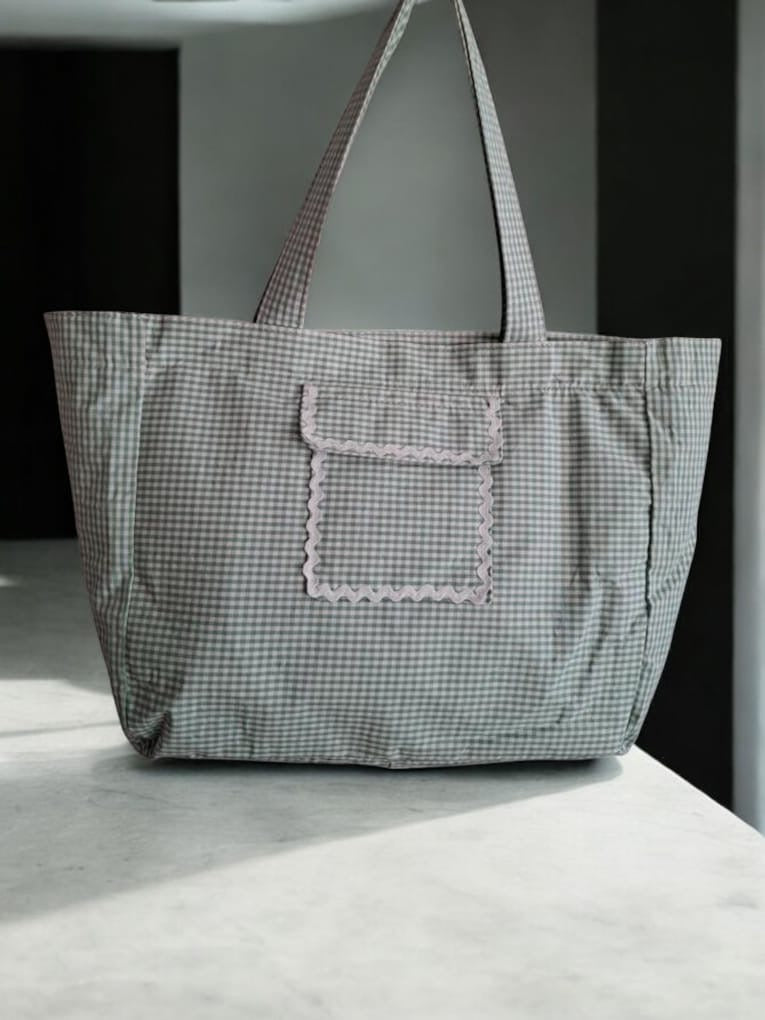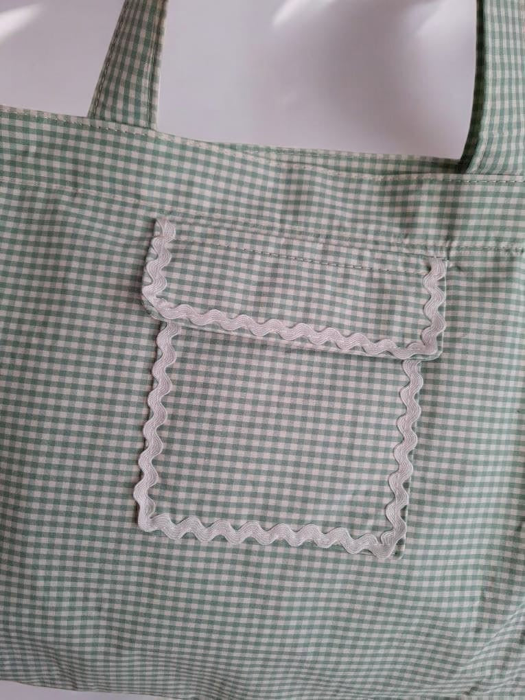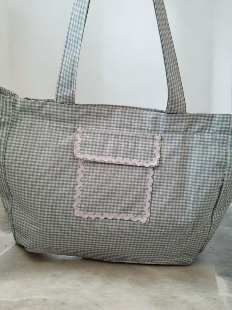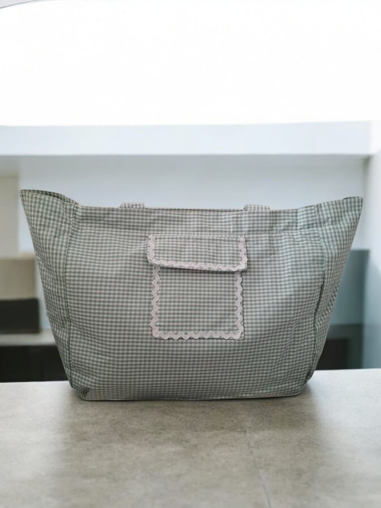 Le sac week-end présente un motif à carreaux dans des tons vert et blanc. Il est doté d'une grande poche avant ornée d'une bordure blanche ondulée, ajoutant une touche de sophistication. Les anses sont larges et confortables, permettant de le porter facilement à l'épaule. Le sac se ferme avec une fermeture éclair visible sur le dessus, assurant la sécurité de vos affaires personnelles.
