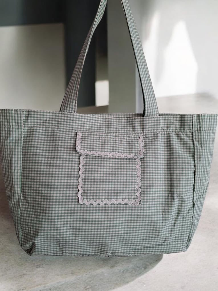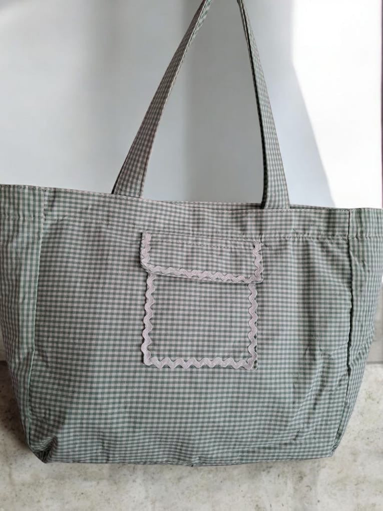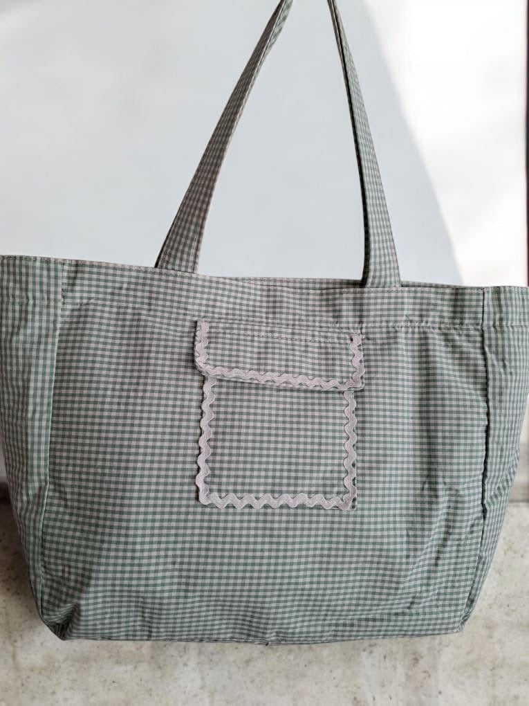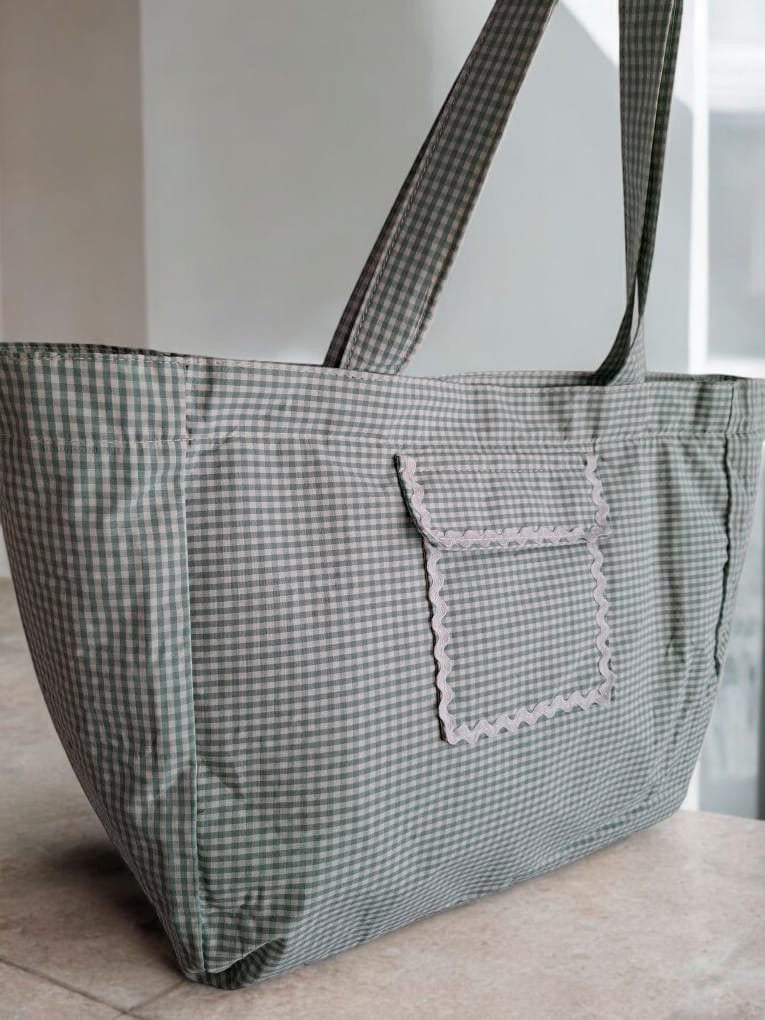Le sac week-end présente un motif à carreaux dans des tons vert et blanc. Il est doté d'une grande poche avant ornée d'une bordure blanche ondulée, ajoutant une touche de sophistication. Les anses sont larges et confortables, permettant de le porter facilement à l'épaule. Le sac se ferme avec une fermeture éclair visible sur le dessus, assurant la sécurité de vos affaires personnelles.