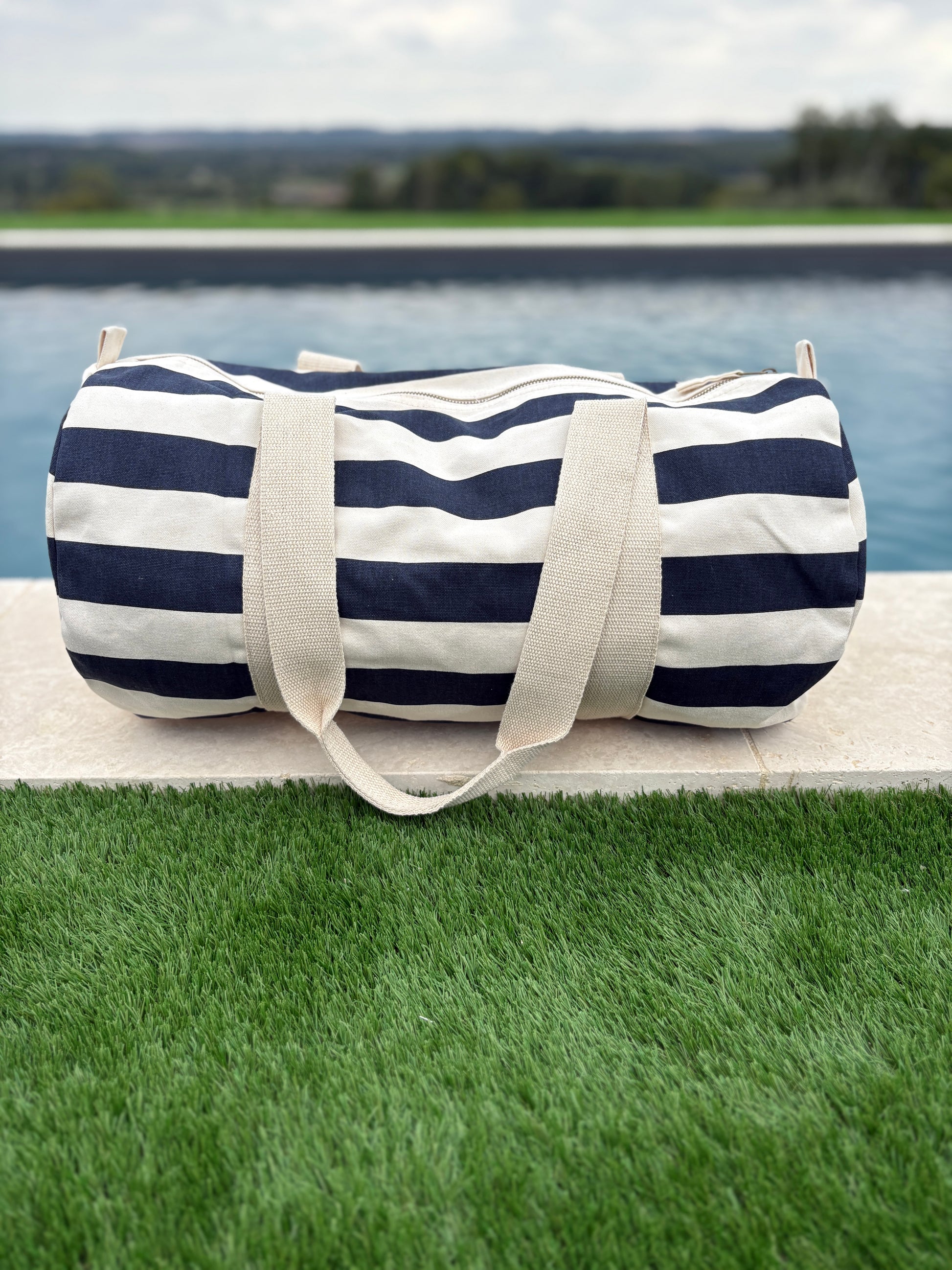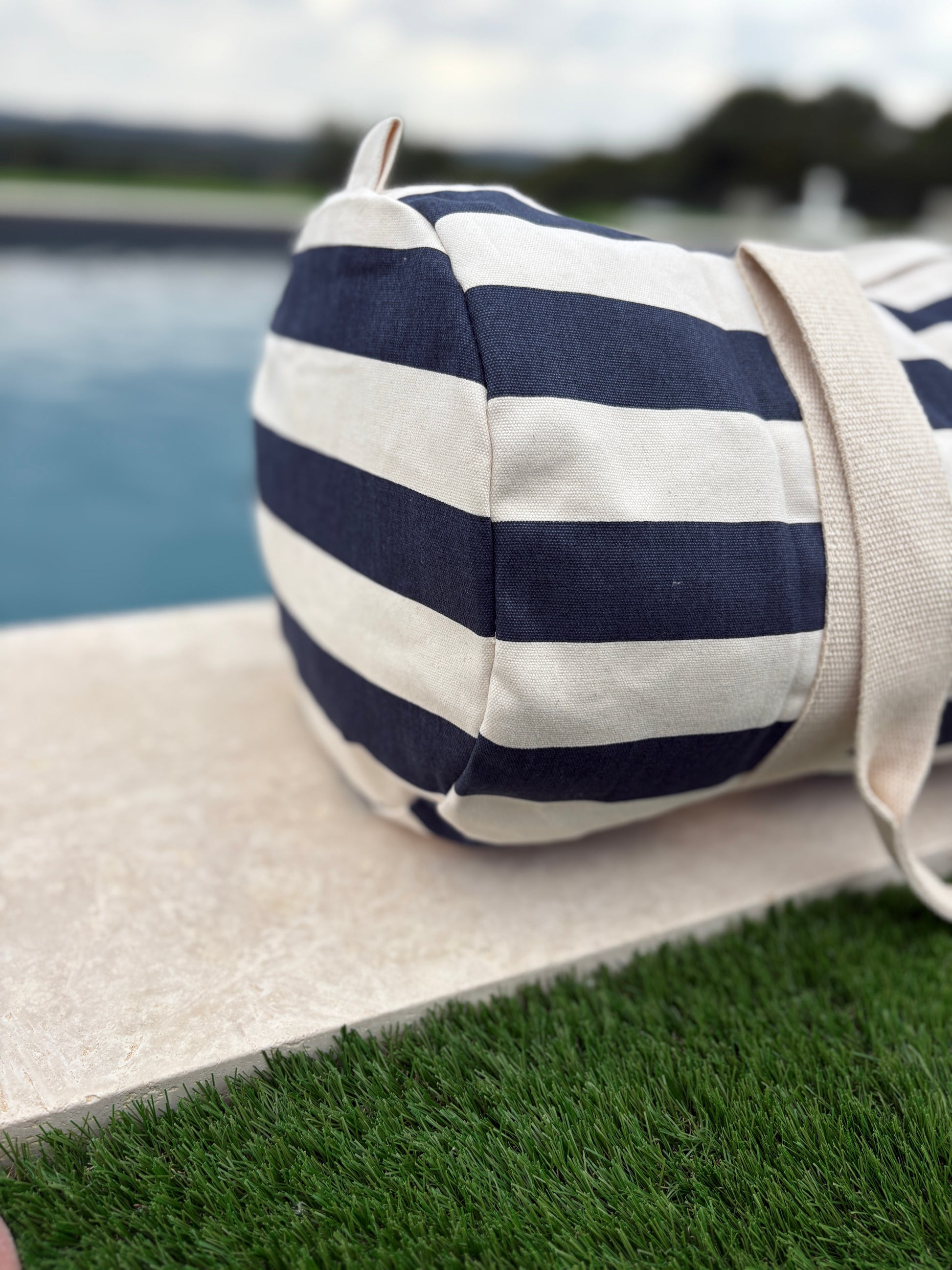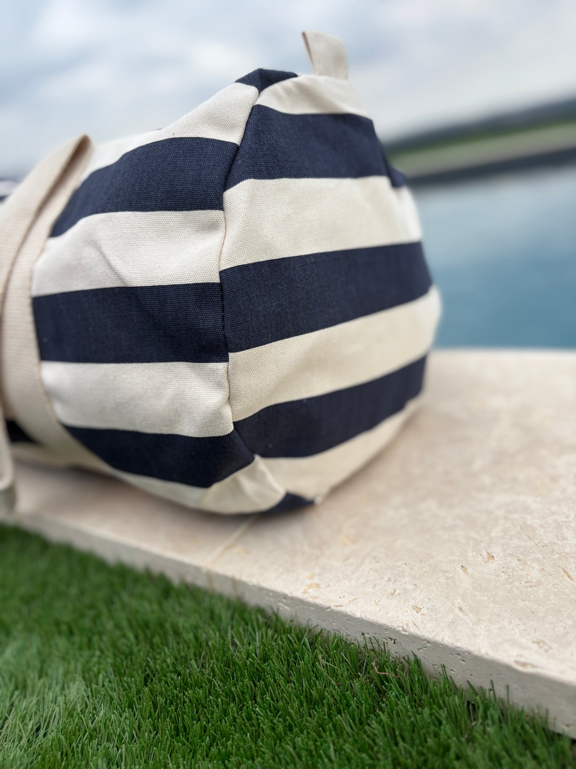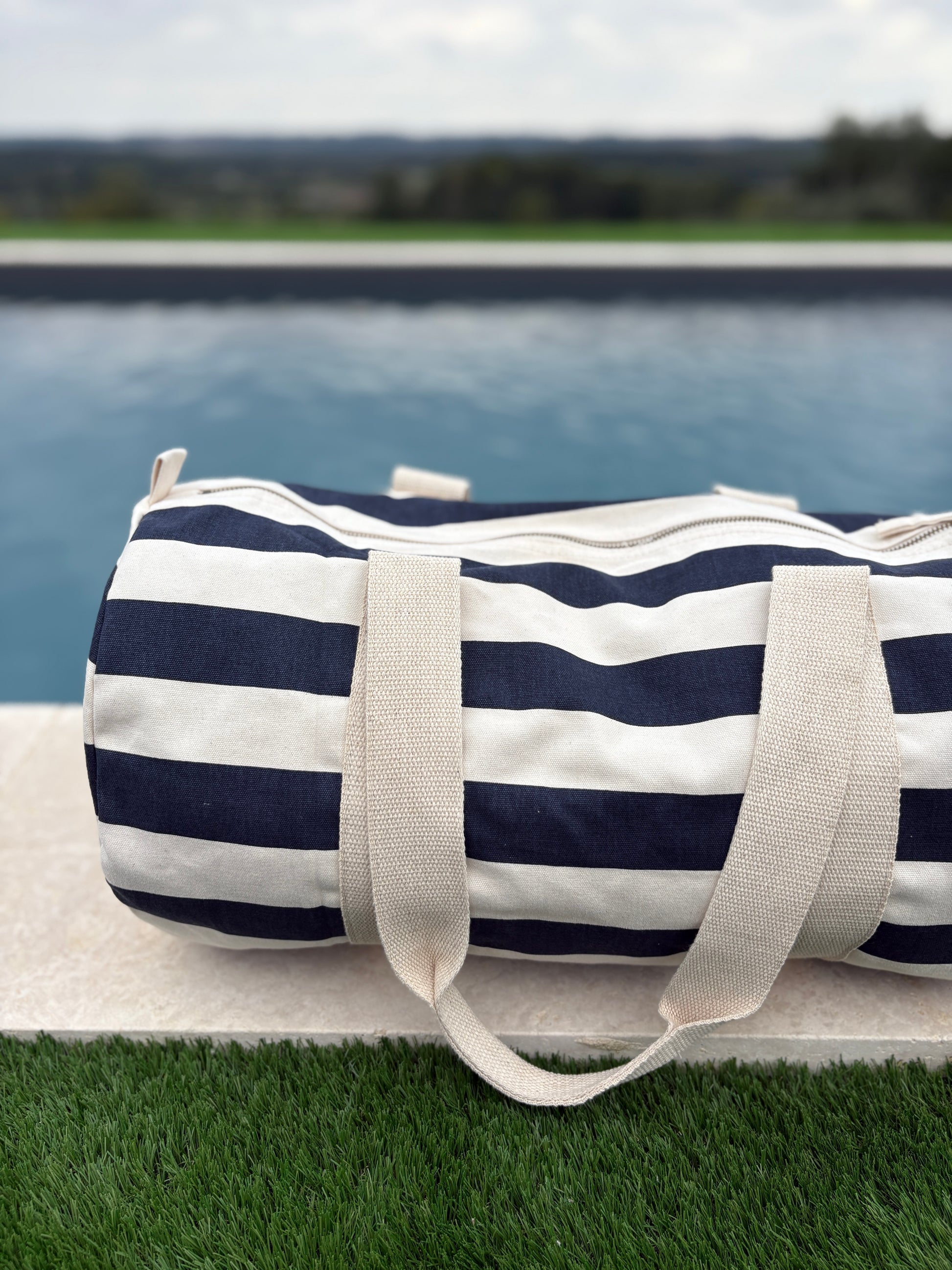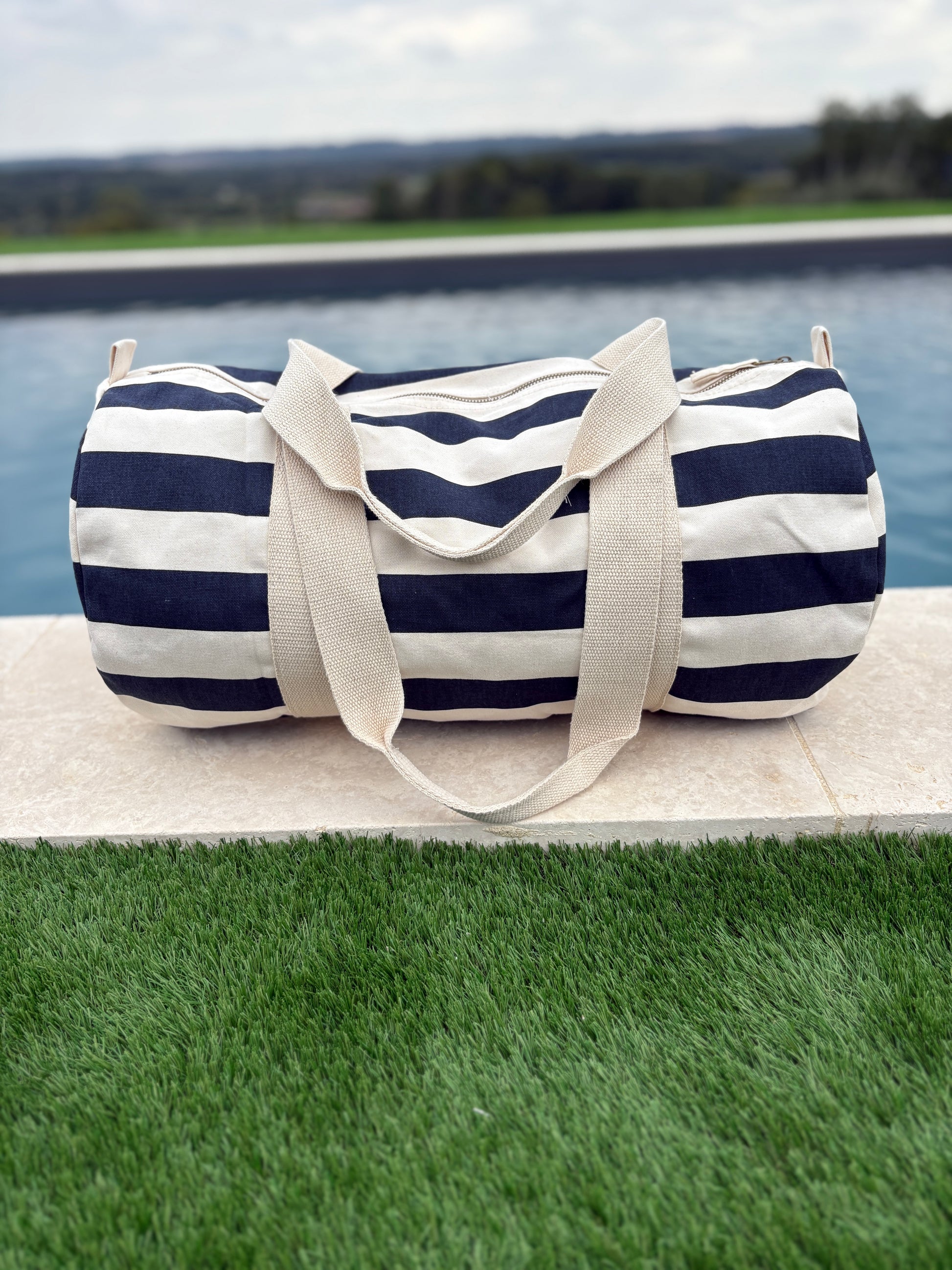 Le sac présente un motif rayé bleu foncé et blanc, conférant un style marin classique. Il est de forme cylindrique avec un design spacieux. Les poignées sont de couleur beige et paraissent confortables pour le transport. Le système de fermeture est une fermeture éclair située sur le dessus du sac, permettant un accès facile au contenu.