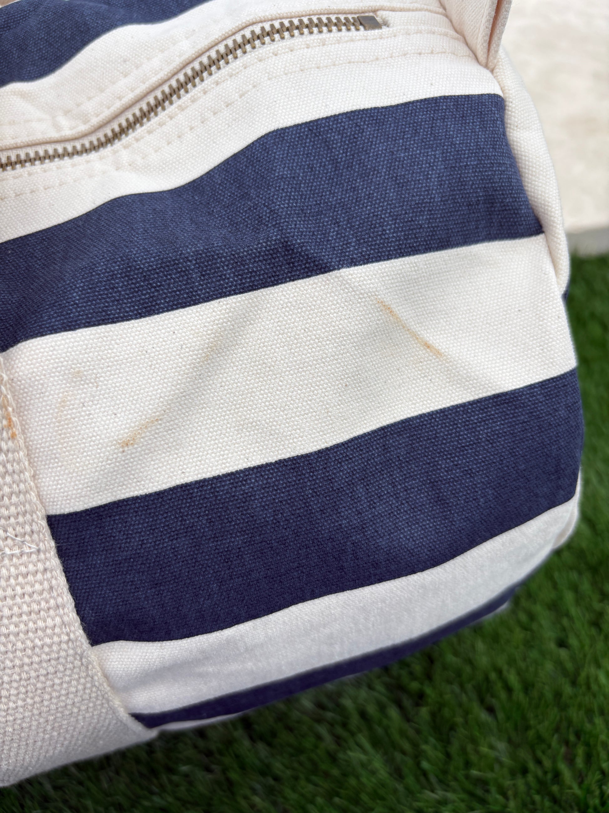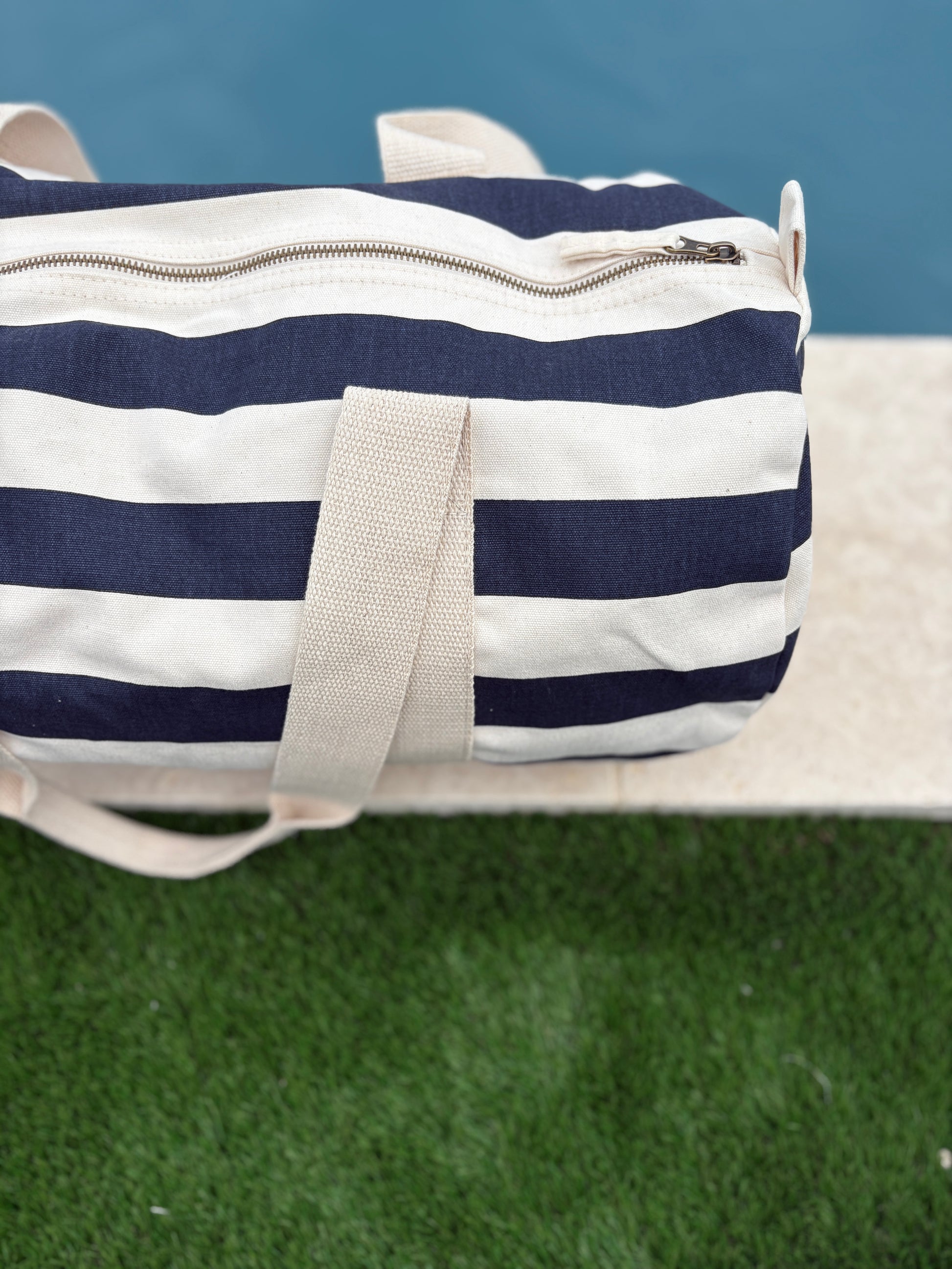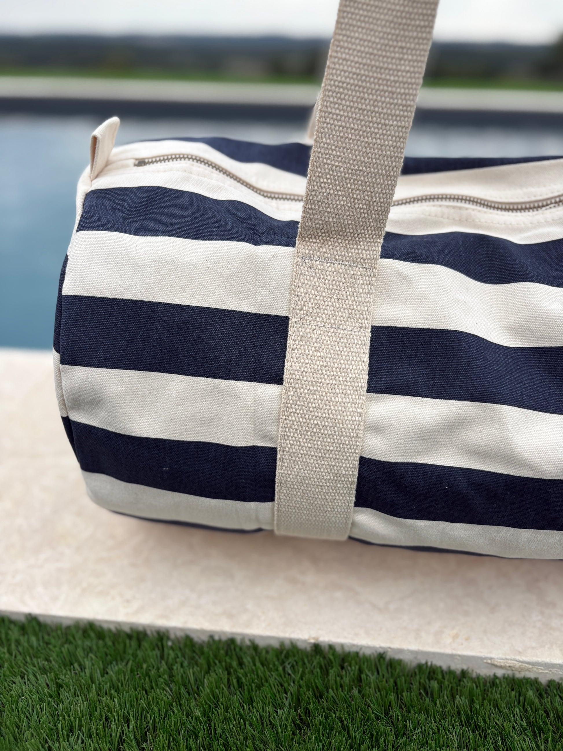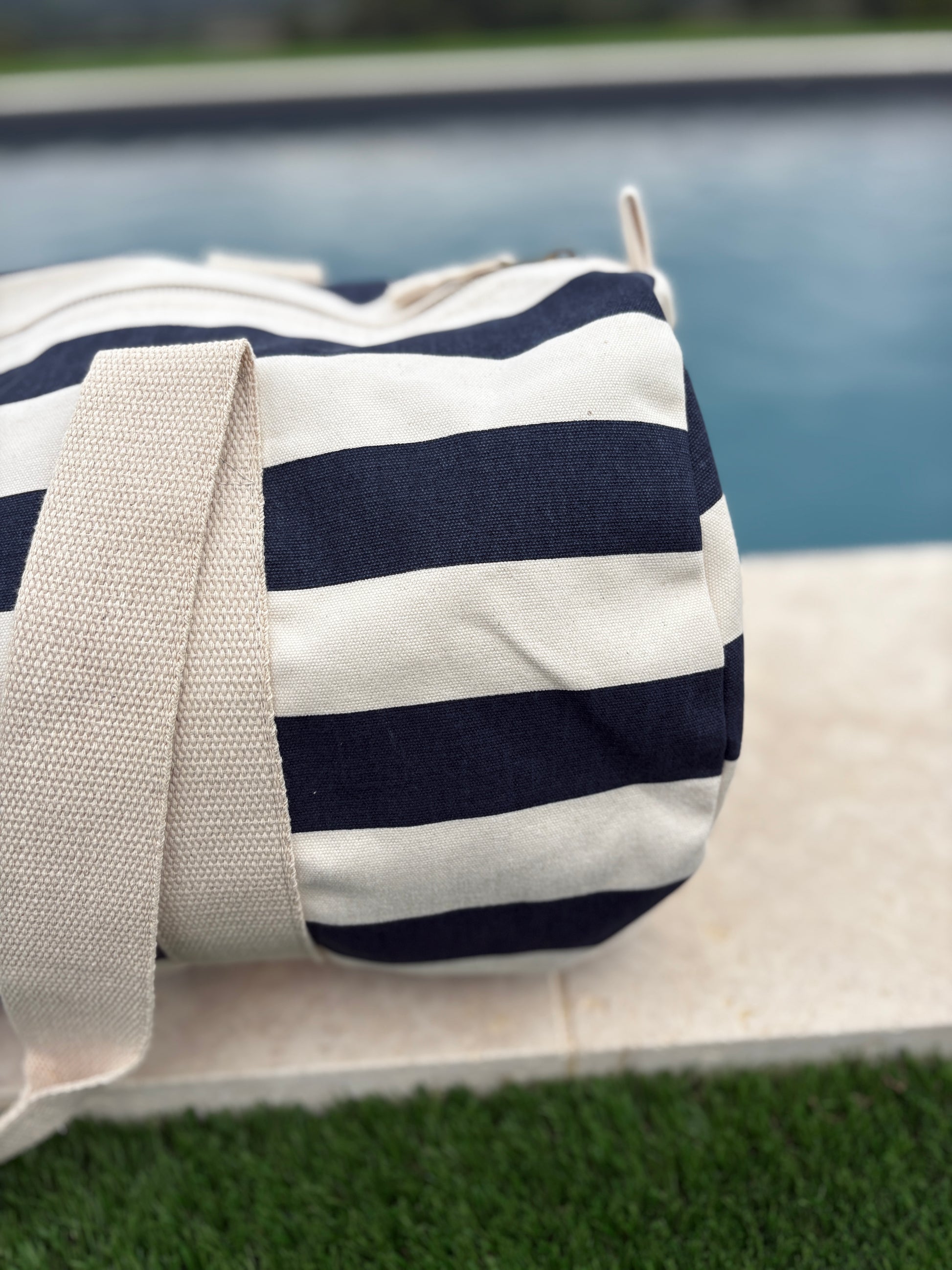 Le sac présente un motif rayé bleu foncé et blanc, conférant un style marin classique. Il est de forme cylindrique avec un design spacieux. Les poignées sont de couleur beige et paraissent confortables pour le transport. Le système de fermeture est une fermeture éclair située sur le dessus du sac, permettant un accès facile au contenu.