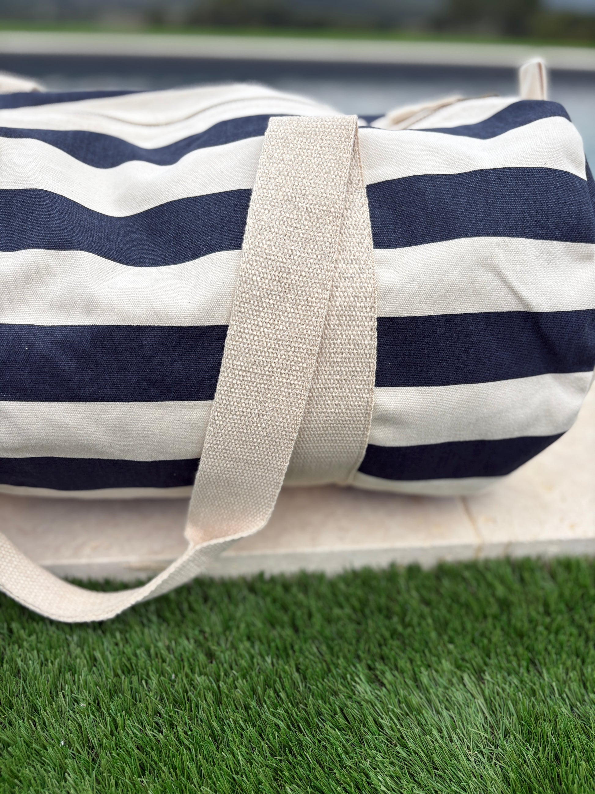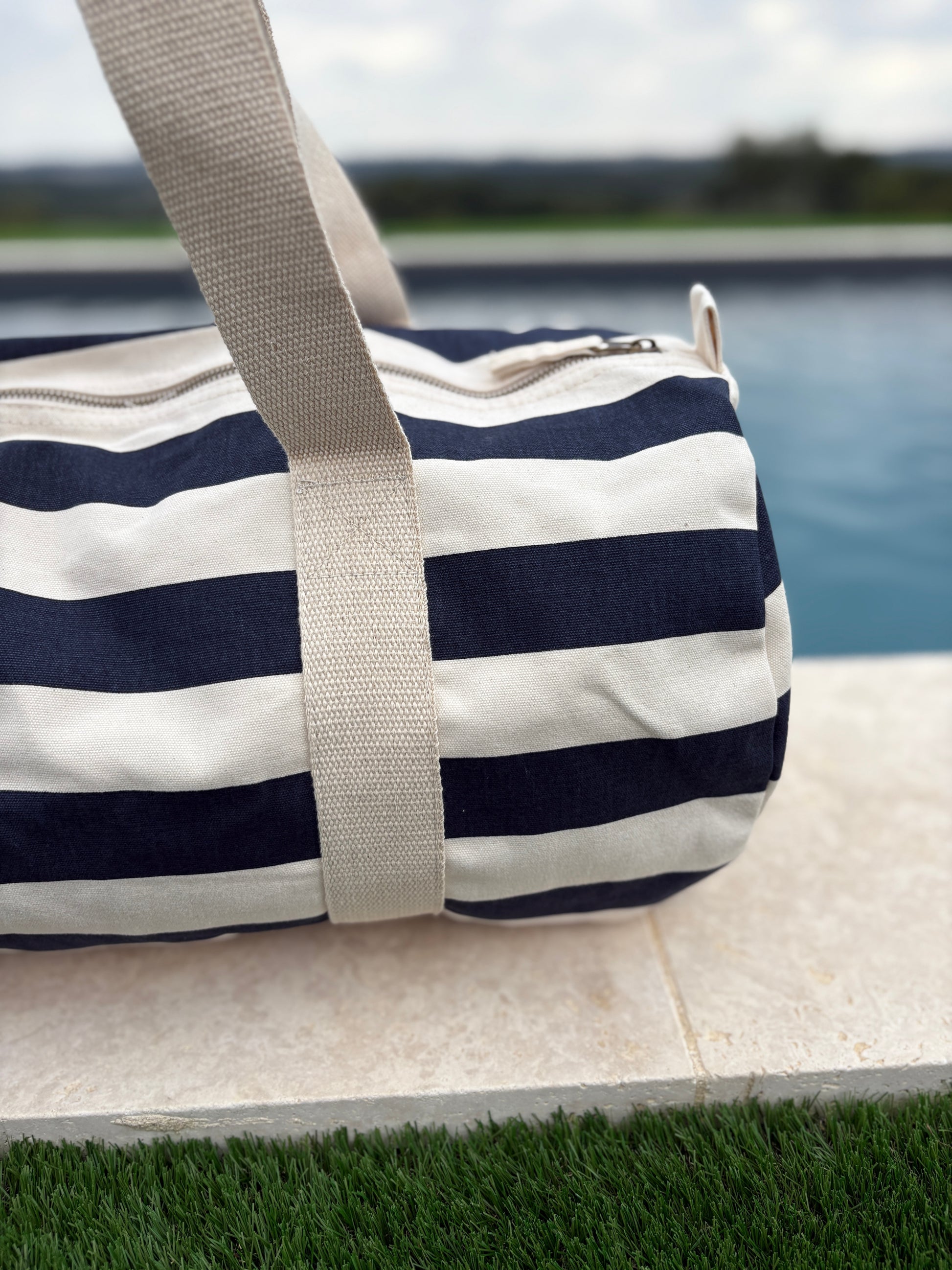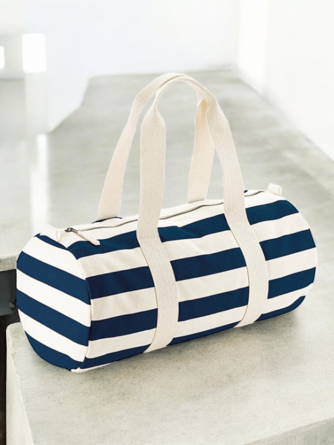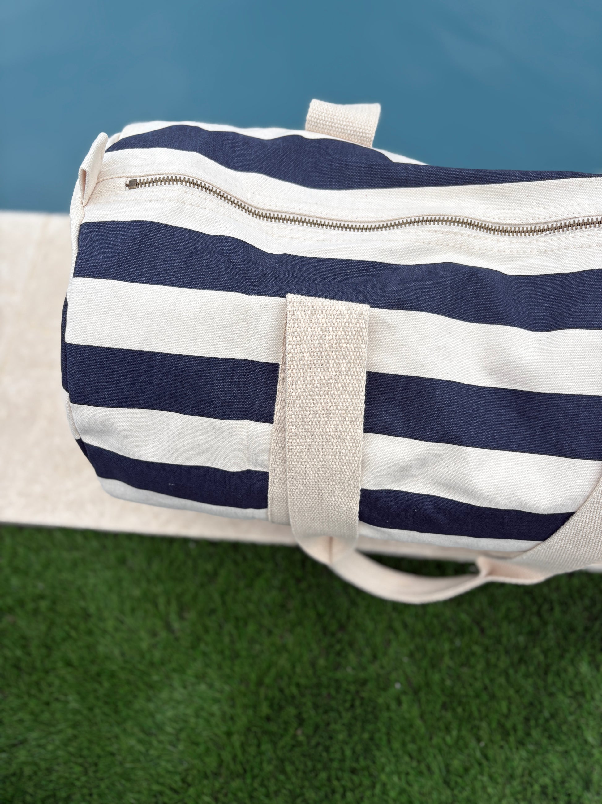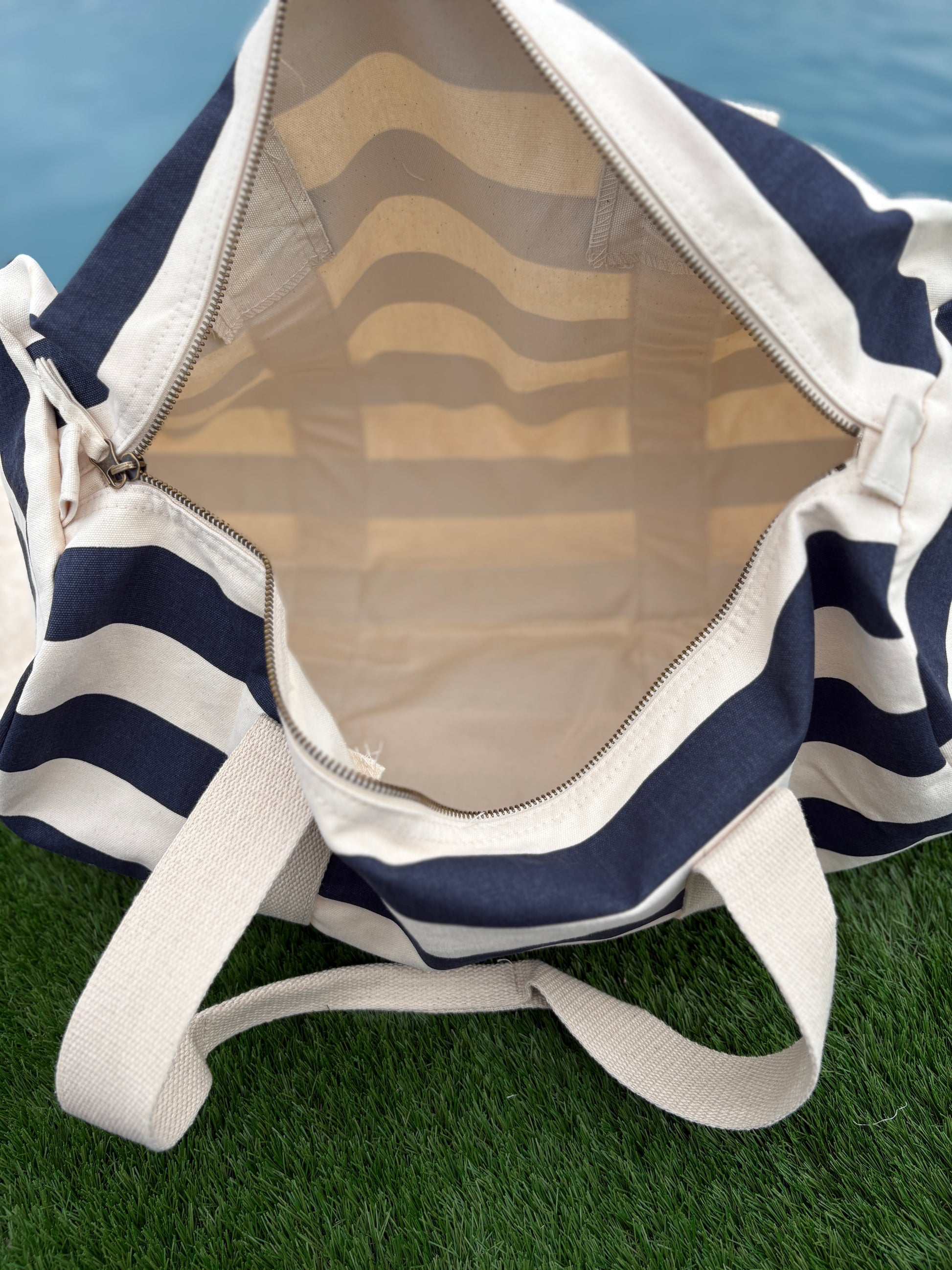 Le sac présente un motif rayé bleu foncé et blanc, conférant un style marin classique. Il est de forme cylindrique avec un design spacieux. Les poignées sont de couleur beige et paraissent confortables pour le transport. Le système de fermeture est une fermeture éclair située sur le dessus du sac, permettant un accès facile au contenu.