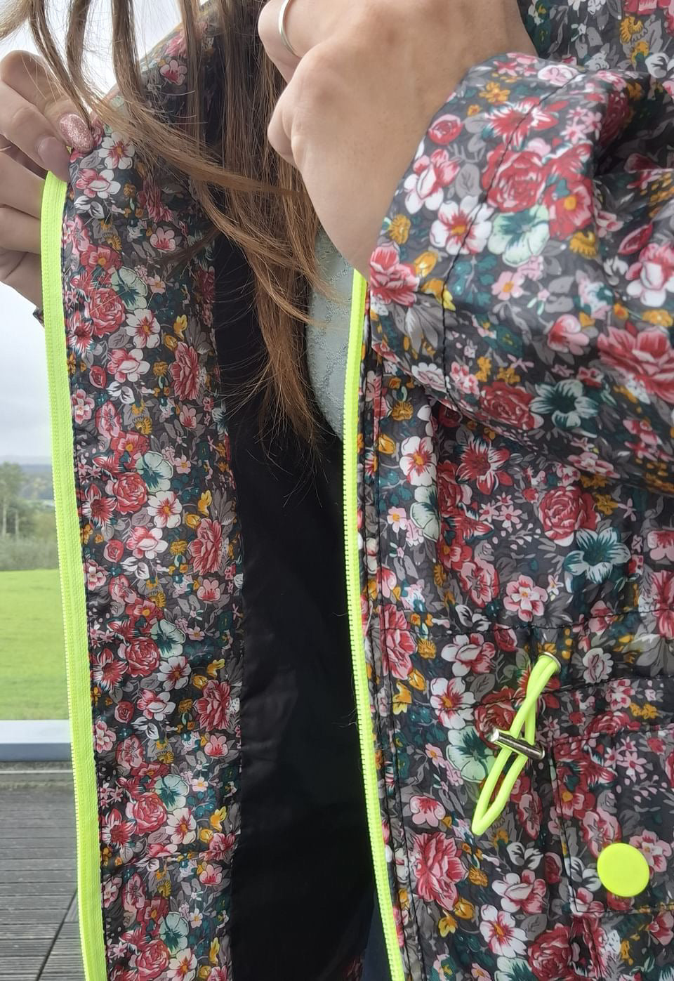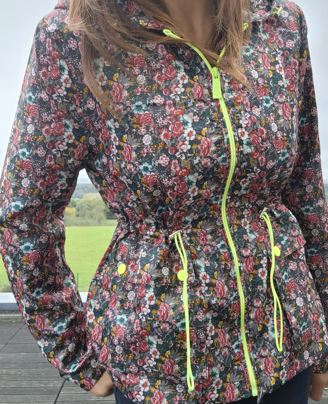 Cette veste arbore un imprimé floral multicolore sur l'ensemble du tissu.