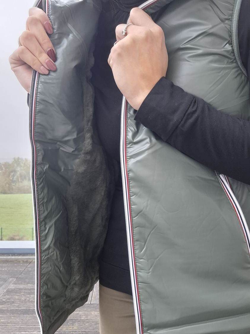 La veste sans manche est munie d'une capuche doublée pour plus de chaleur.