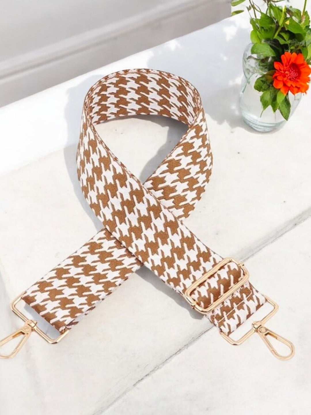 La sangle présente un motif pied-de-poule en marron et blanc. Elle est agrémentée de boucles réglables dorées, permettant d'ajuster facilement la longueur selon vos besoins. Les extrémités de la sangle sont dotées de crochets dorés bien solides pour une fixation sécurisée à votre sac.