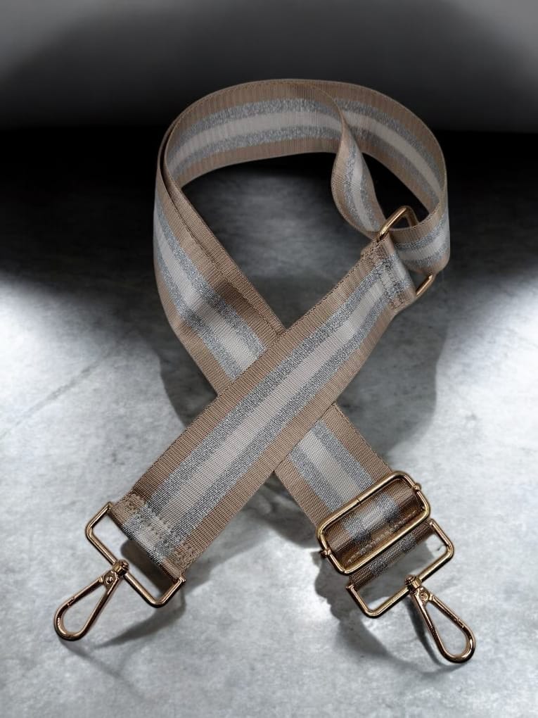 La sangle est large et présente des rayures de couleur taupe et grise pailletée qui se répètent tout au long de la sangle. Elle est équipée de crochets métalliques dorés à chaque extrémité, offrant robustesse et sécurité pour attacher à diverses poignées de sac. Les rayures sont d'une teinte subtile, conférant une élégance discrète à l'ensemble.