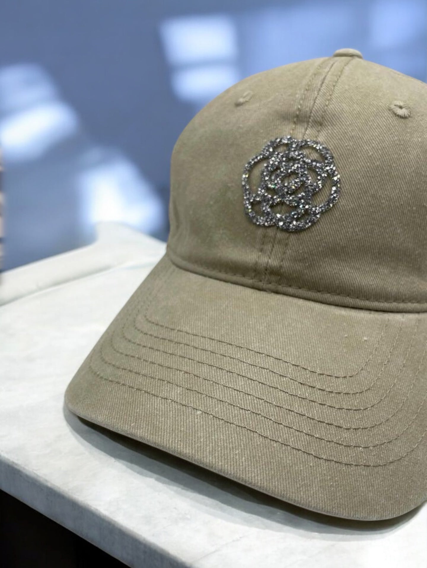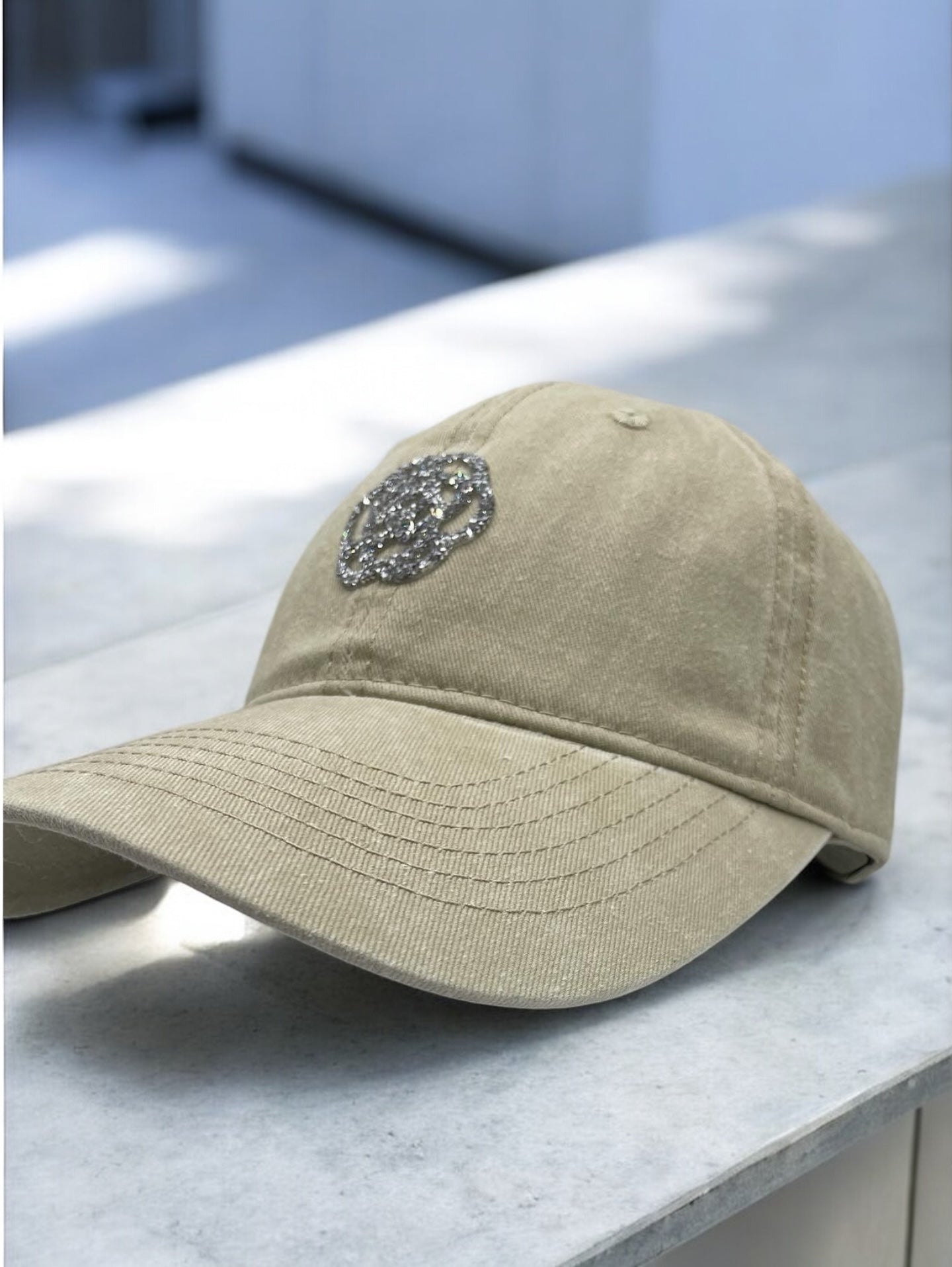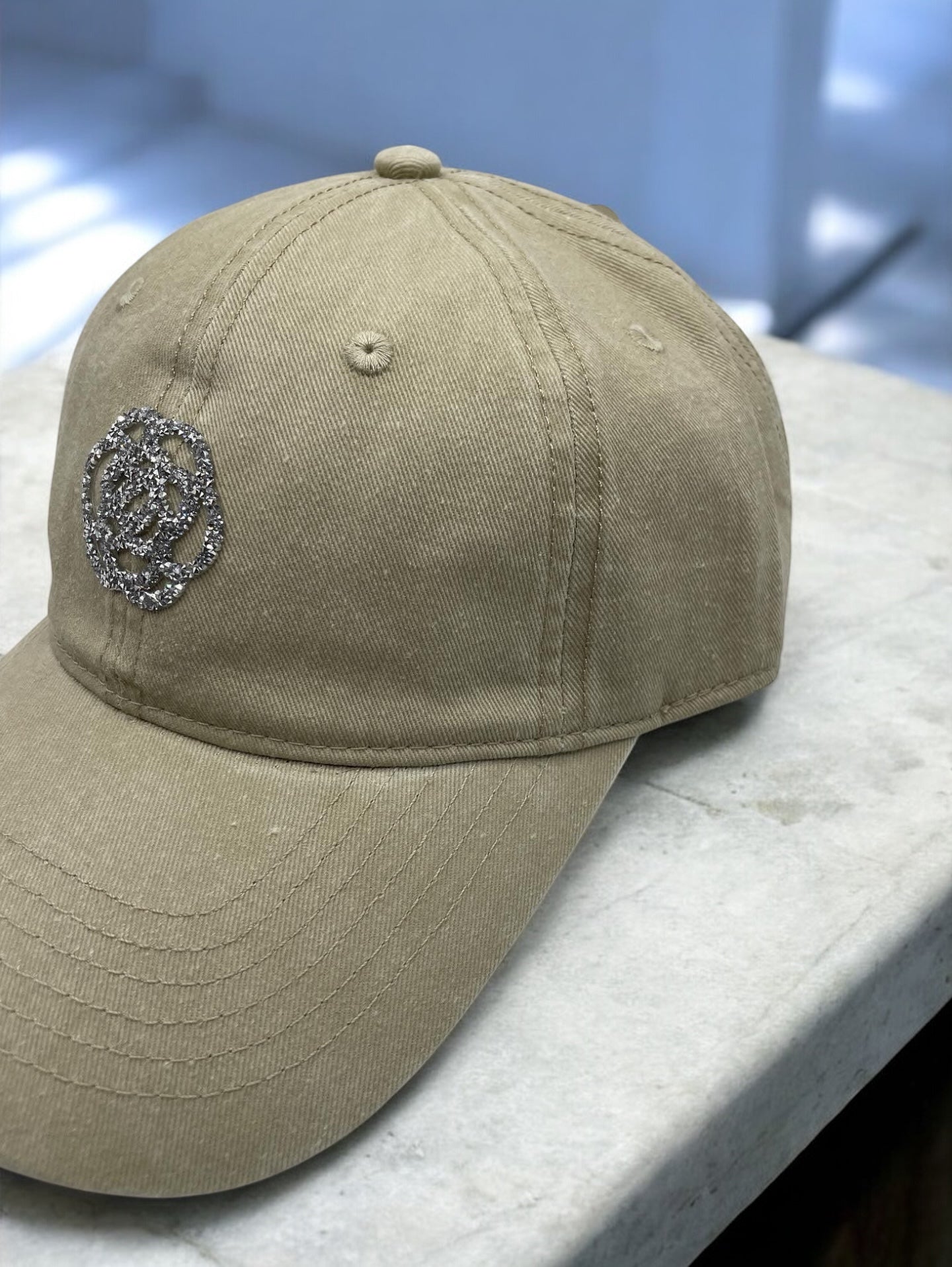 Cette casquette beige a un logo en strass argenté placé sur le devant.