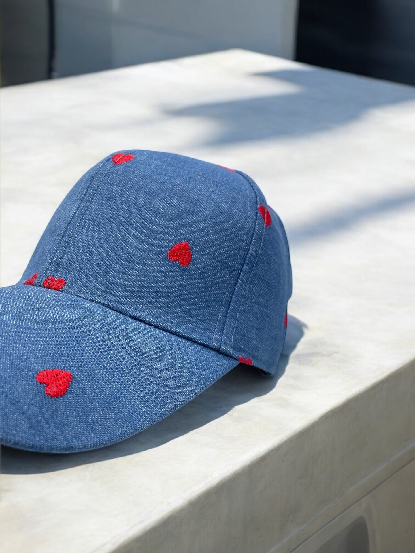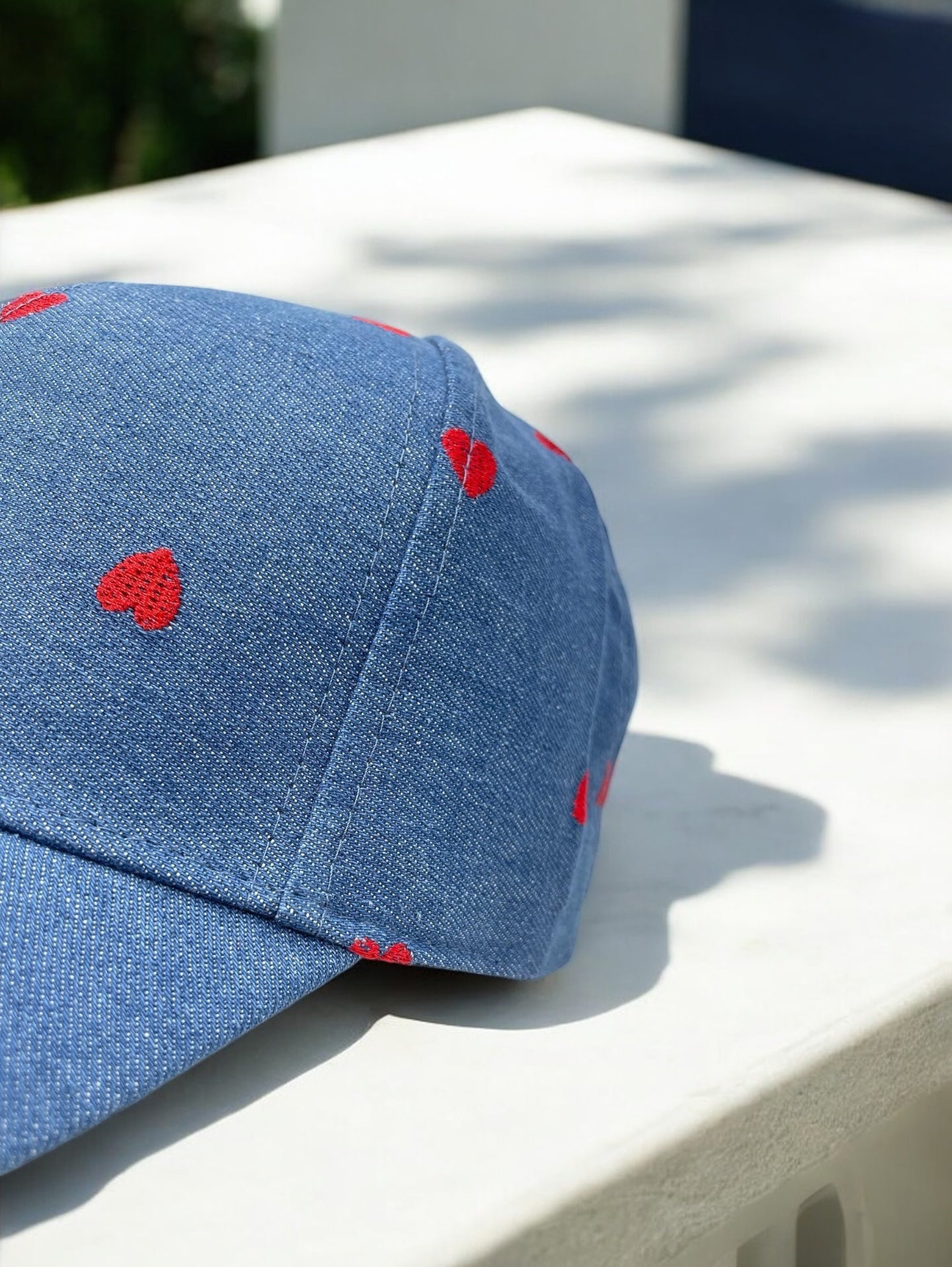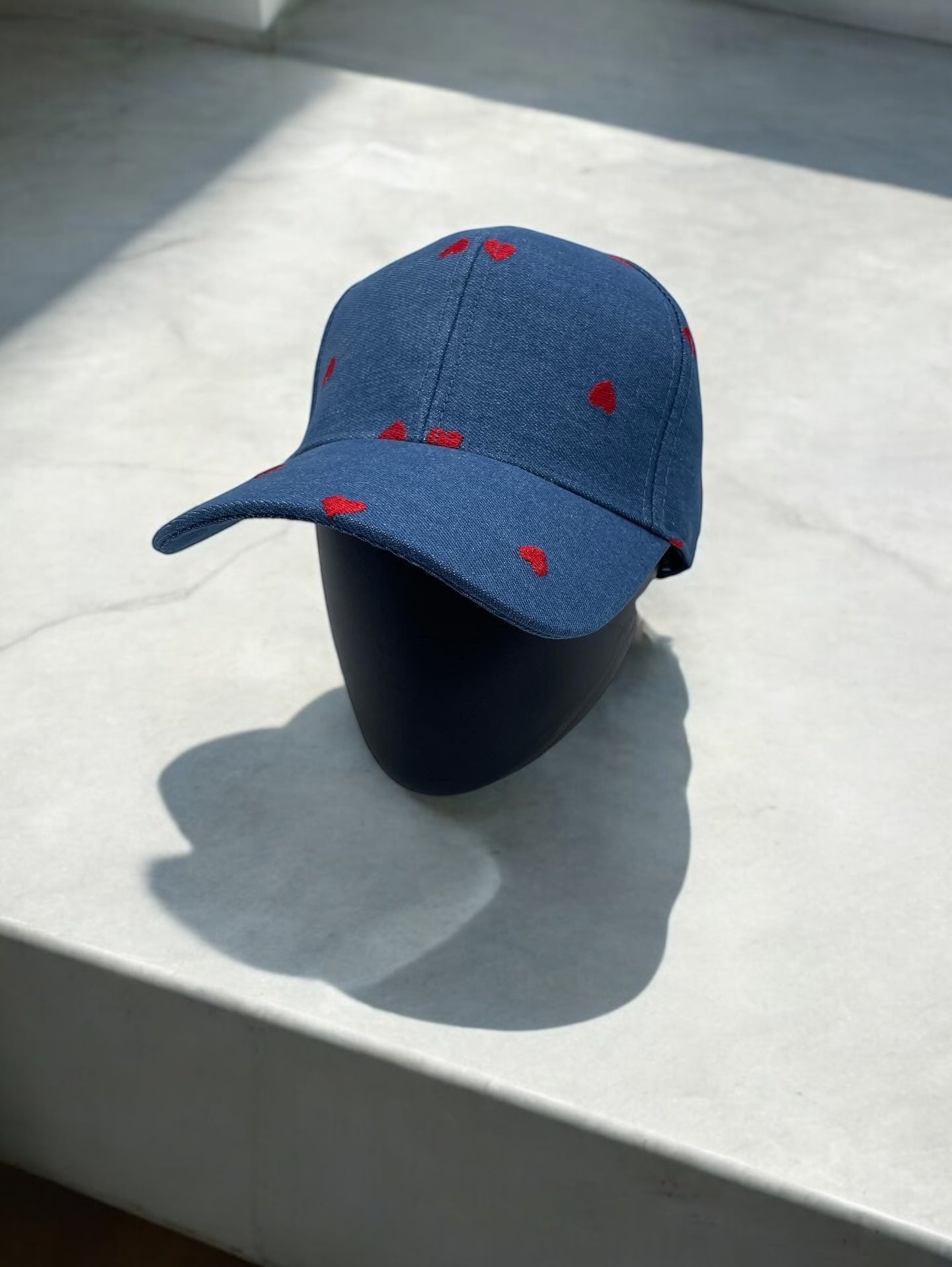 Cette casquette est fabriquée en jean bleu. Elle comporte plusieurs petits cœurs rouges brodés sur toute la surface.