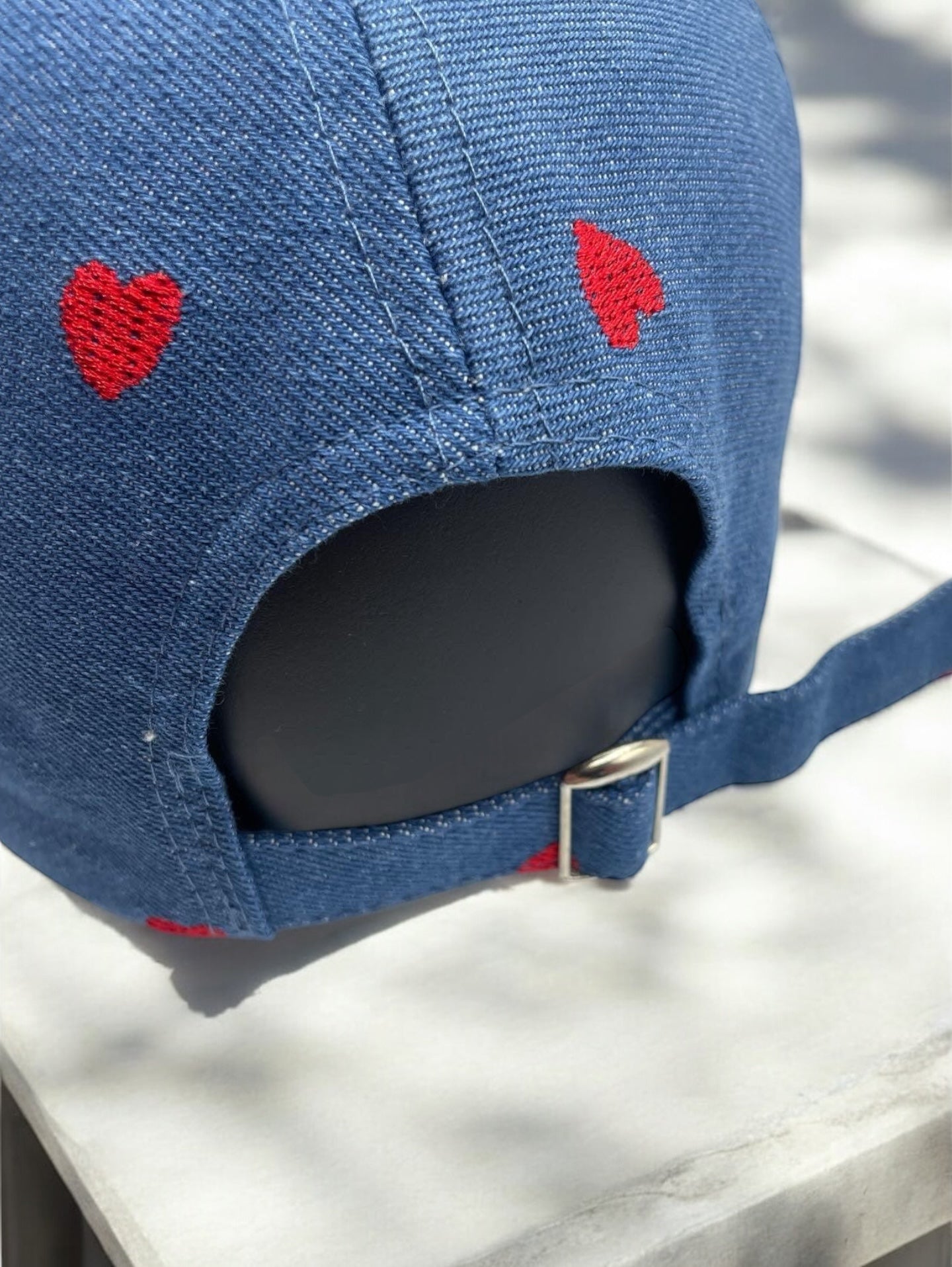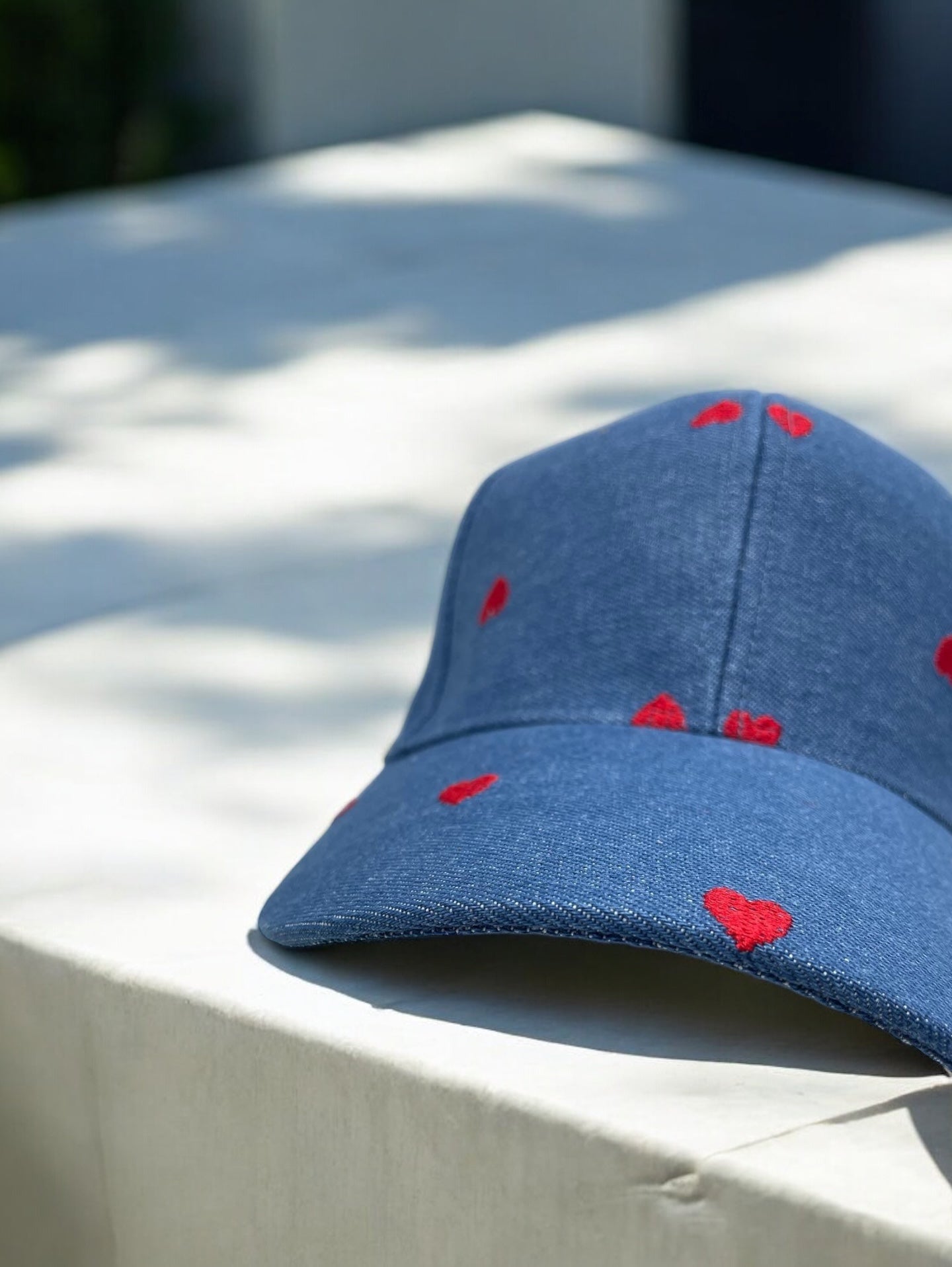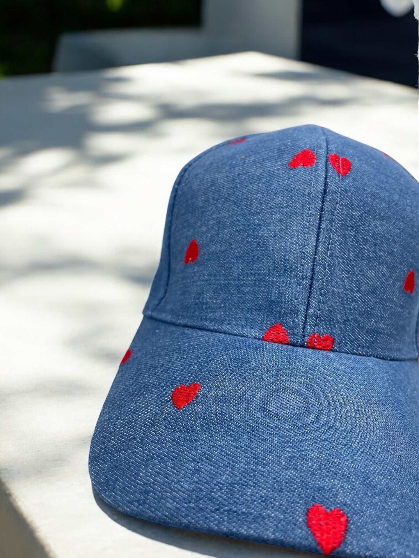 Cette casquette est fabriquée en jean bleu. Elle comporte plusieurs petits cœurs rouges brodés sur toute la surface.
