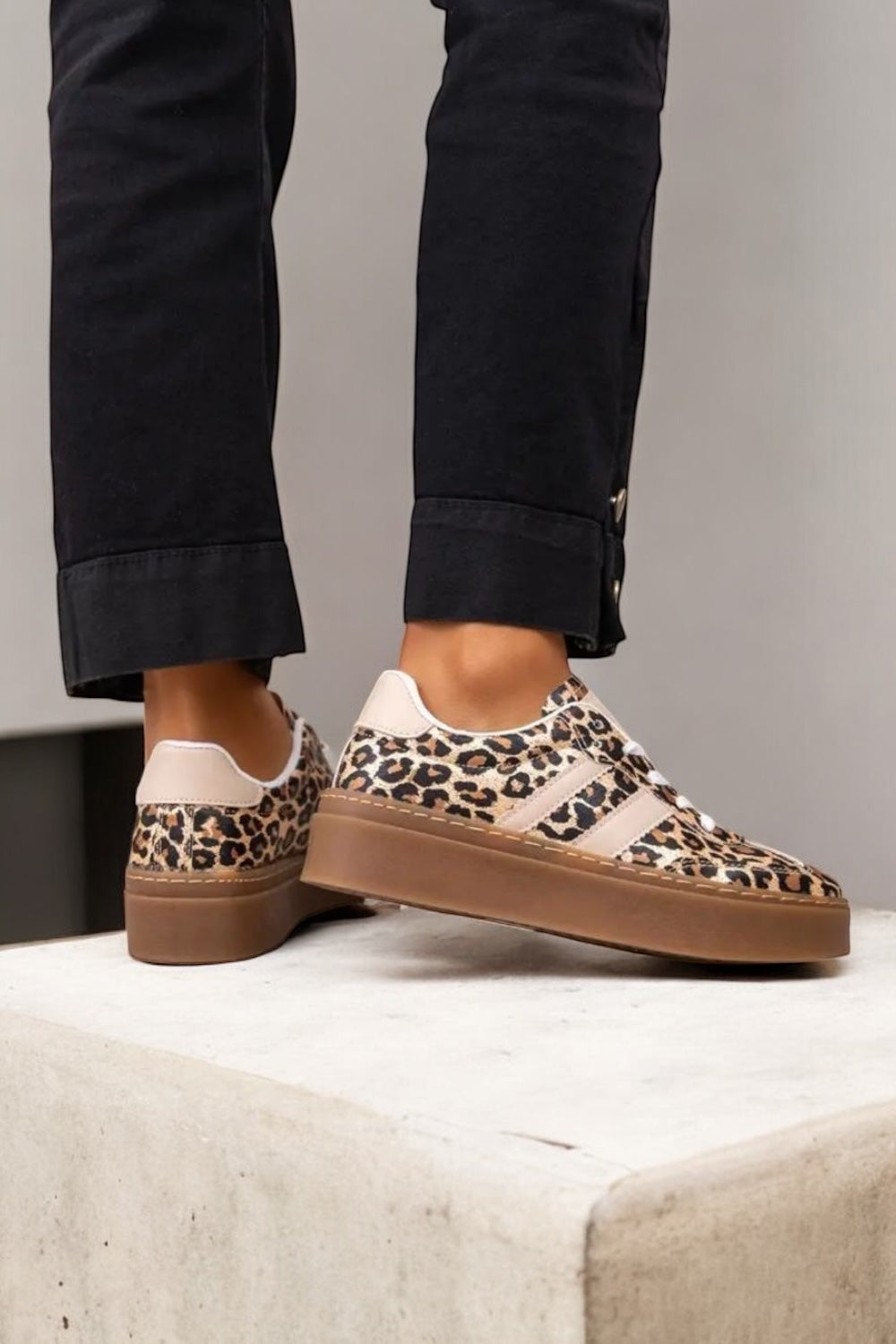 Les sneakers sont principalement ornées d’un motifs léopard avec deux bandes beige sur le côté. Elles possèdent une semelle en caoutchouc blanche qui offre un contraste subtil mais élégant.