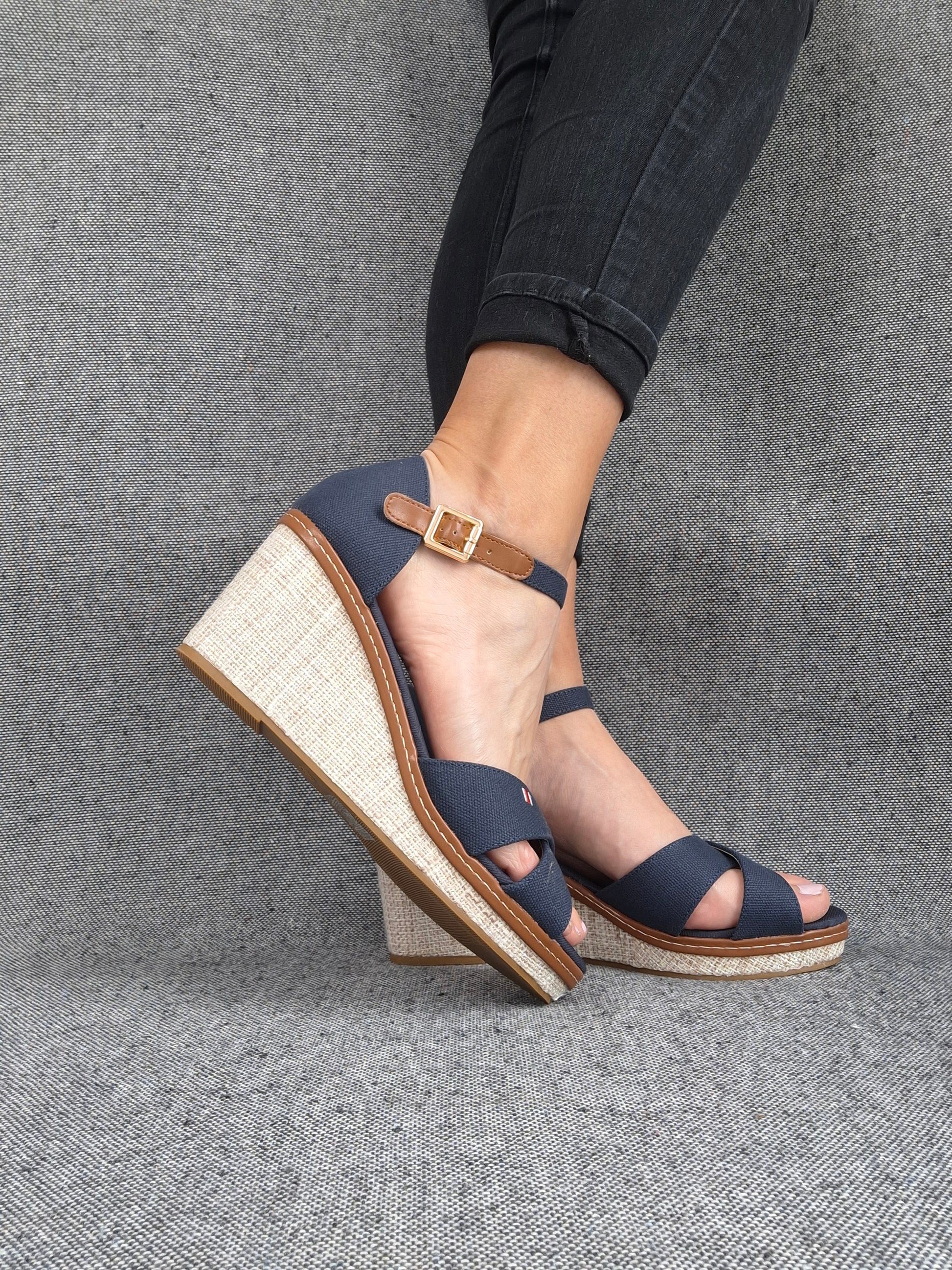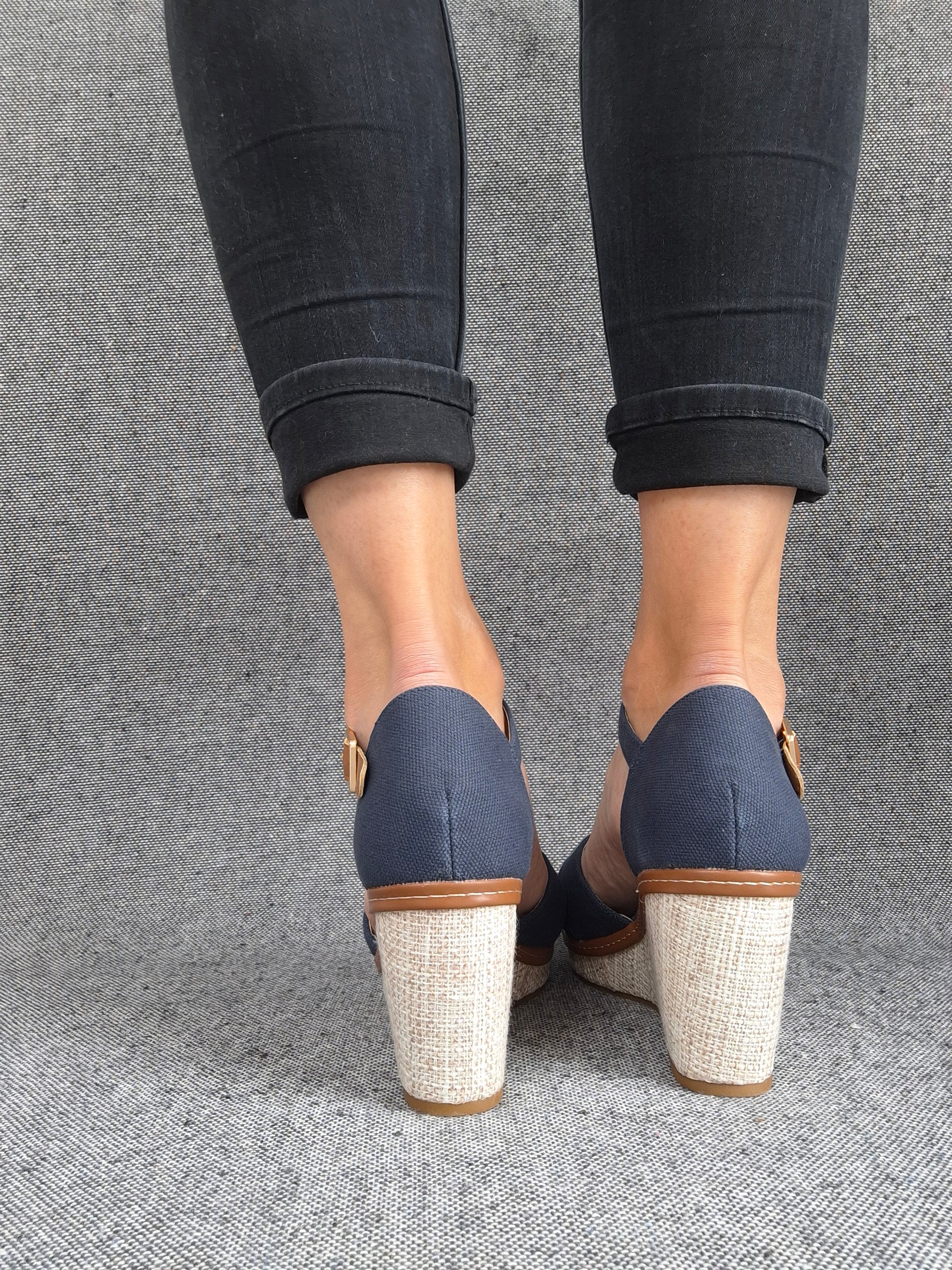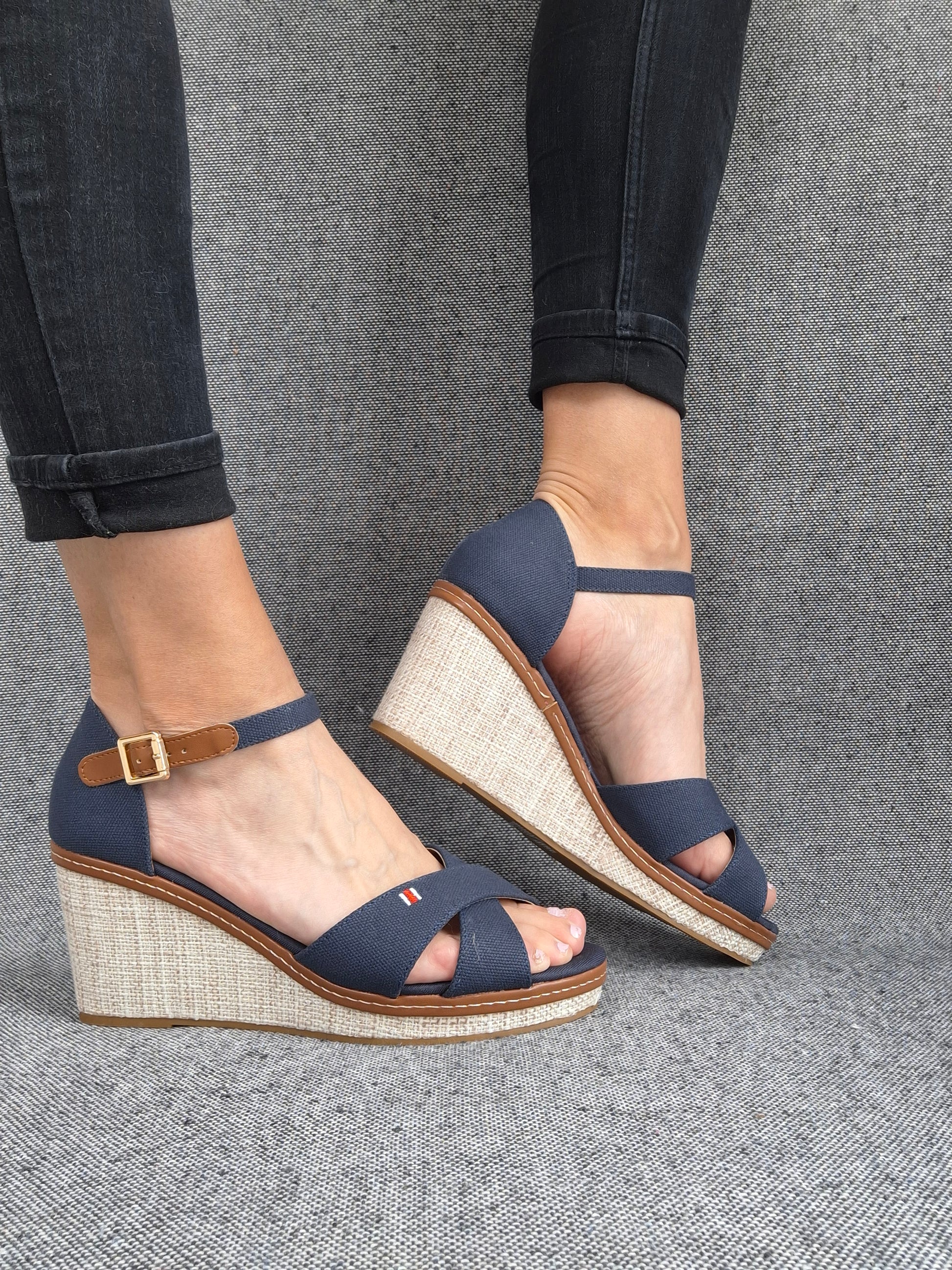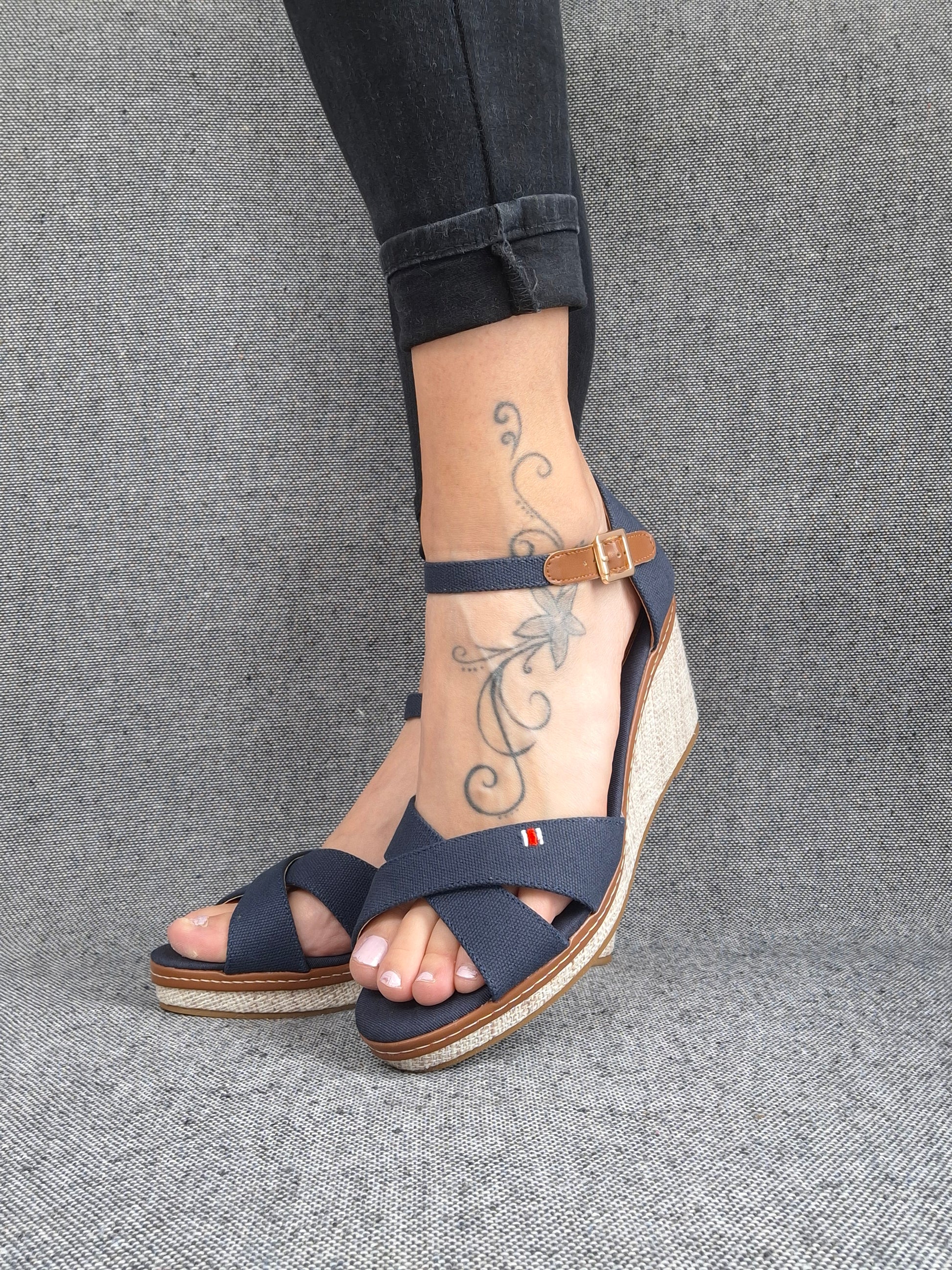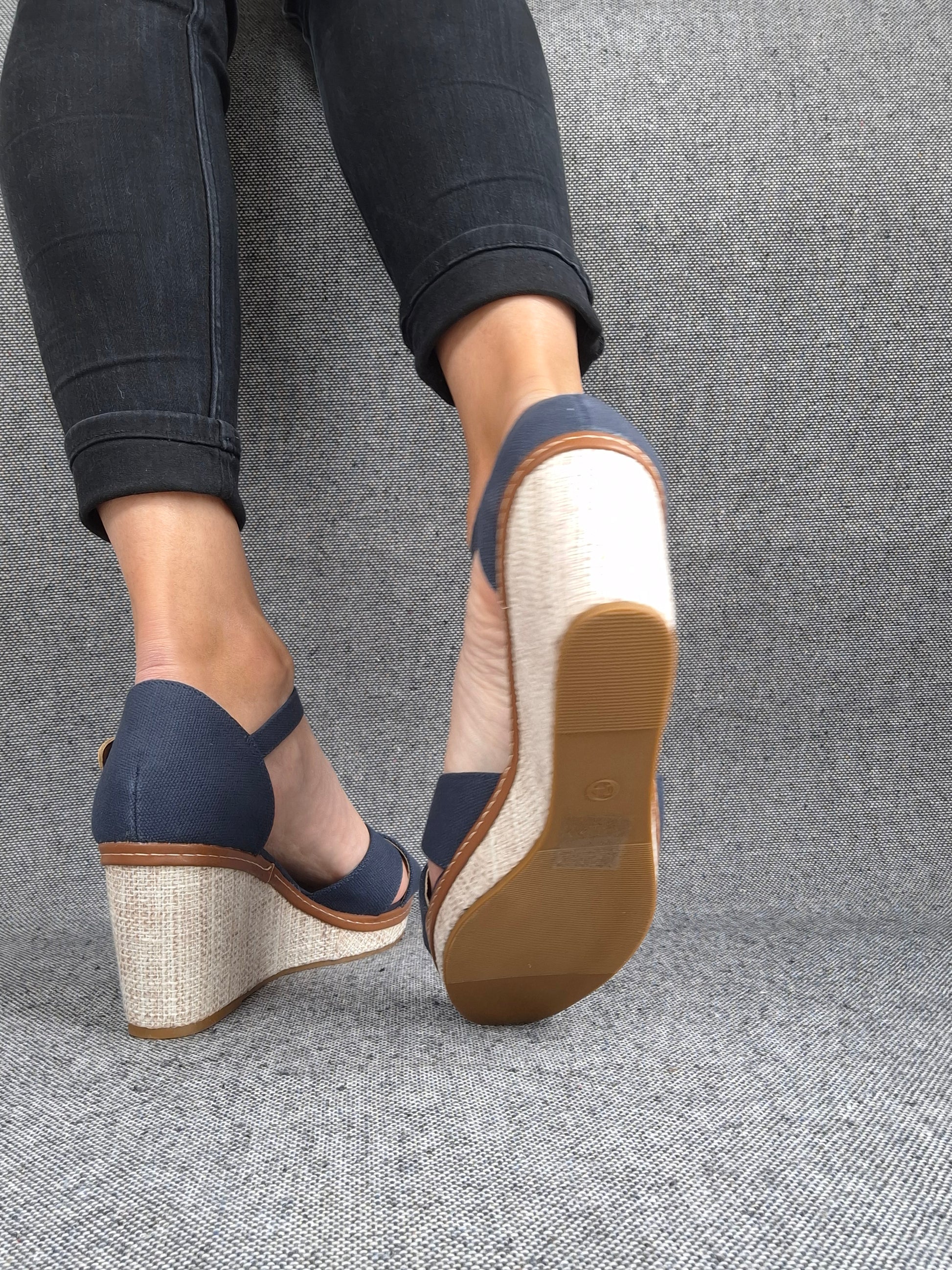 Chaussures sandales compensées tissu à lanières bleu marine semelle beige