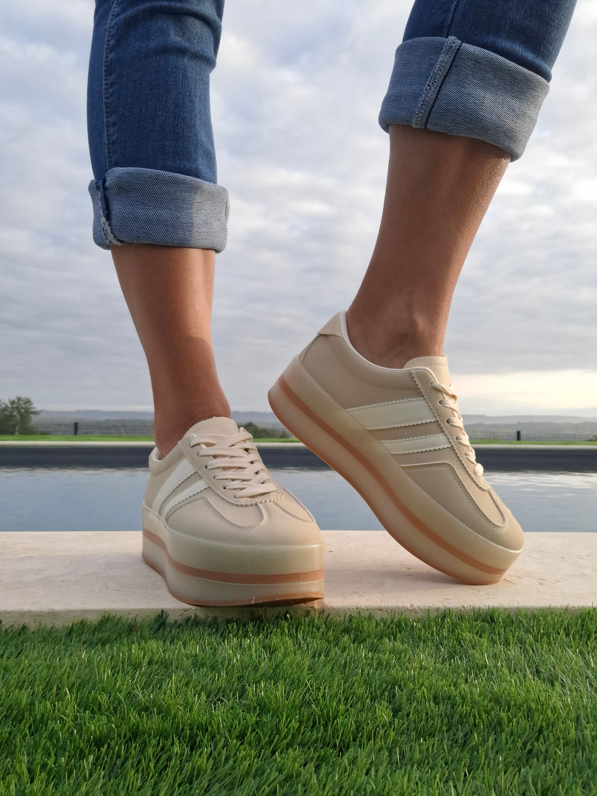 Ces chaussures sont de couleur beige avec deux bandes blanches sur les côtés. Elles possèdent une plateforme épaisse qui offre une allure moderne et audacieuse. Les lacets sont également beiges, se fondant harmonieusement avec le reste de la chaussure. La semelle est de couleur beige clair avec une fine ligne marron près de la base.