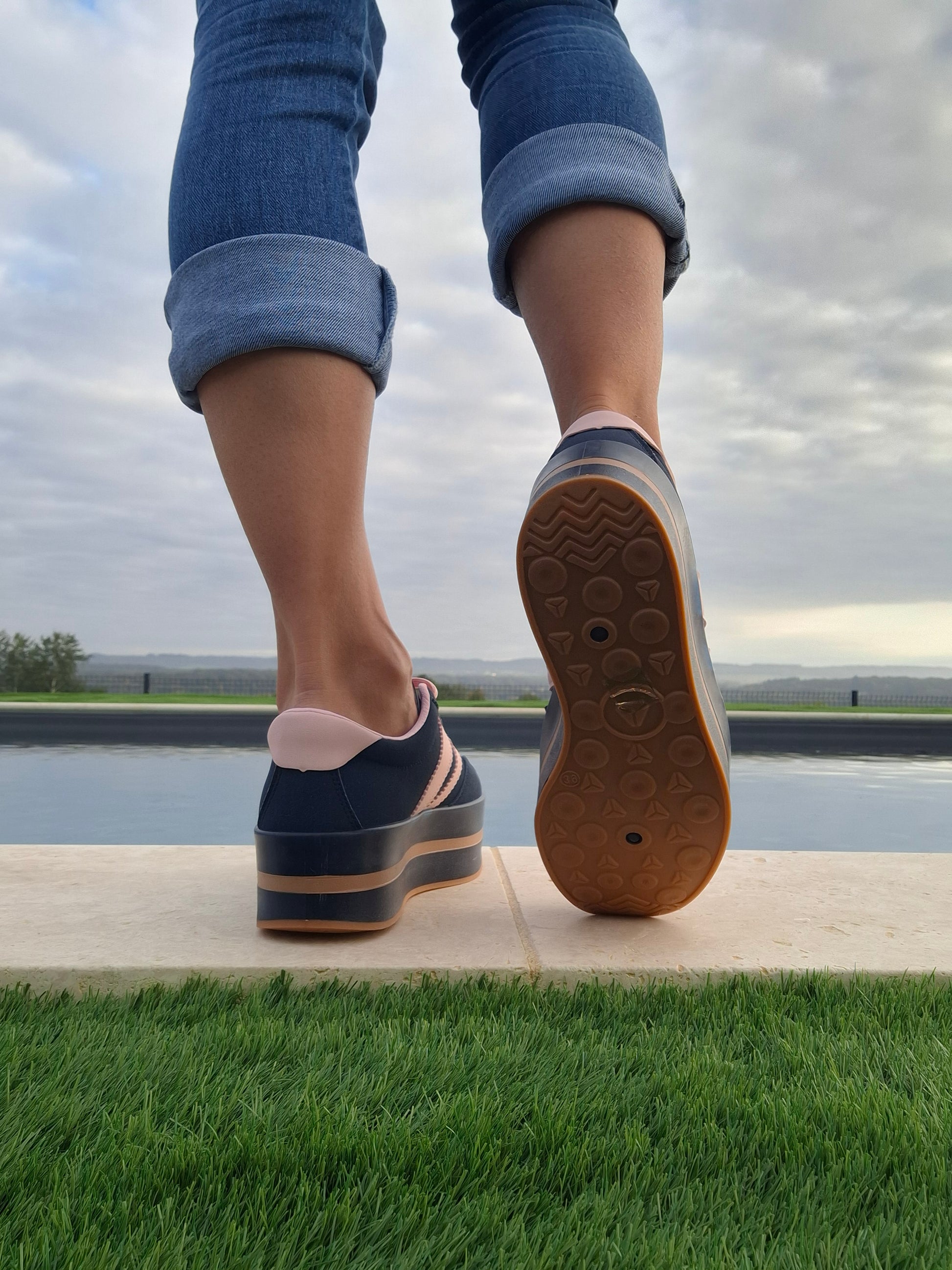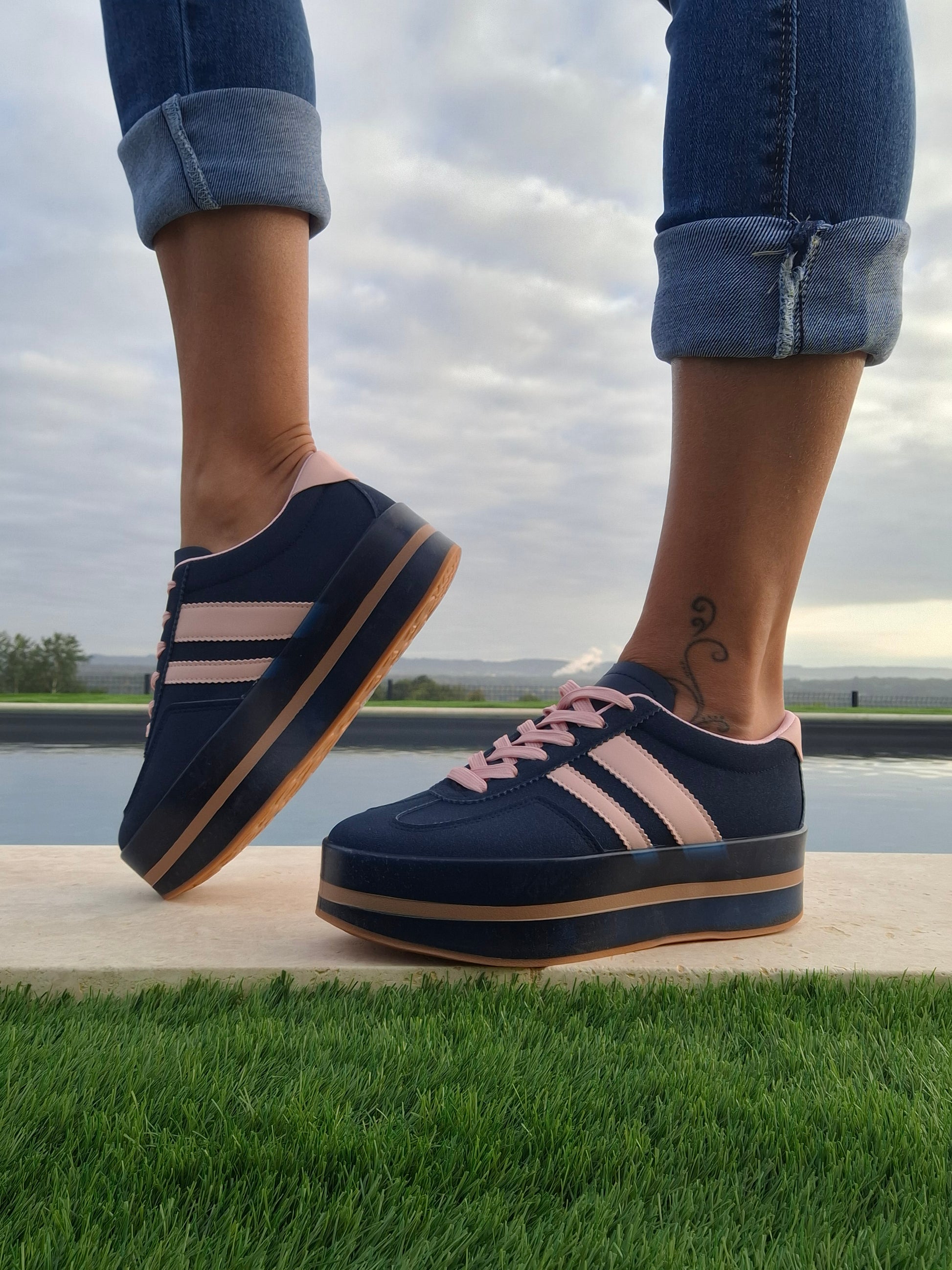 Chaussures baskets basses compensées bleu marine avec bandes roses style sneakers campus