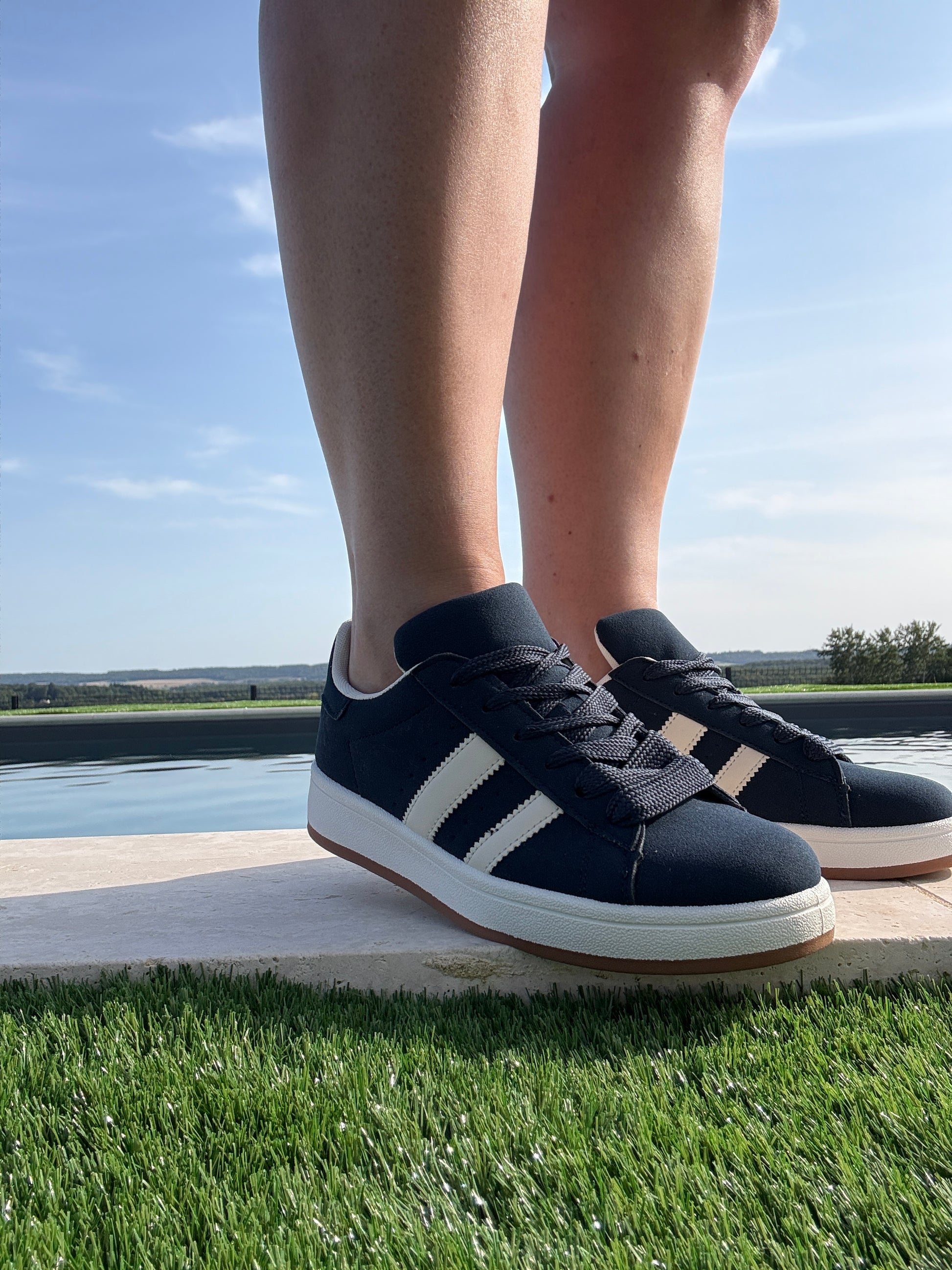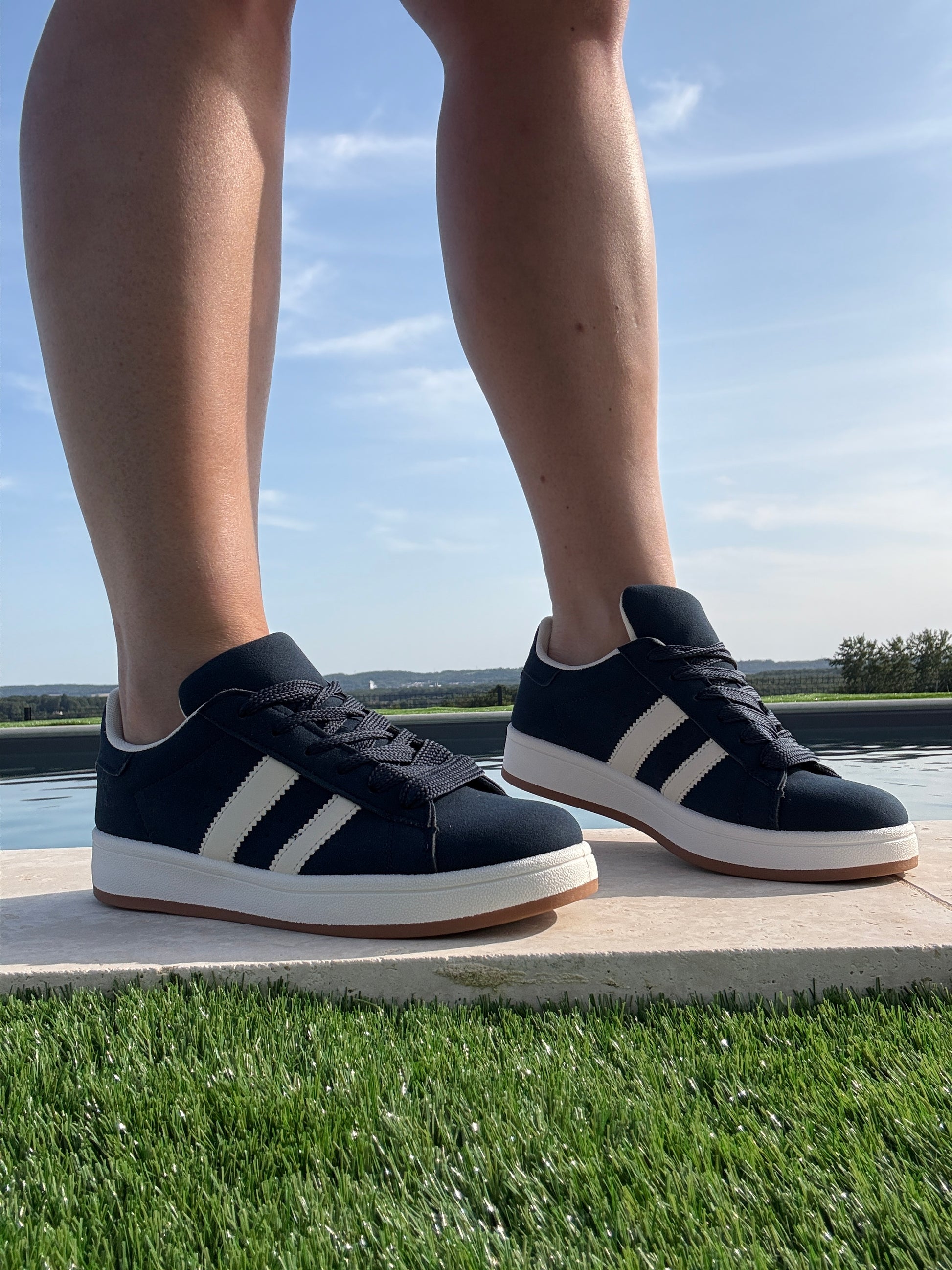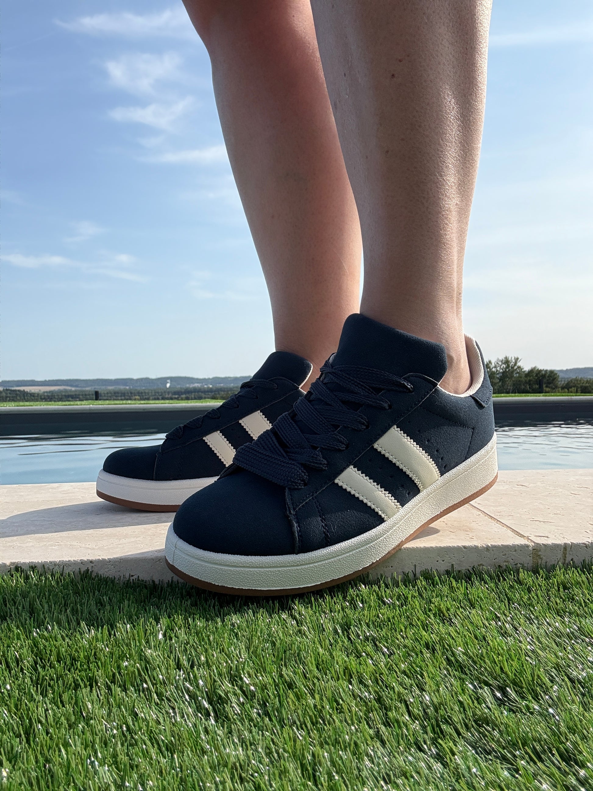 Cette paire de baskets présente un corps principal bleu marine accentué par deux rayures blanches distinctives sur le côté. La semelle intermédiaire est blanche, ajoutant une touche contrastante lumineuse, tandis que la semelle extérieure est de couleur marron claire. Les lacets bleu marine apportent un aspect classique et épuré à ces chaussures.