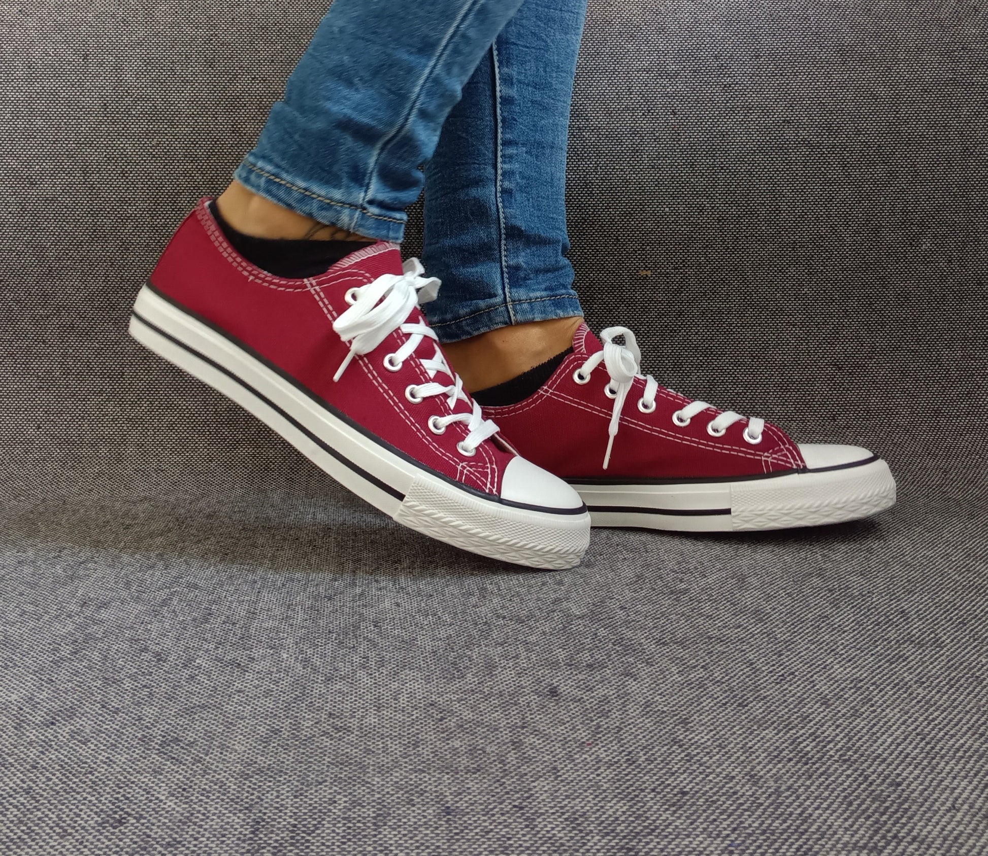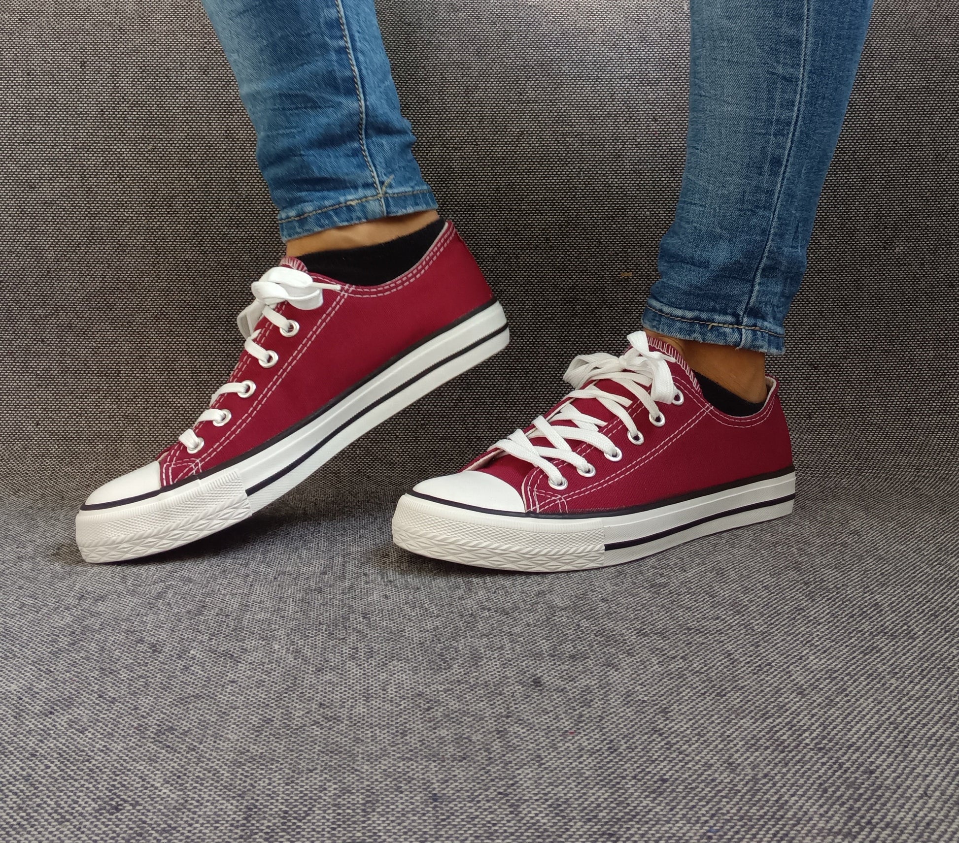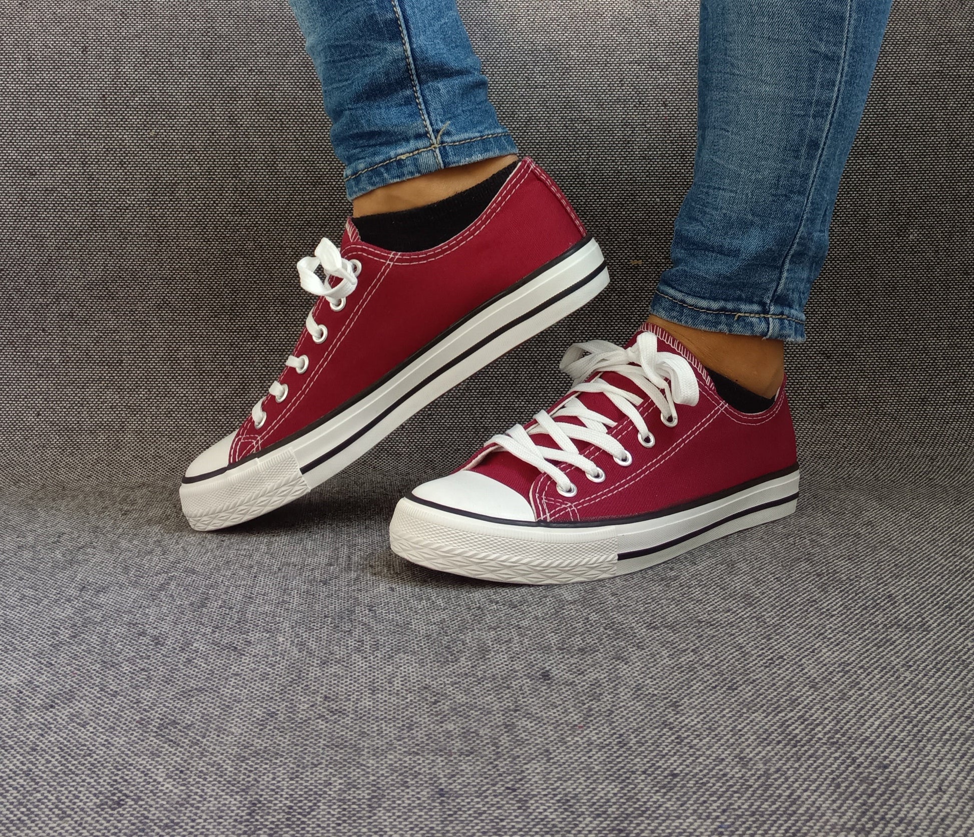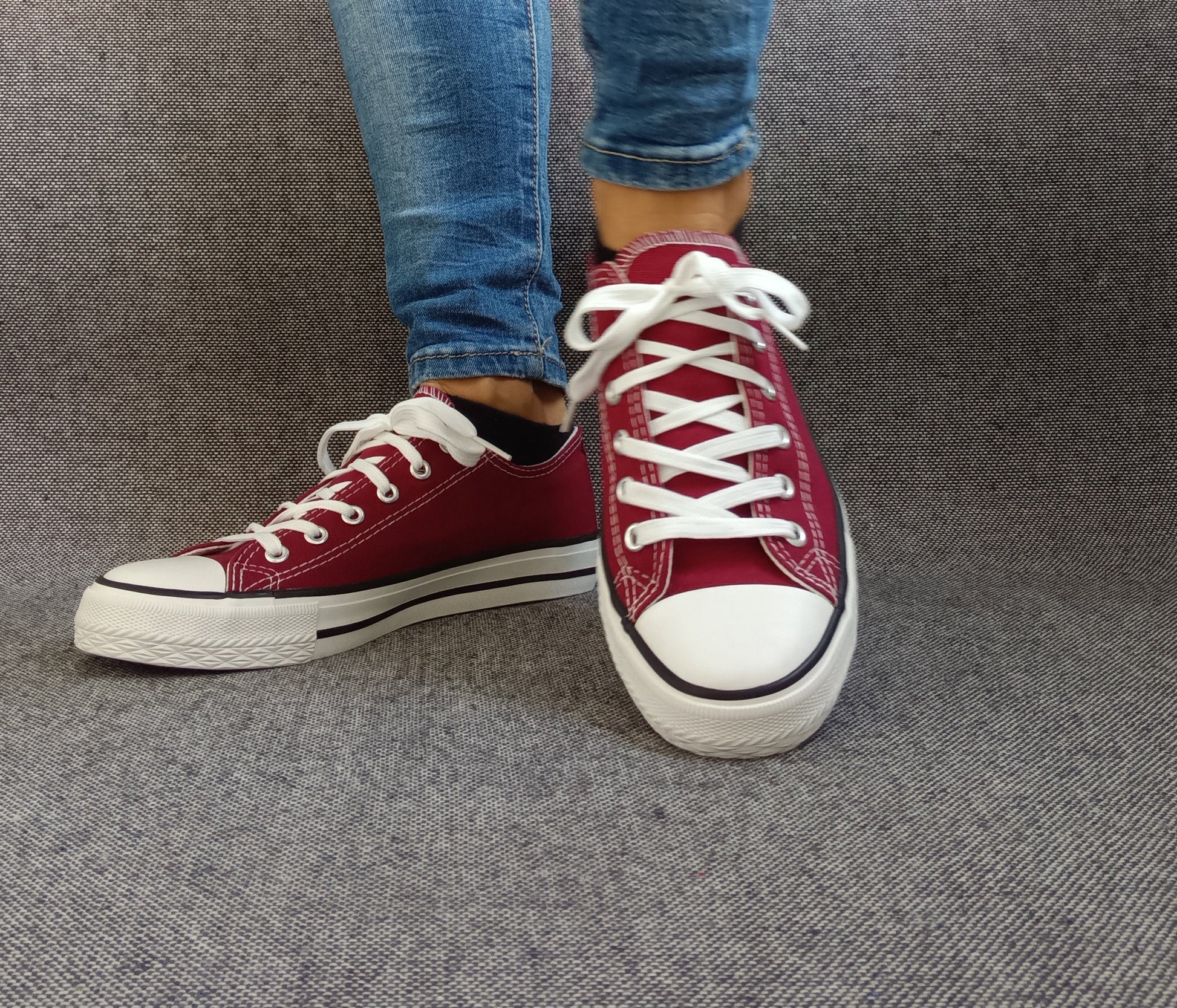 Ces chaussures en toile sont de couleur bordeaux. Elles disposent de lacets blancs et de coutures contrastantes blanches. Les œillets pour les lacets sont métalliques. La semelle est blanche avec une bande noire au-dessus de la semelle.