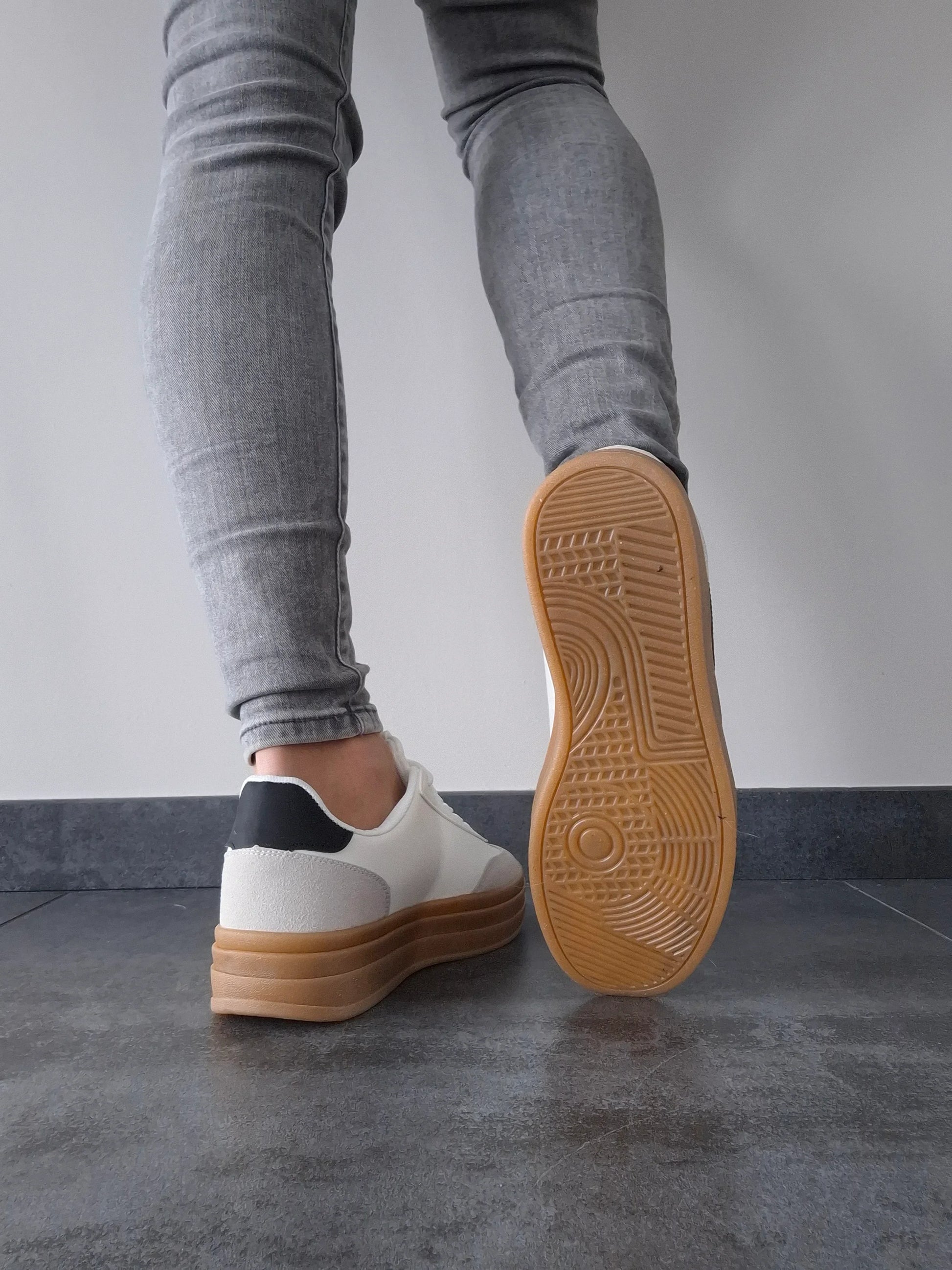 Chaussures baskets blanches légèrement compensée style campus à bandes noires