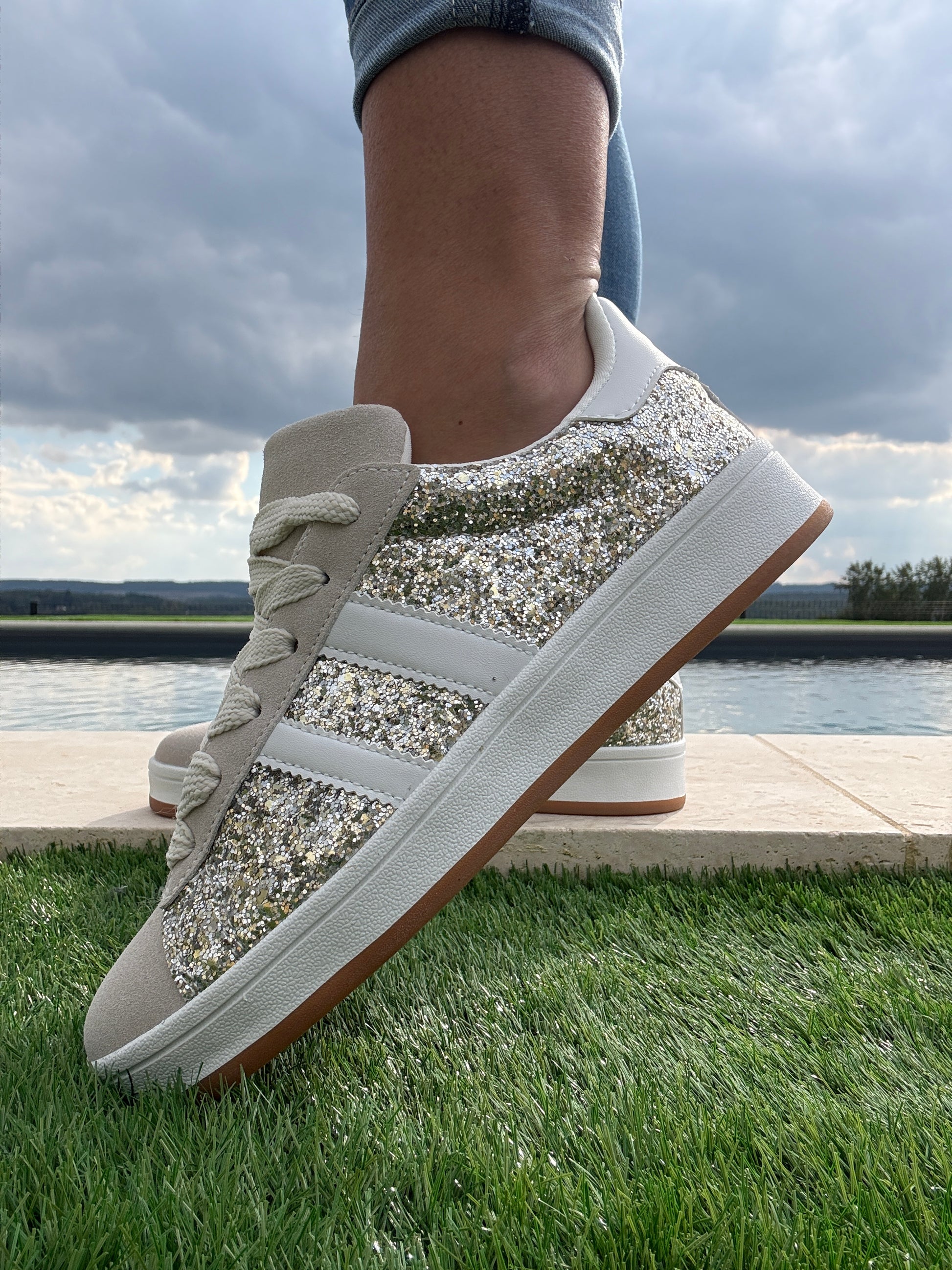 Chaussures baskets gold argenté à paillettes bandes blanches style campus
