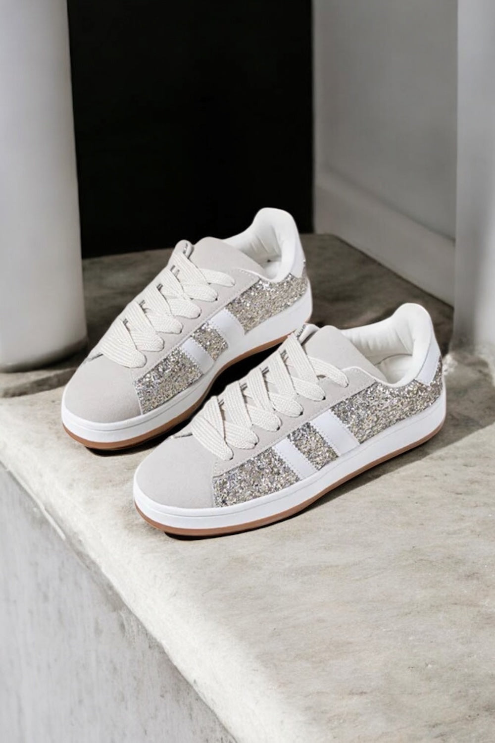 Les sneakers présentent une base blanche avec des bandes latérales argentées étincelantes. Les lacets sont blancs, assortis à la semelle qui est également blanche avec un bord en gomme clair. La partie supérieure est en partie recouverte de matière pailletée, offrant un effet brillant et festif. L'intérieur des chaussures est blanc, ce qui assure une allure propre et soignée.