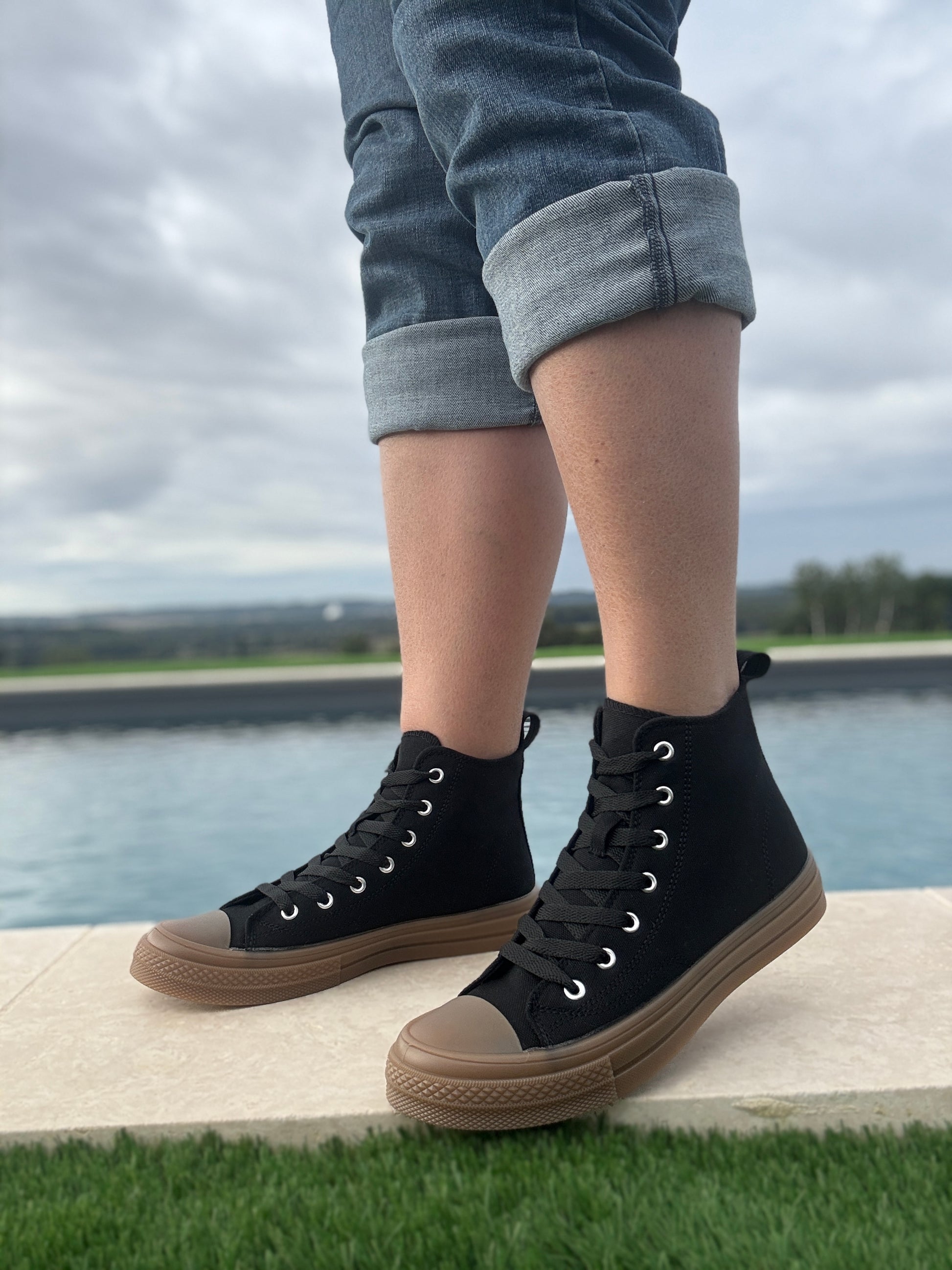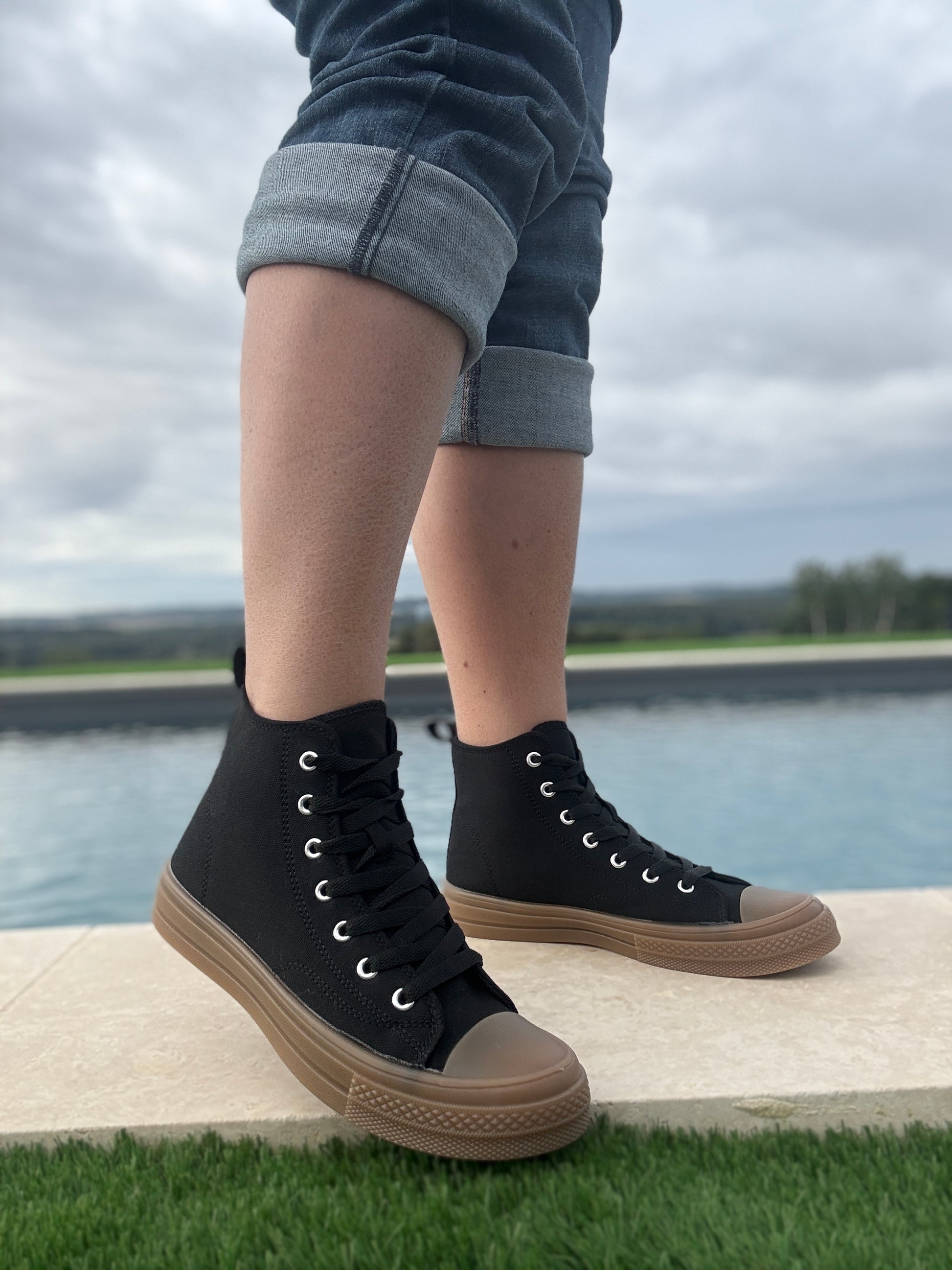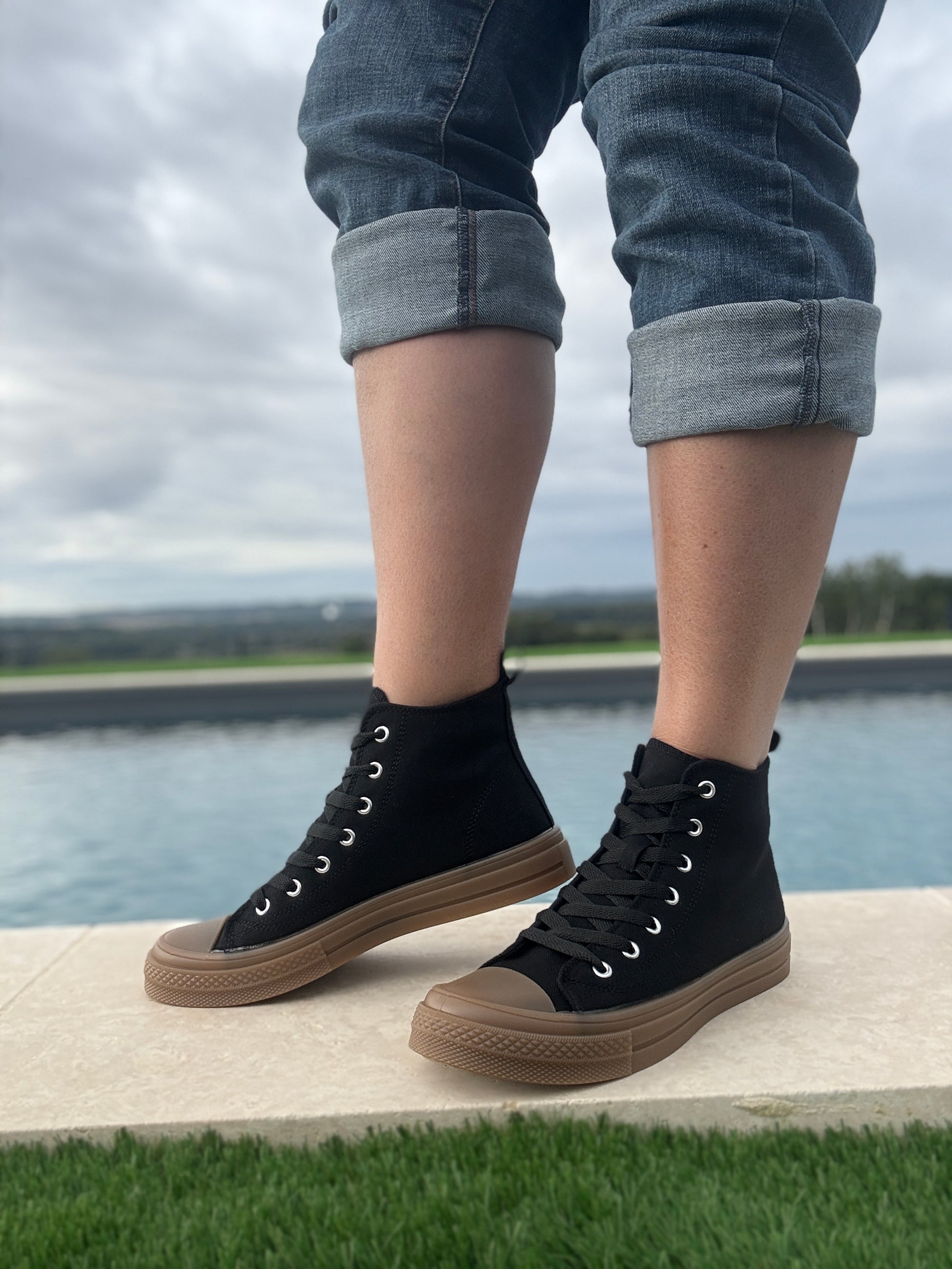 Les baskets sont de couleur noire avec une semelle marron. Les lacets sont également noirs et traversent des œillets métalliques. Le bout de chaque chaussure est renforcé par une protection marron, assortie à la semelle. La coupe montante offre un maintien supplémentaire à la cheville.