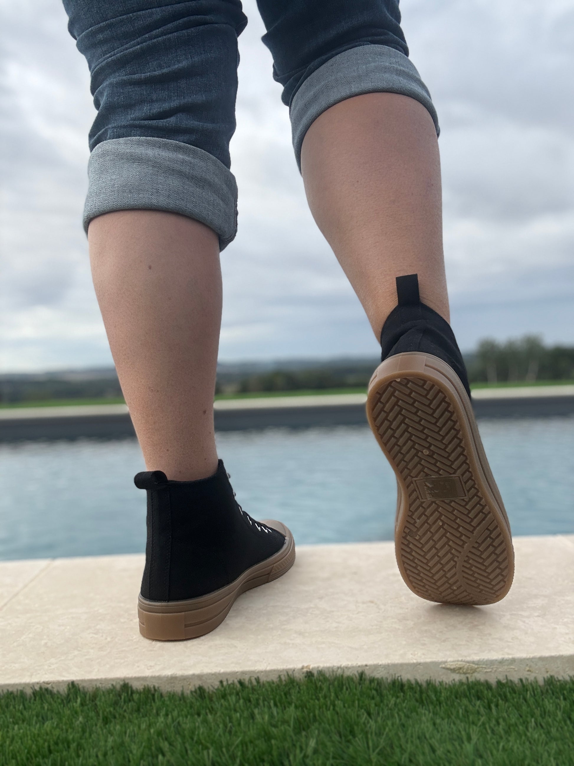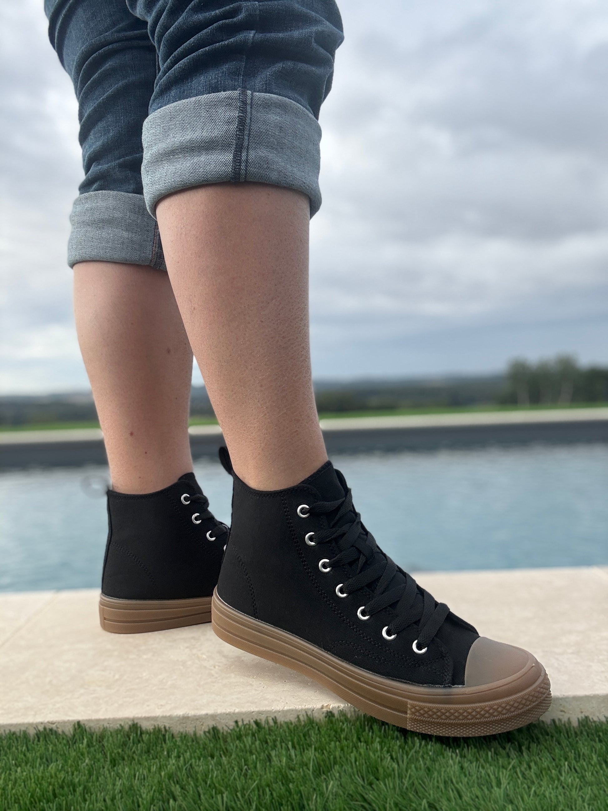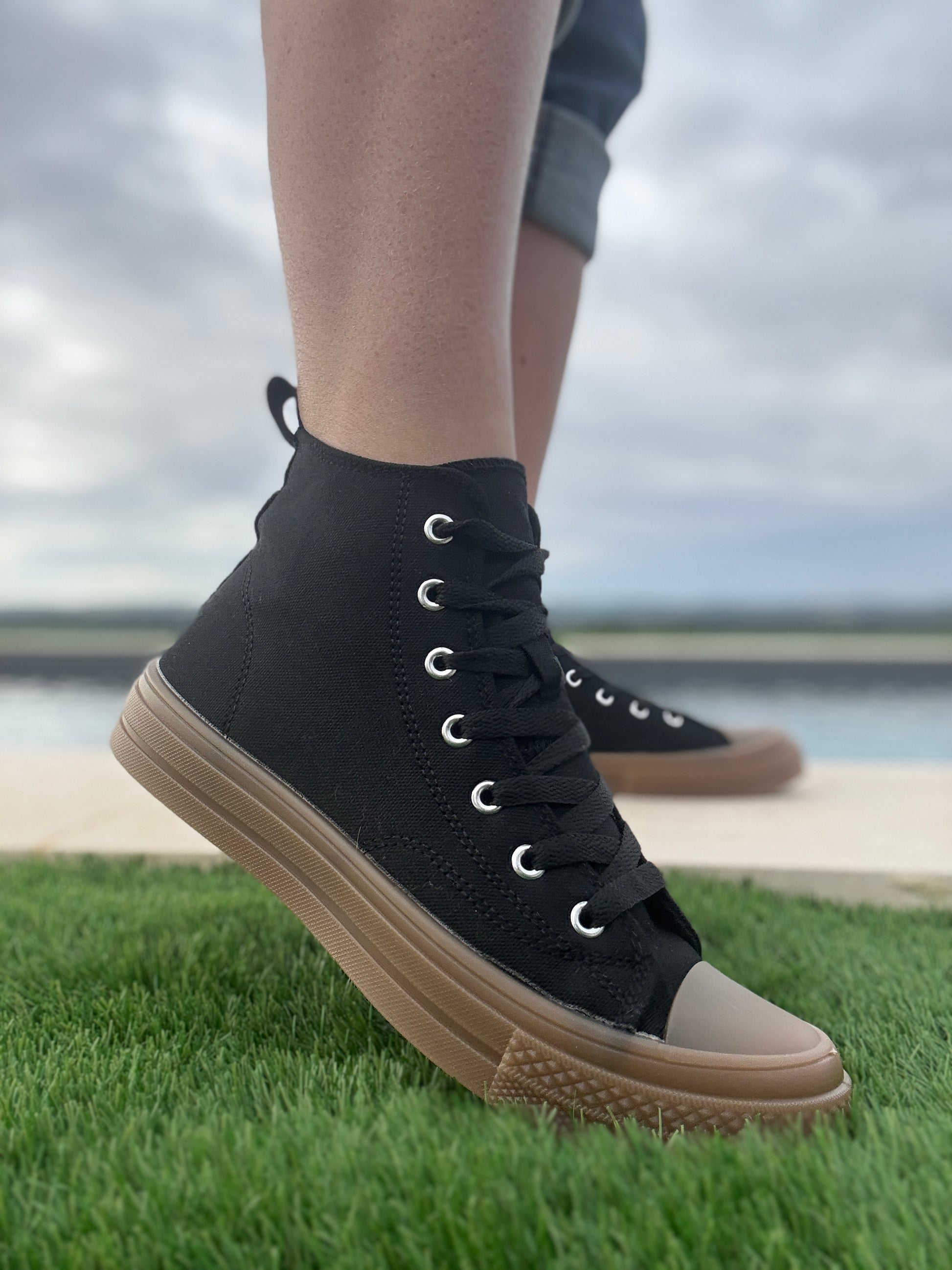 Les baskets sont de couleur noire avec une semelle marron. Les lacets sont également noirs et traversent des œillets métalliques. Le bout de chaque chaussure est renforcé par une protection marron, assortie à la semelle. La coupe montante offre un maintien supplémentaire à la cheville.