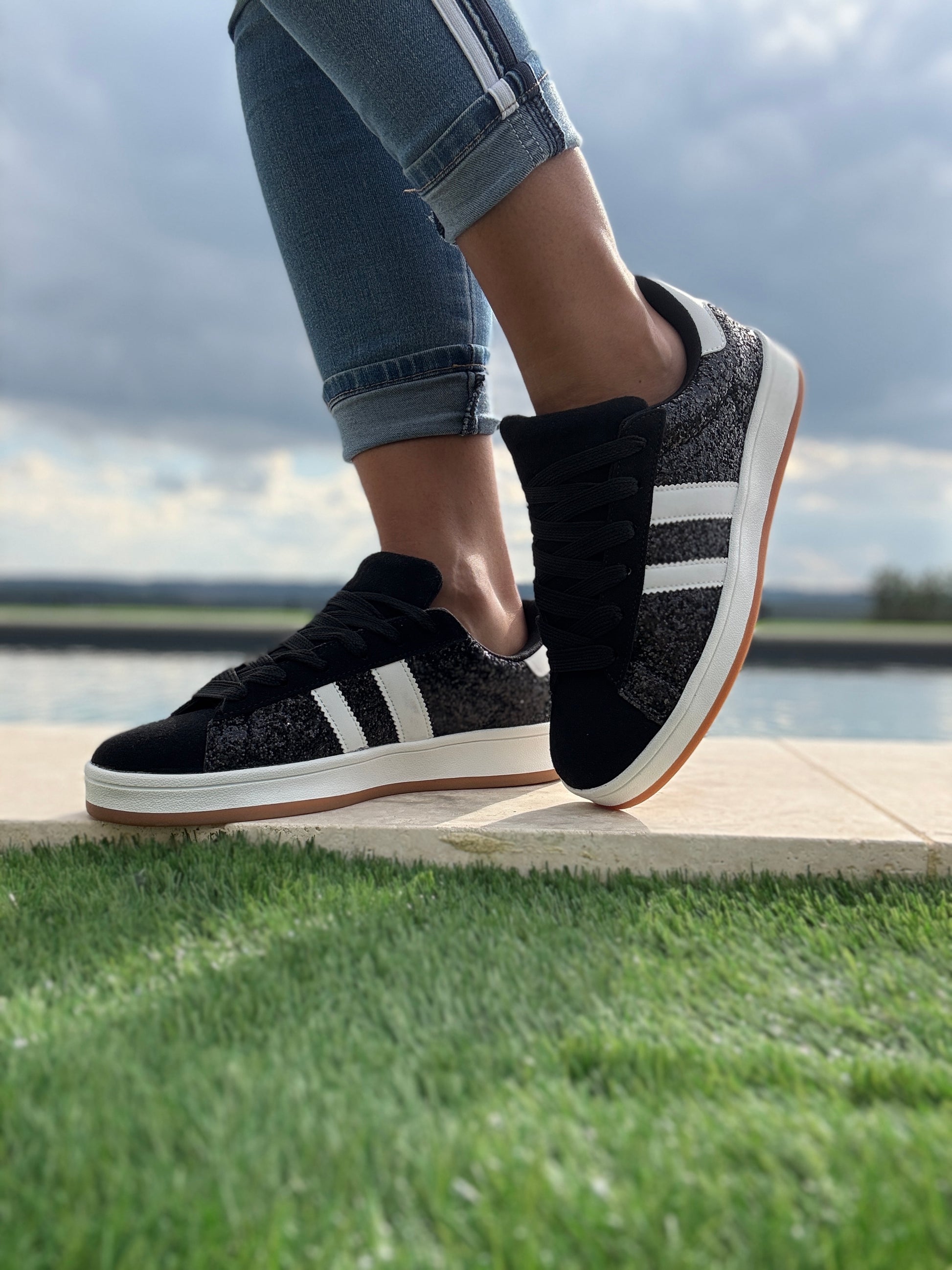 Chaussures baskets basses noires à paillettes bandes blanches style campus