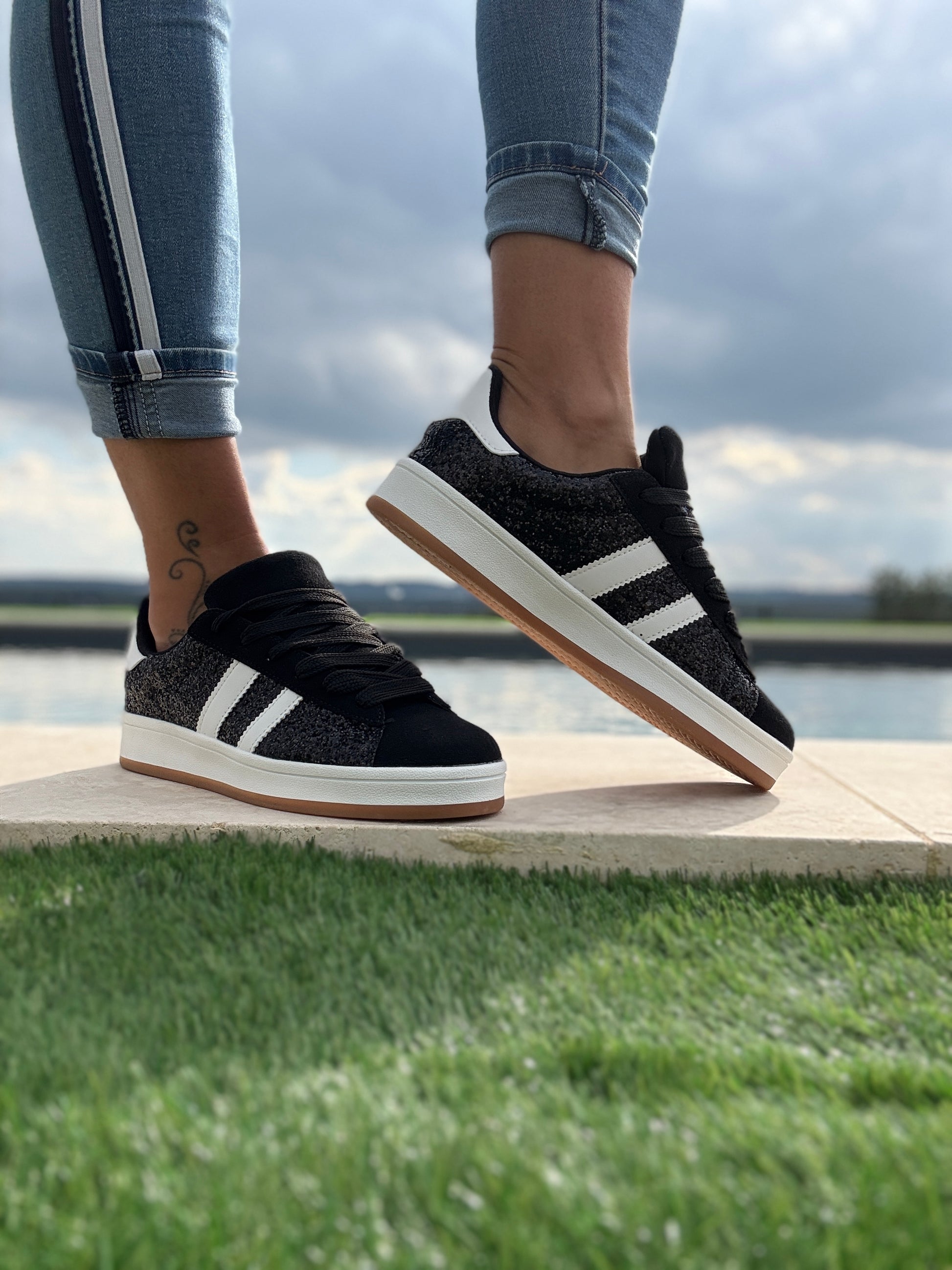 Chaussures baskets noires à paillettes bandes blanches style campus