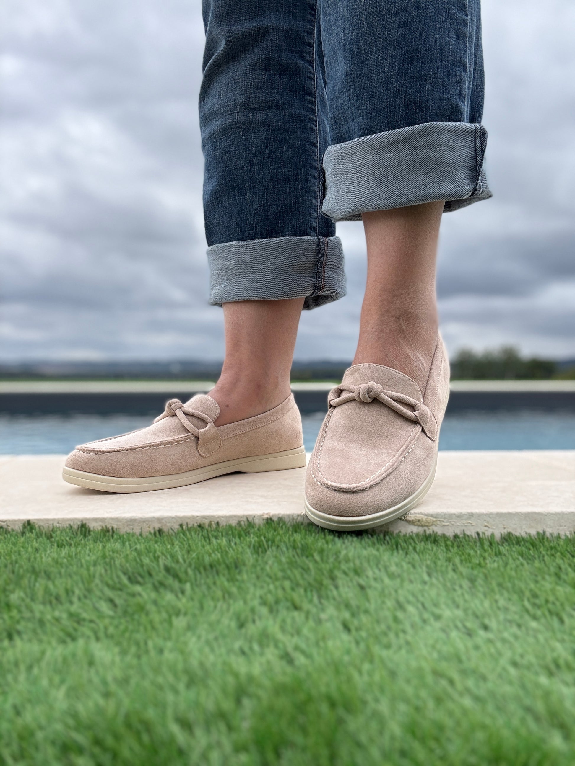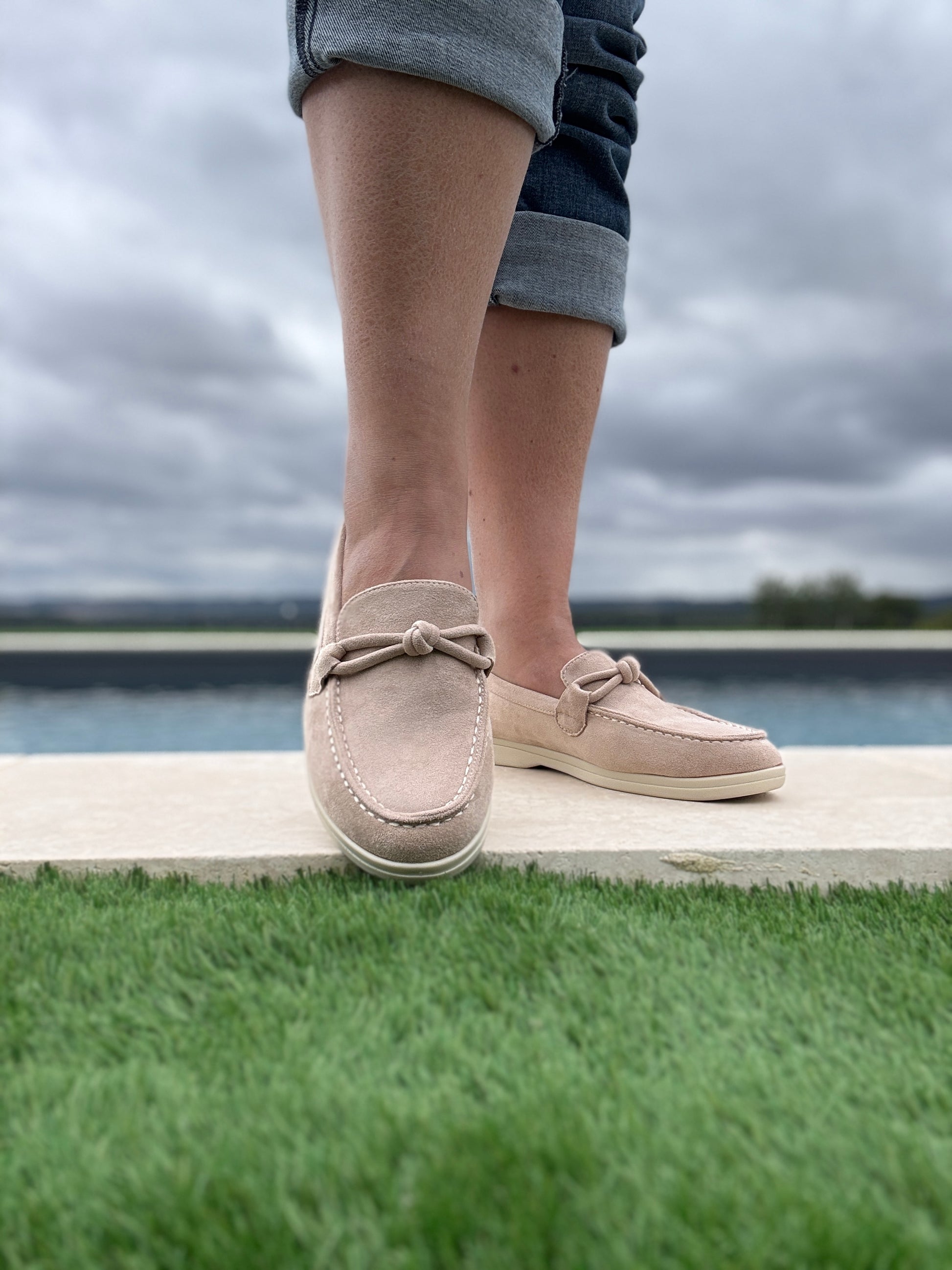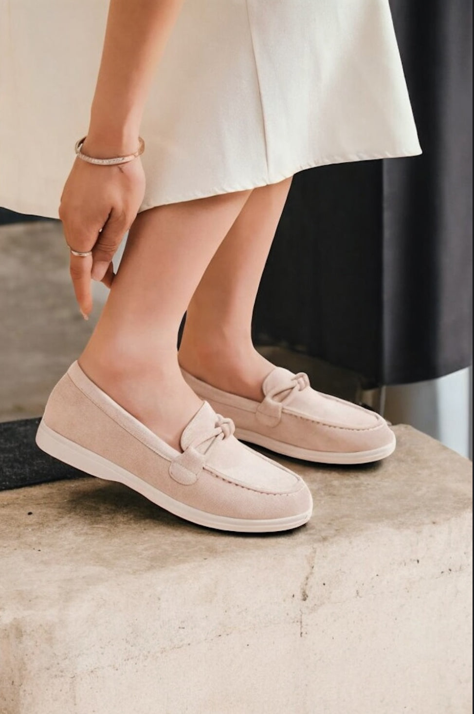 Les mocassins présentent une teinte beige clair uniforme qui leur confère un aspect élégant et sobre. Ils sont dotés d'un nœud décoratif sur le dessus, ajoutant une touche de style. La semelle est de couleur blanche, offrant un contraste subtil avec le reste de la chaussure. Le matériau semble être doux et offre un aspect en daim.