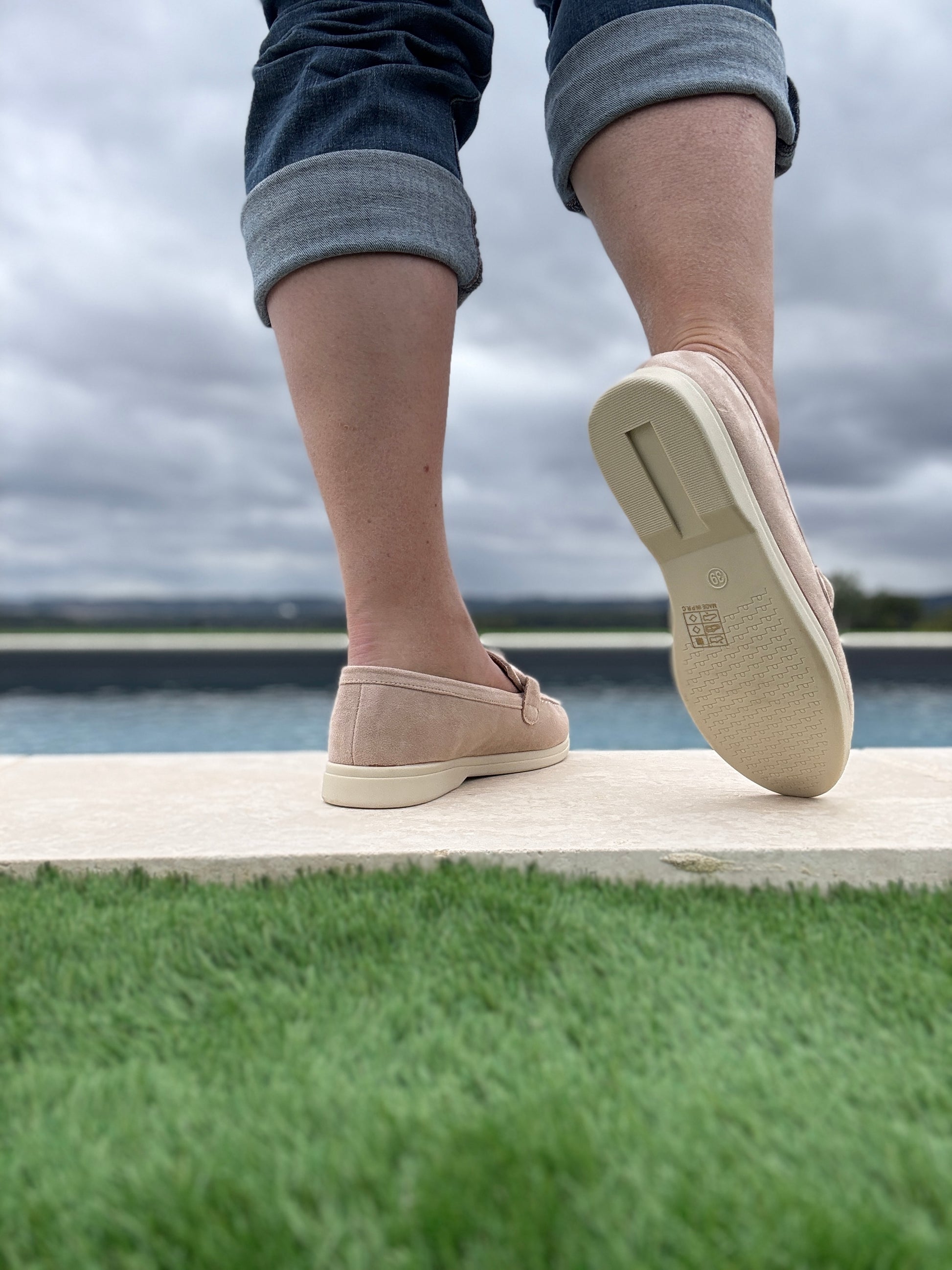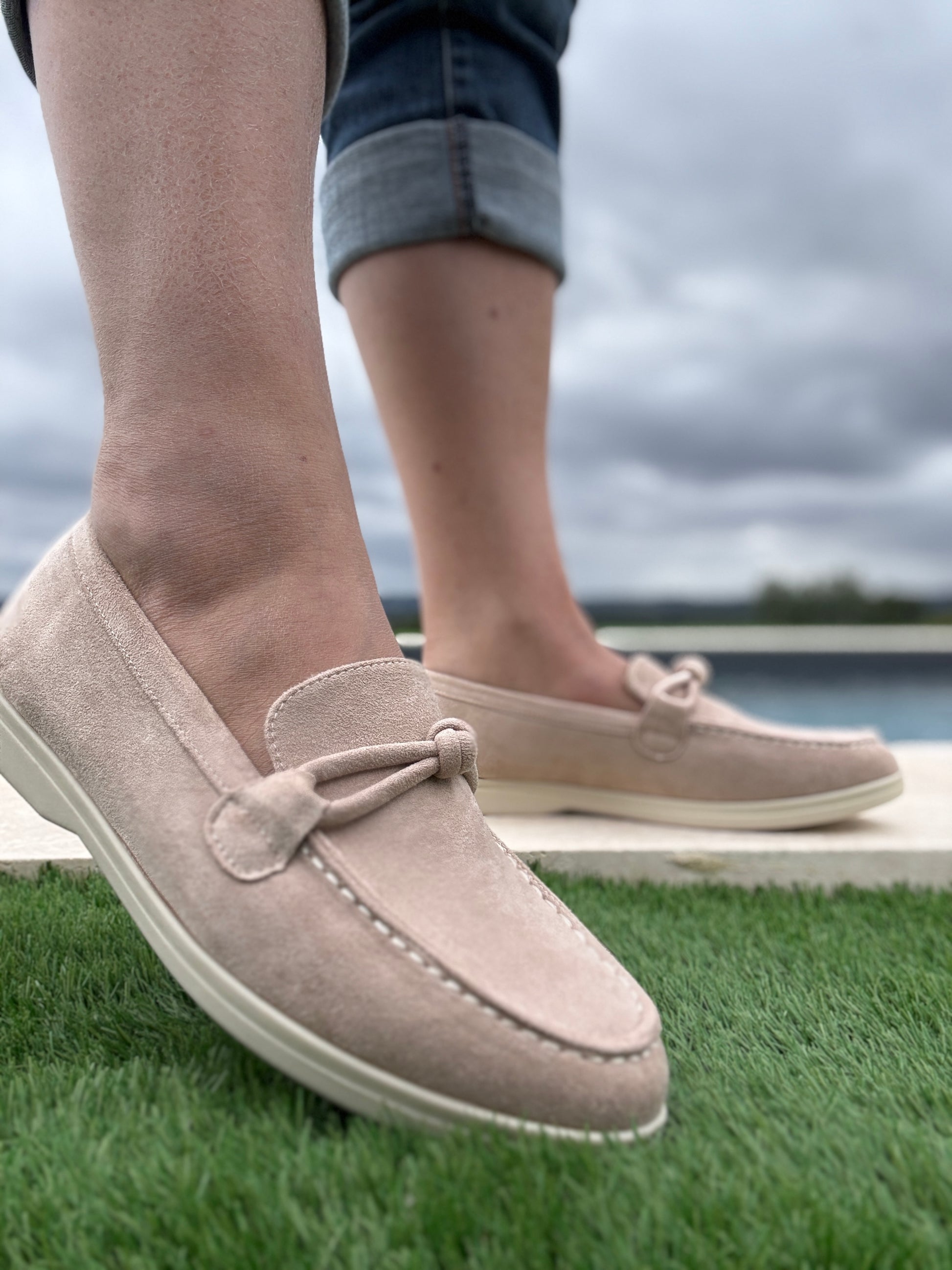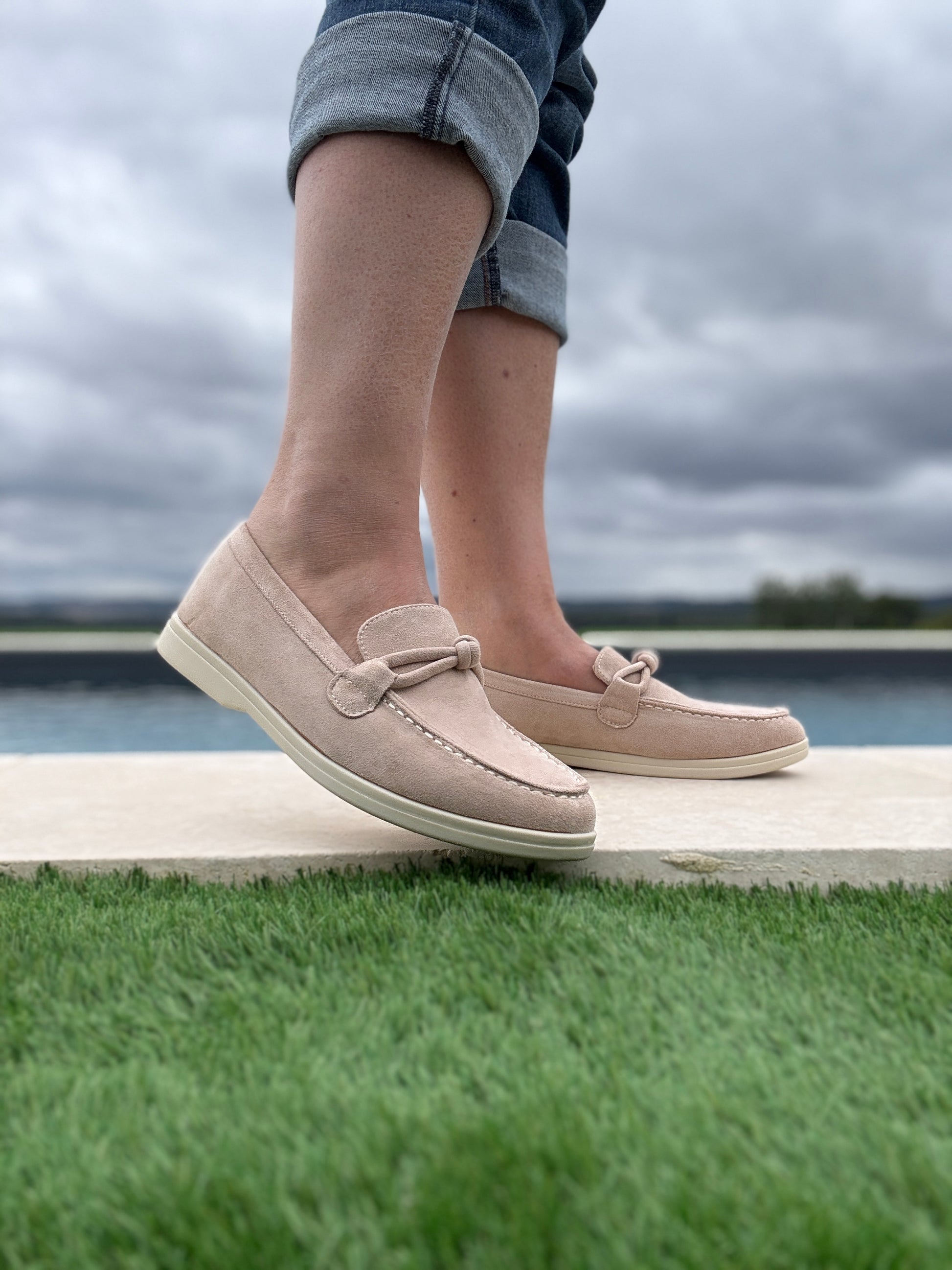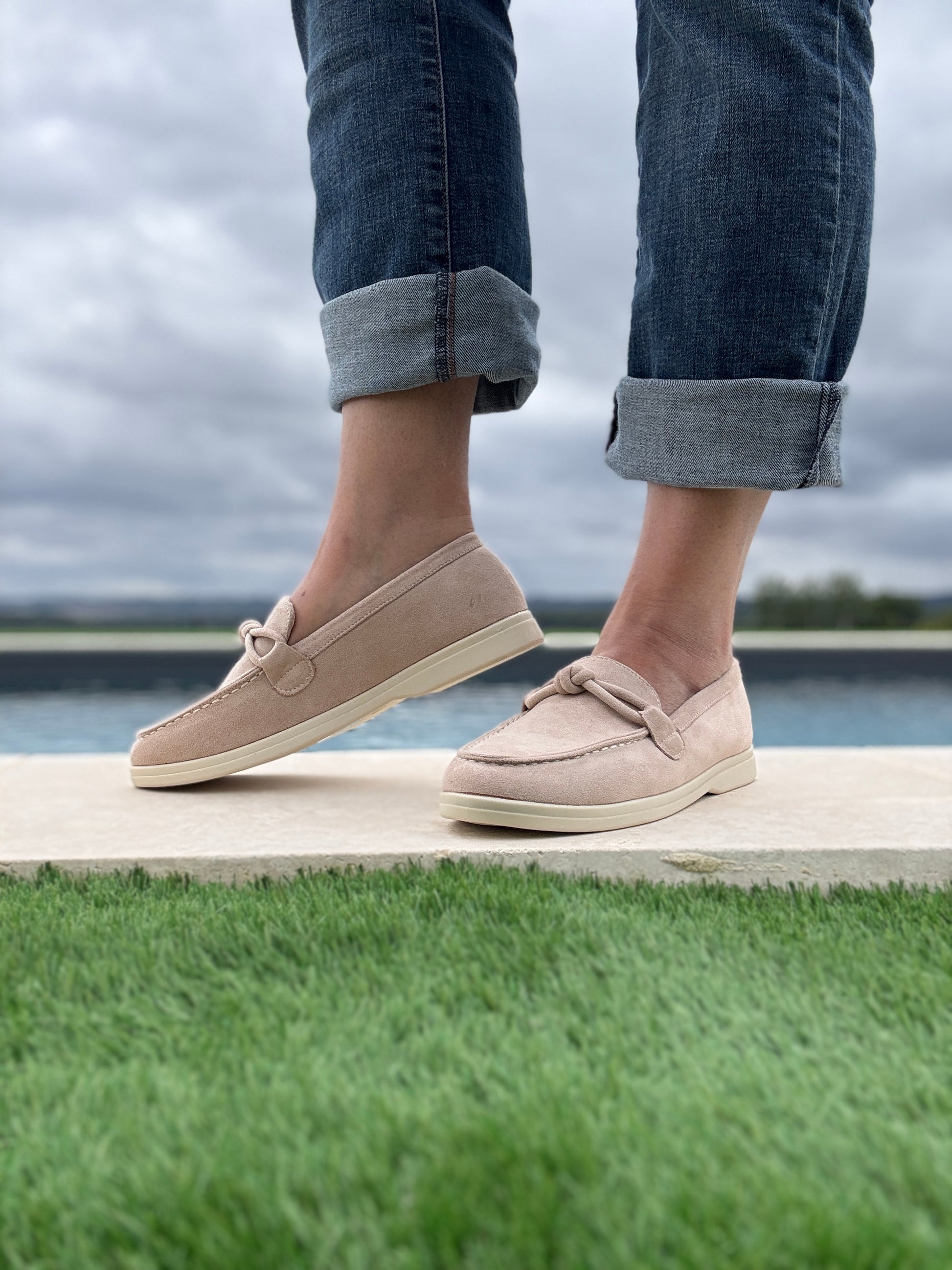 Les mocassins présentent une teinte beige clair uniforme qui leur confère un aspect élégant et sobre. Ils sont dotés d'un nœud décoratif sur le dessus, ajoutant une touche de style. La semelle est de couleur blanche, offrant un contraste subtil avec le reste de la chaussure. Le matériau semble être doux et offre un aspect en daim.