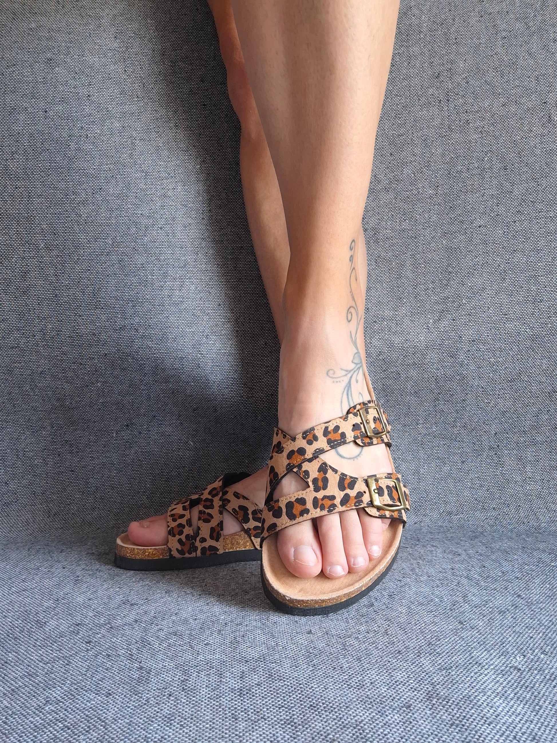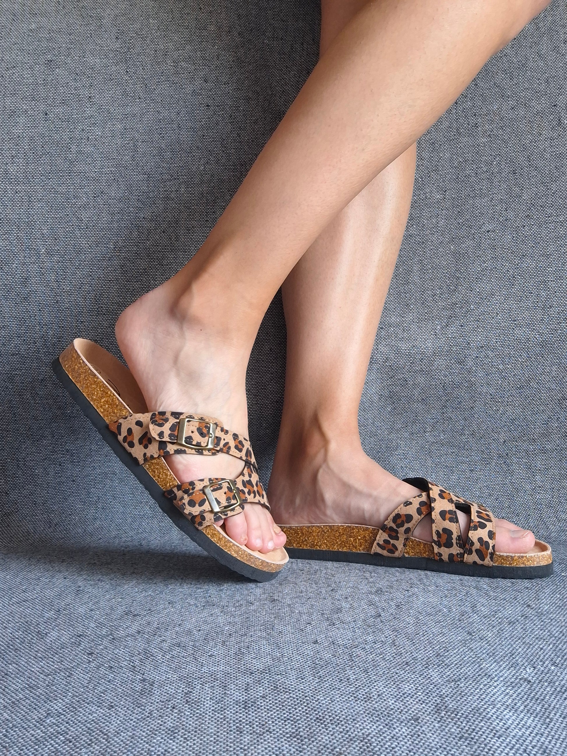 Chaussures sandales type Birk à 2 brides léopard beige semelle intérieure cuir