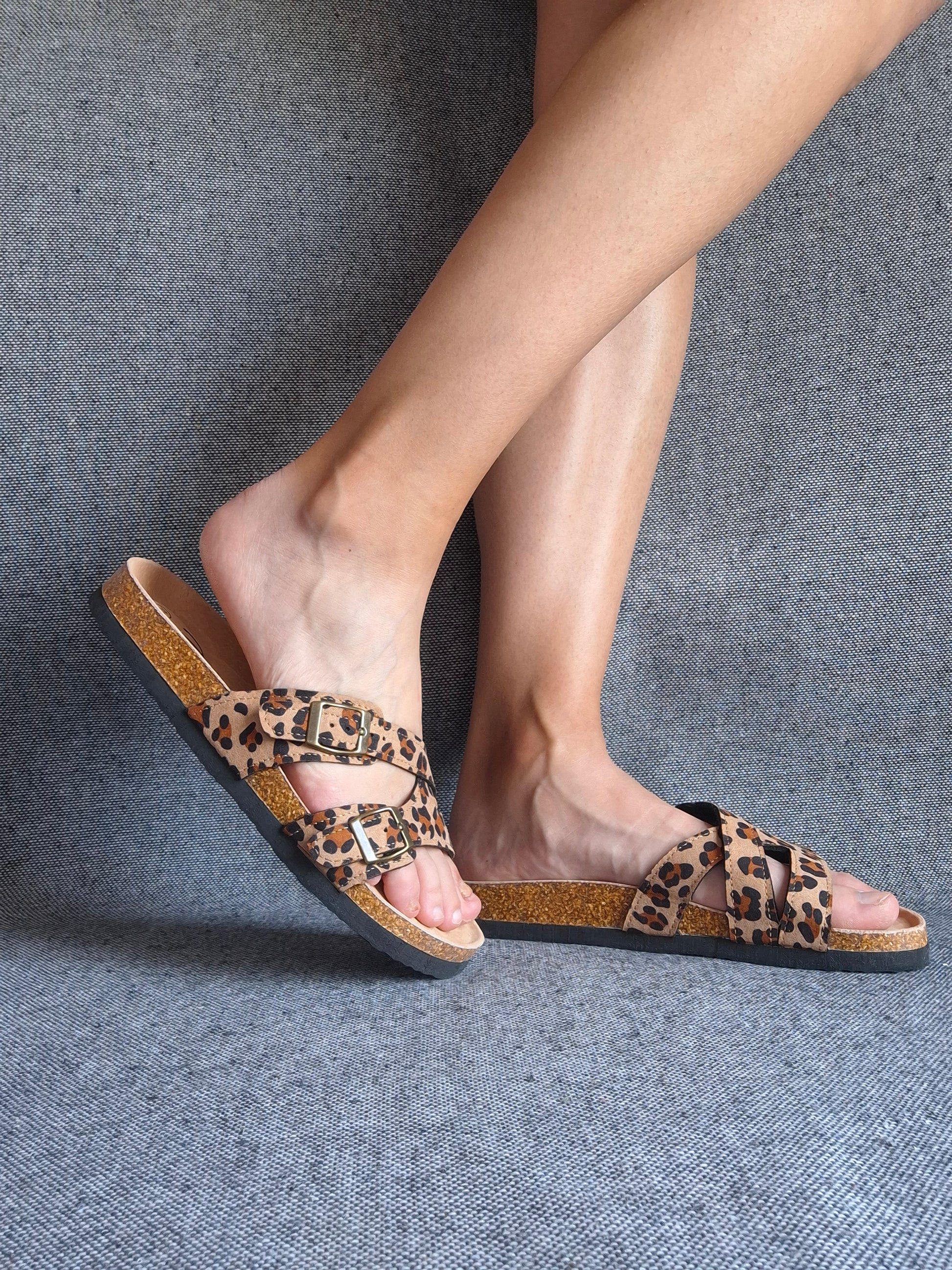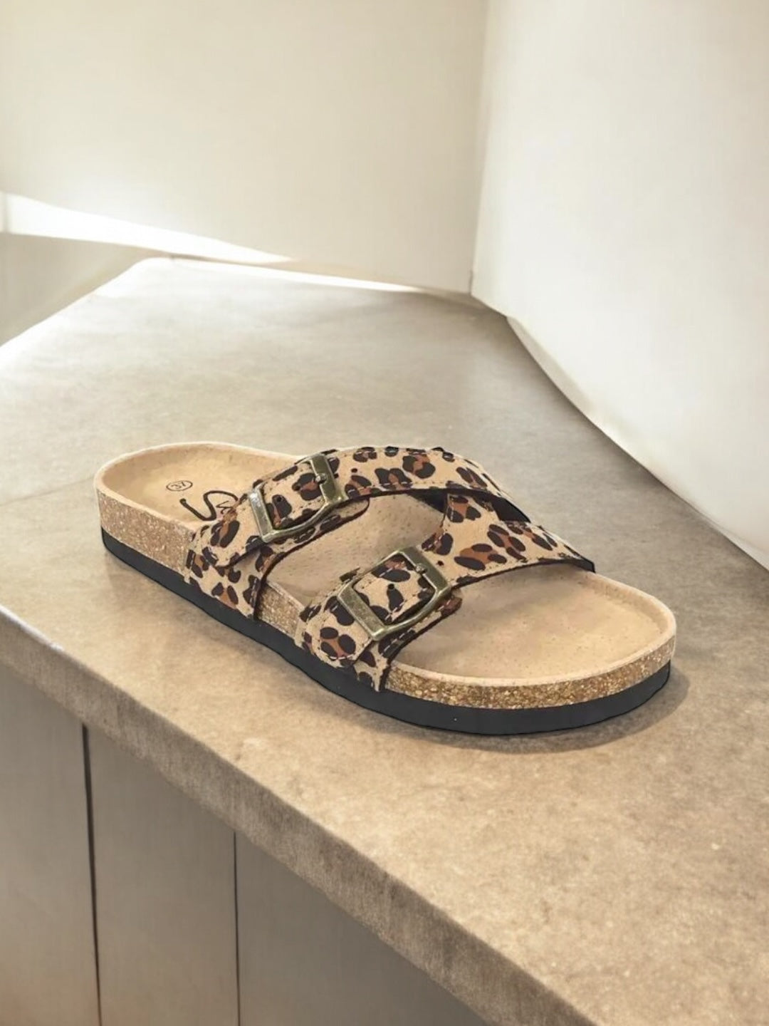 Les sandales possèdent deux larges brides avec un motif léopard, apportant une allure audacieuse et stylée. Chaque bride est ajustable grâce à une boucle métallique de couleur argentée. La semelle intérieure a une finition beige, ajoutant du confort à chaque pas. La semelle extérieure est noire, assurant une bonne adhérence et un contraste élégant avec le motif des brides.
