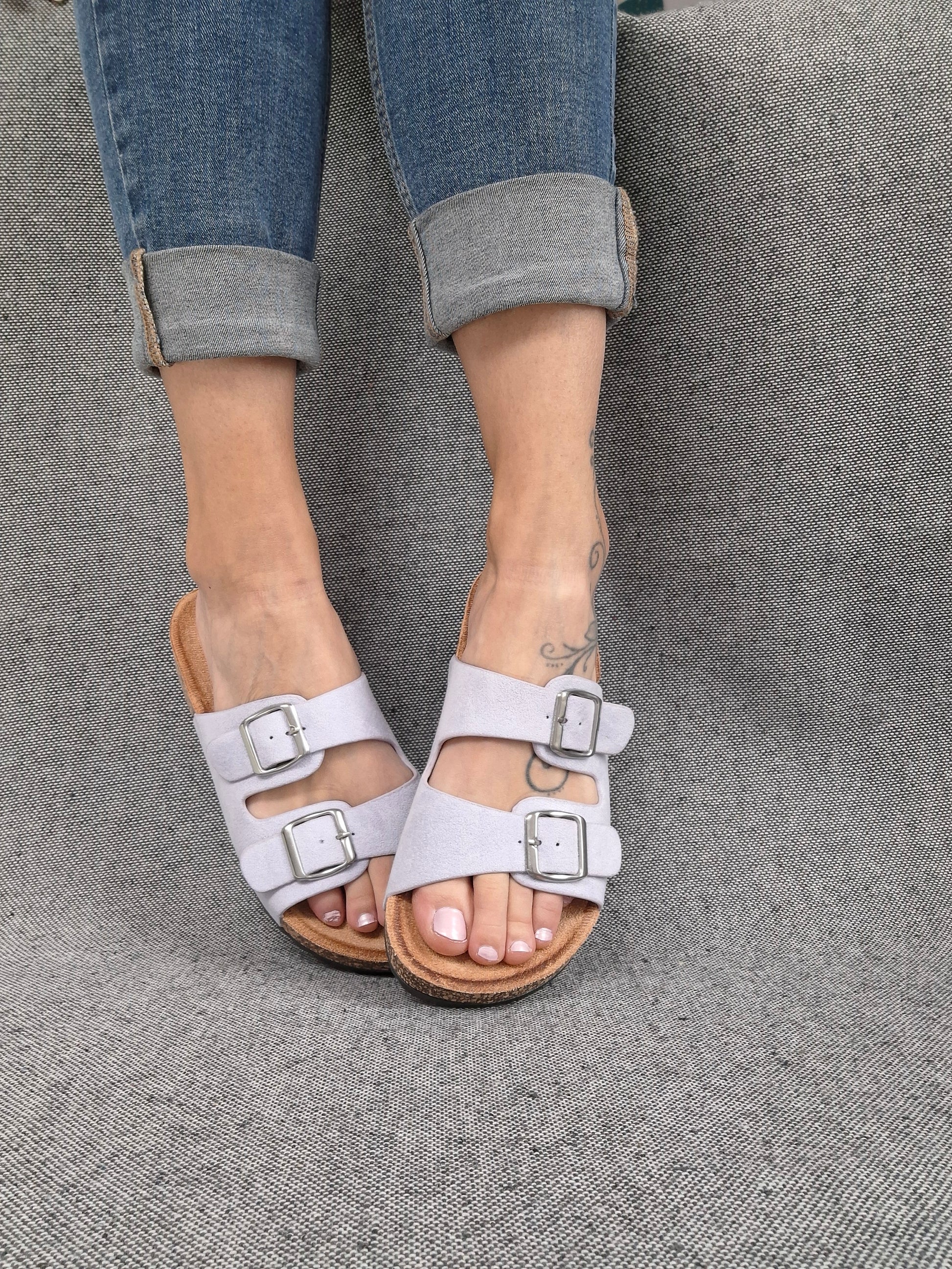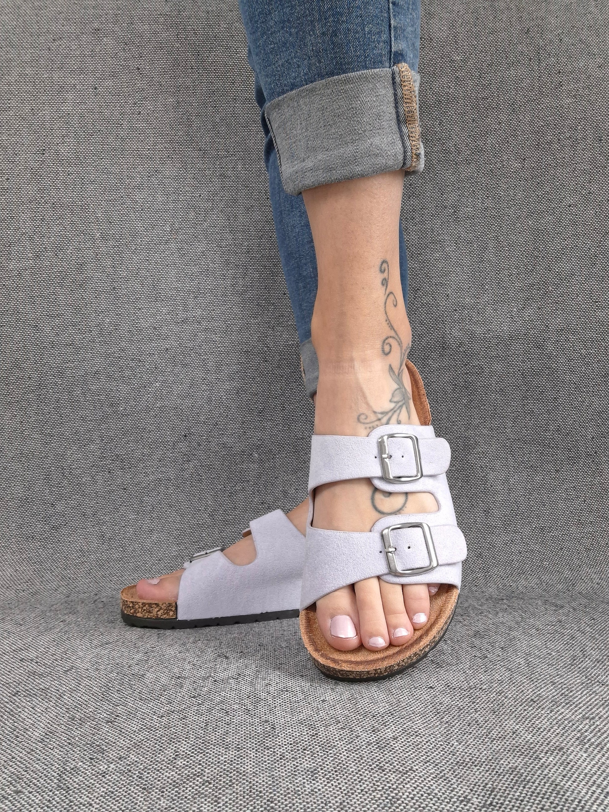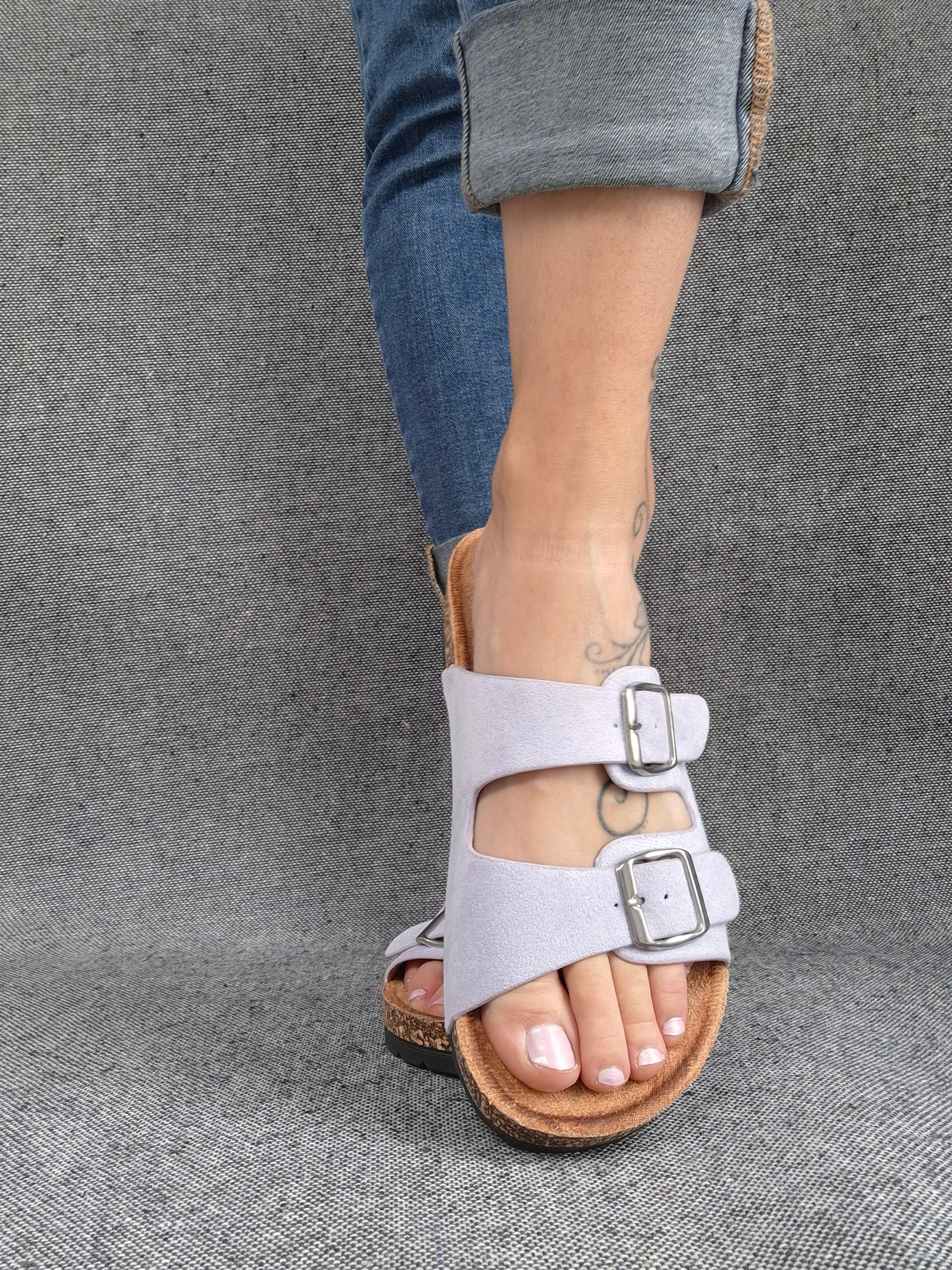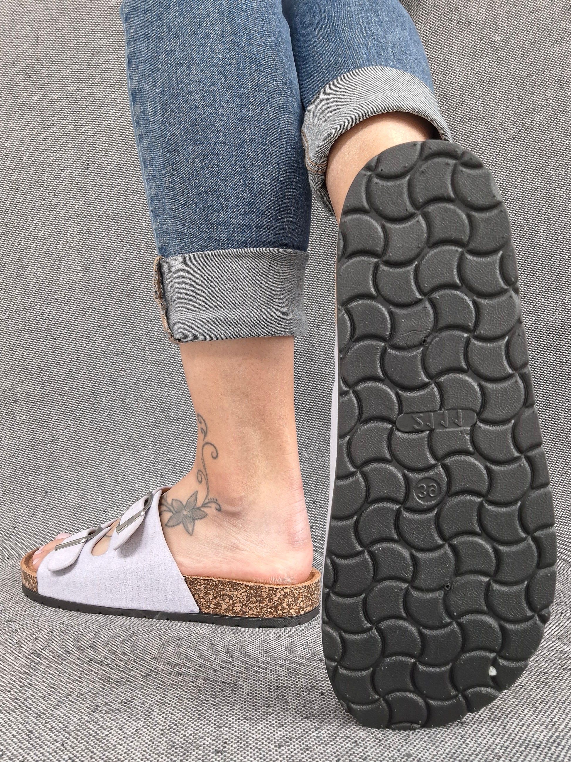 Les sandales sont ornées de deux brides avec des boucles qui permettent un ajustement personnalisé. La couleur lilas ajoute une touche de couleur douce et féminine. La semelle en liège est épaisse et assure un confort optimal pendant la marche. La semelle extérieure est noire, offrant une bonne adhérence.
