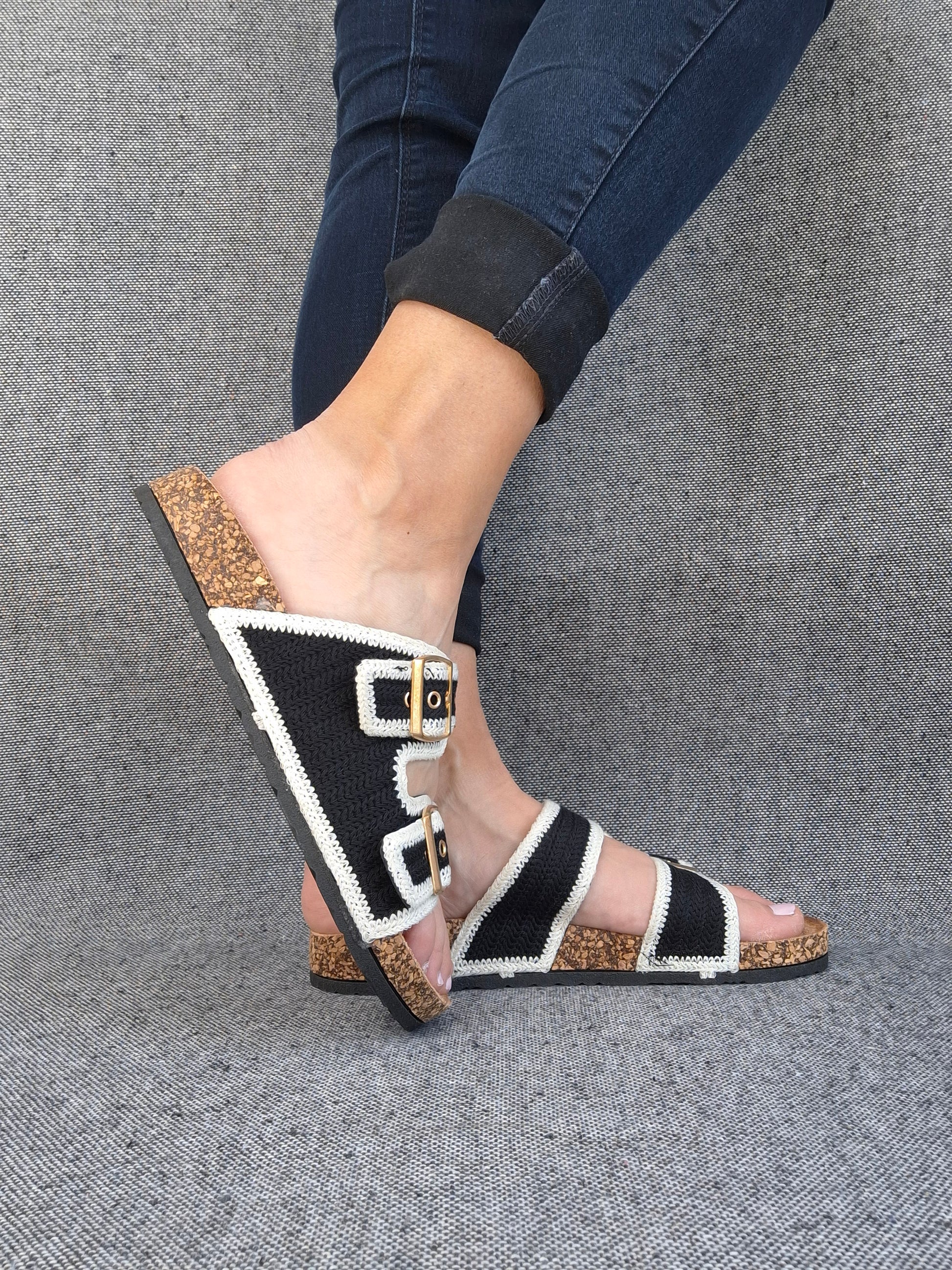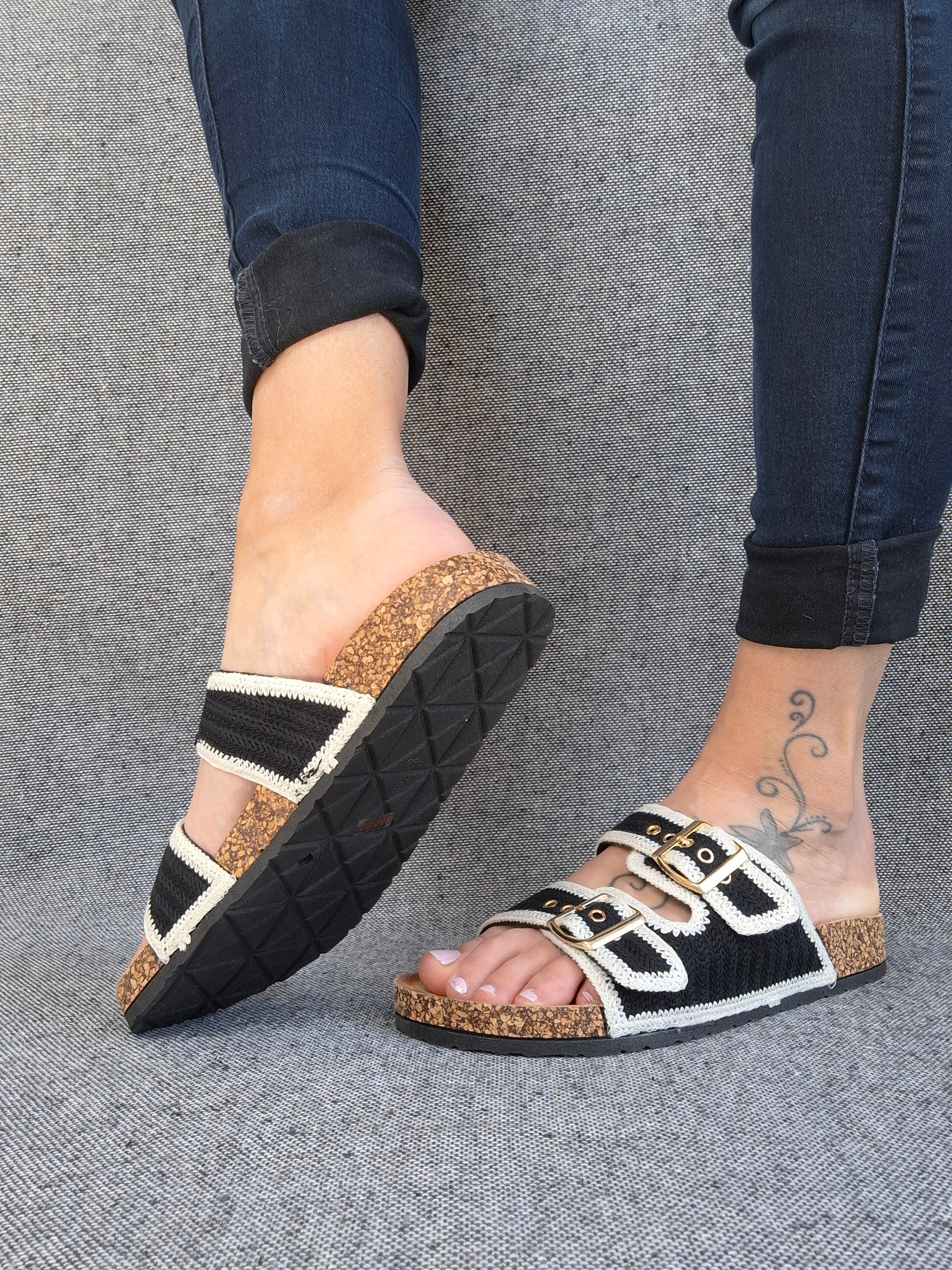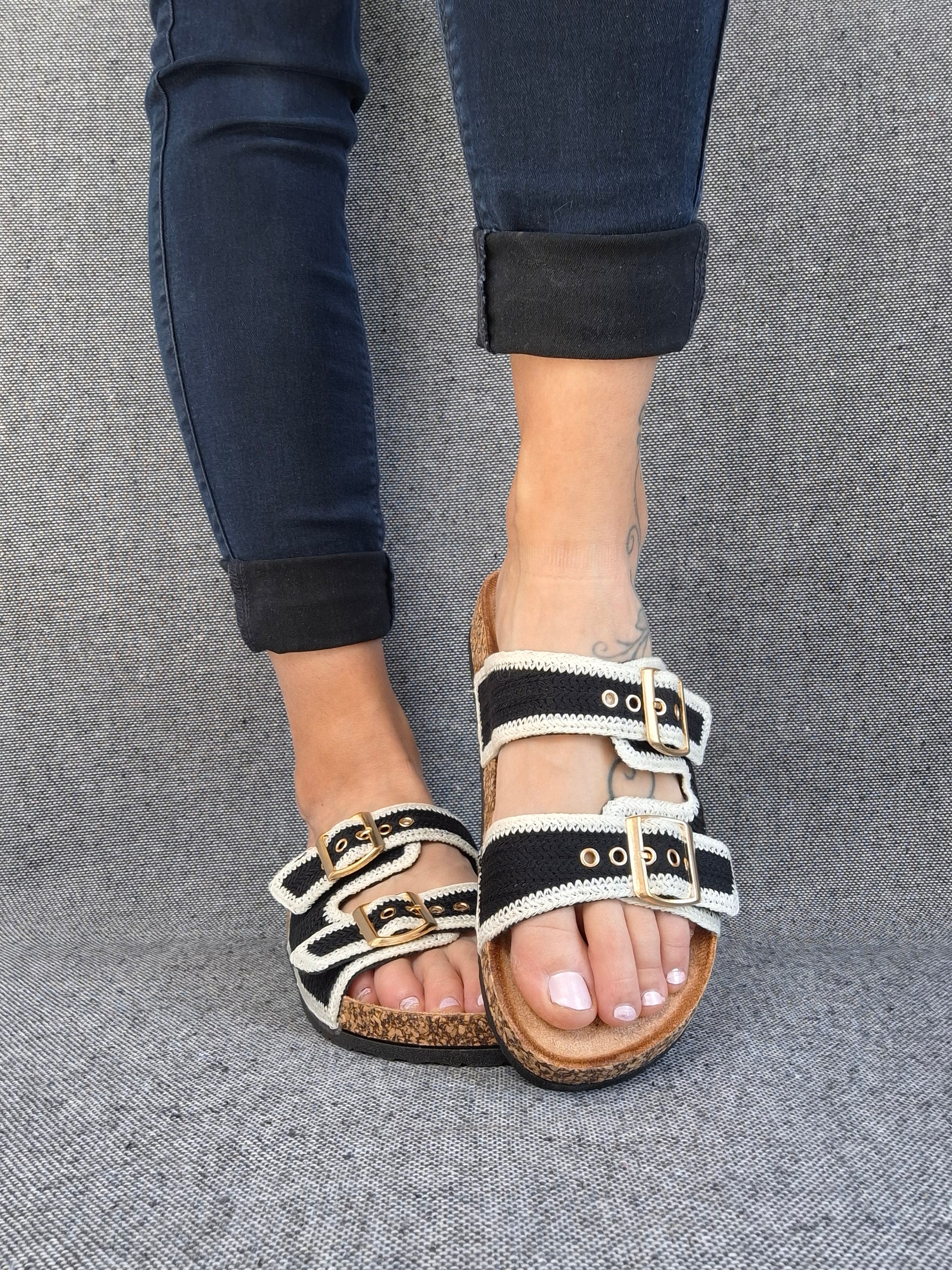 Les sandales présentent une semelle qui offre un bon maintien du pied. Elles sont équipées de deux larges lanières bicolores, noires et beiges, qui traversent le pied en diagonale. Chaque lanière est ajustable grâce à une boucle dorée, ajoutant une touche élégante au design. La semelle intérieure semble légèrement rembourrée pour plus de confort lors de la marche.