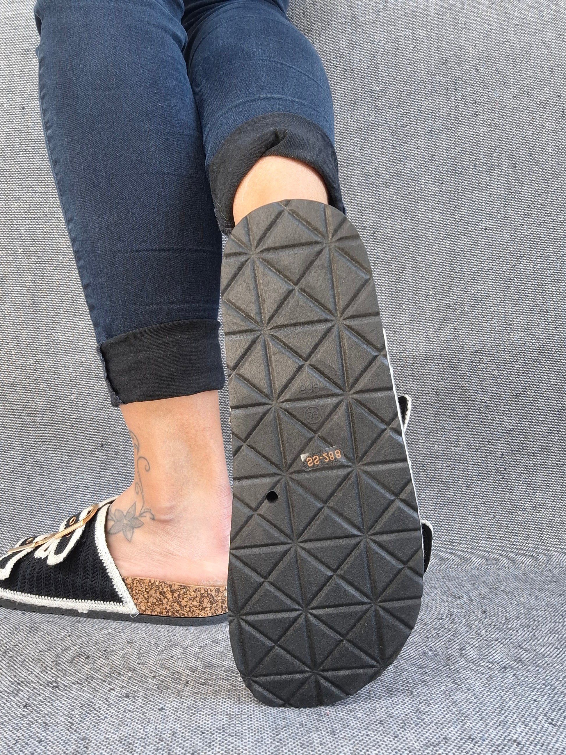 Chaussures sandales type birk 2 brides tissu bicolore noir et beige