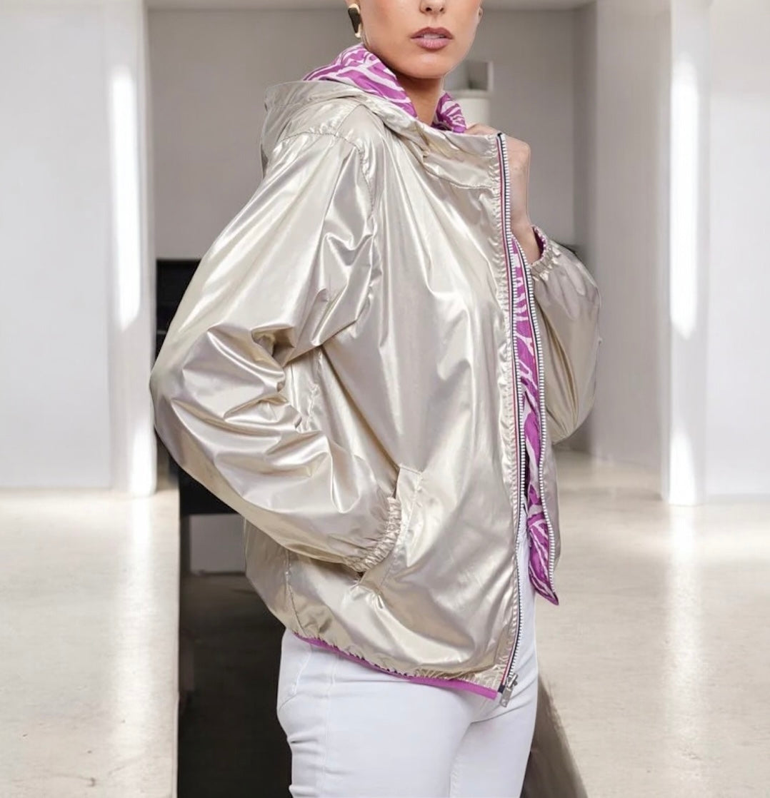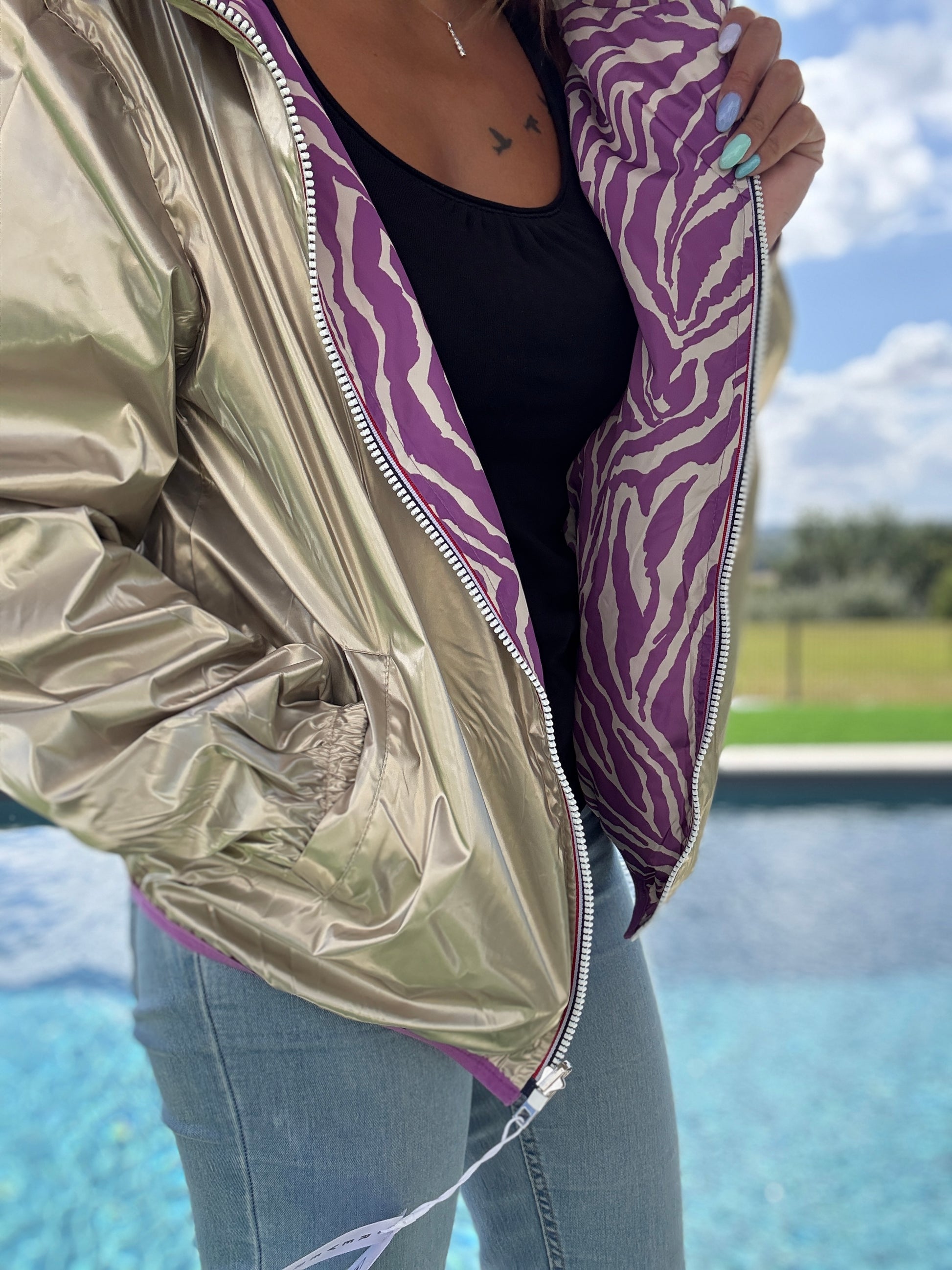 La veste est réversible, offrant deux styles distincts : un côté arborant un motif zébré rose et blanc, l'autre avec un fini doré métallisé. Elle dispose d'une capuche et d'une fermeture éclair centrale. Les manches et la taille sont légèrement élastiquées pour un meilleur ajustement. Des poches latérales offrent un espace fonctionnel et pratique.
