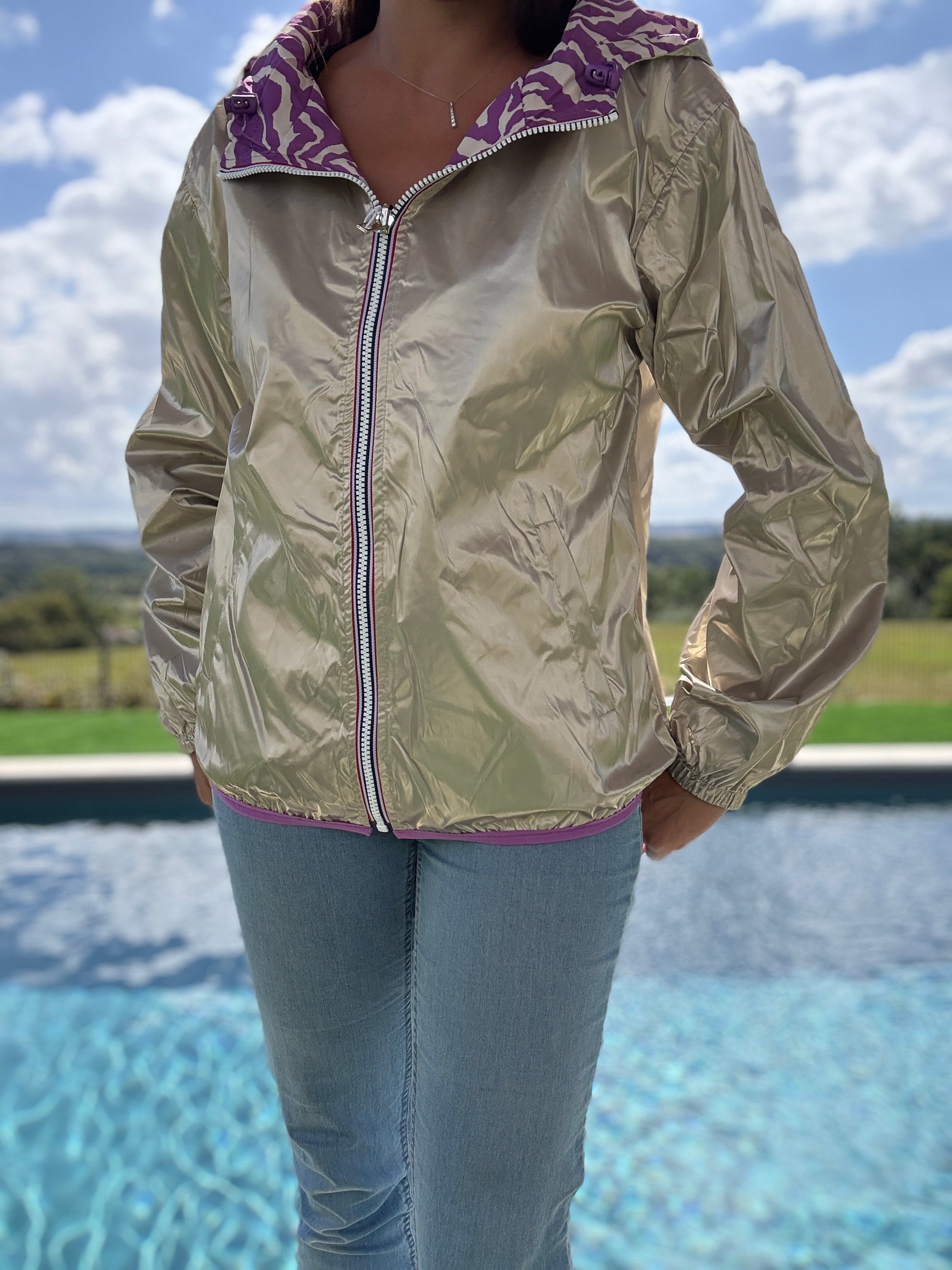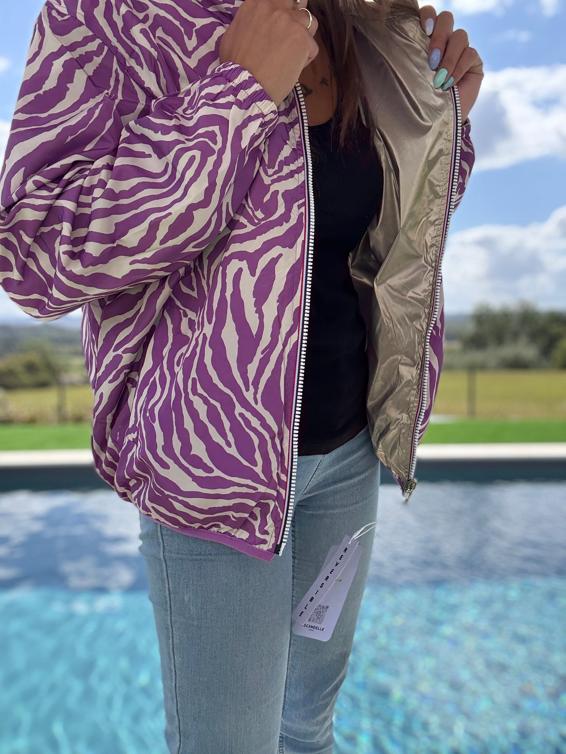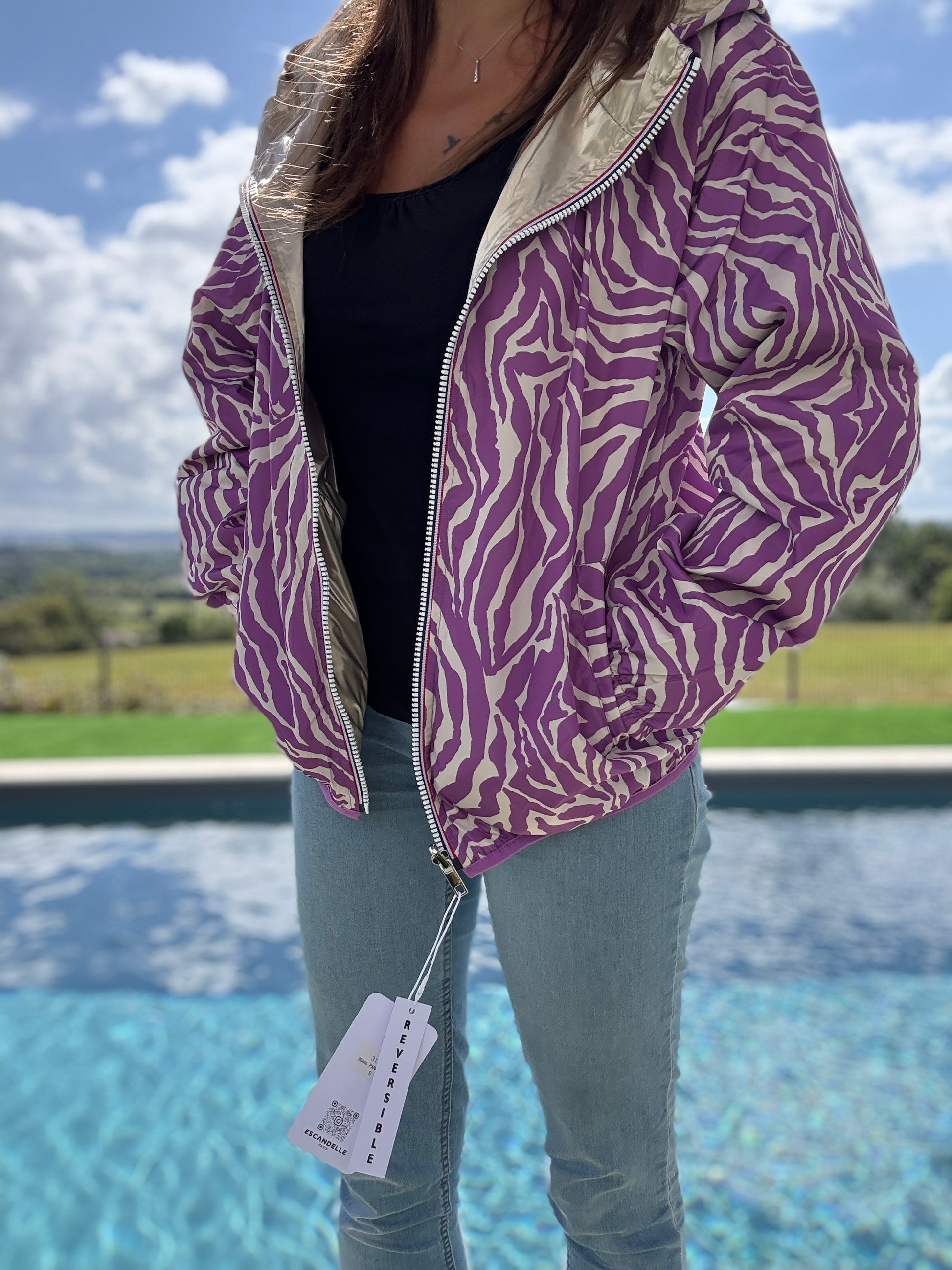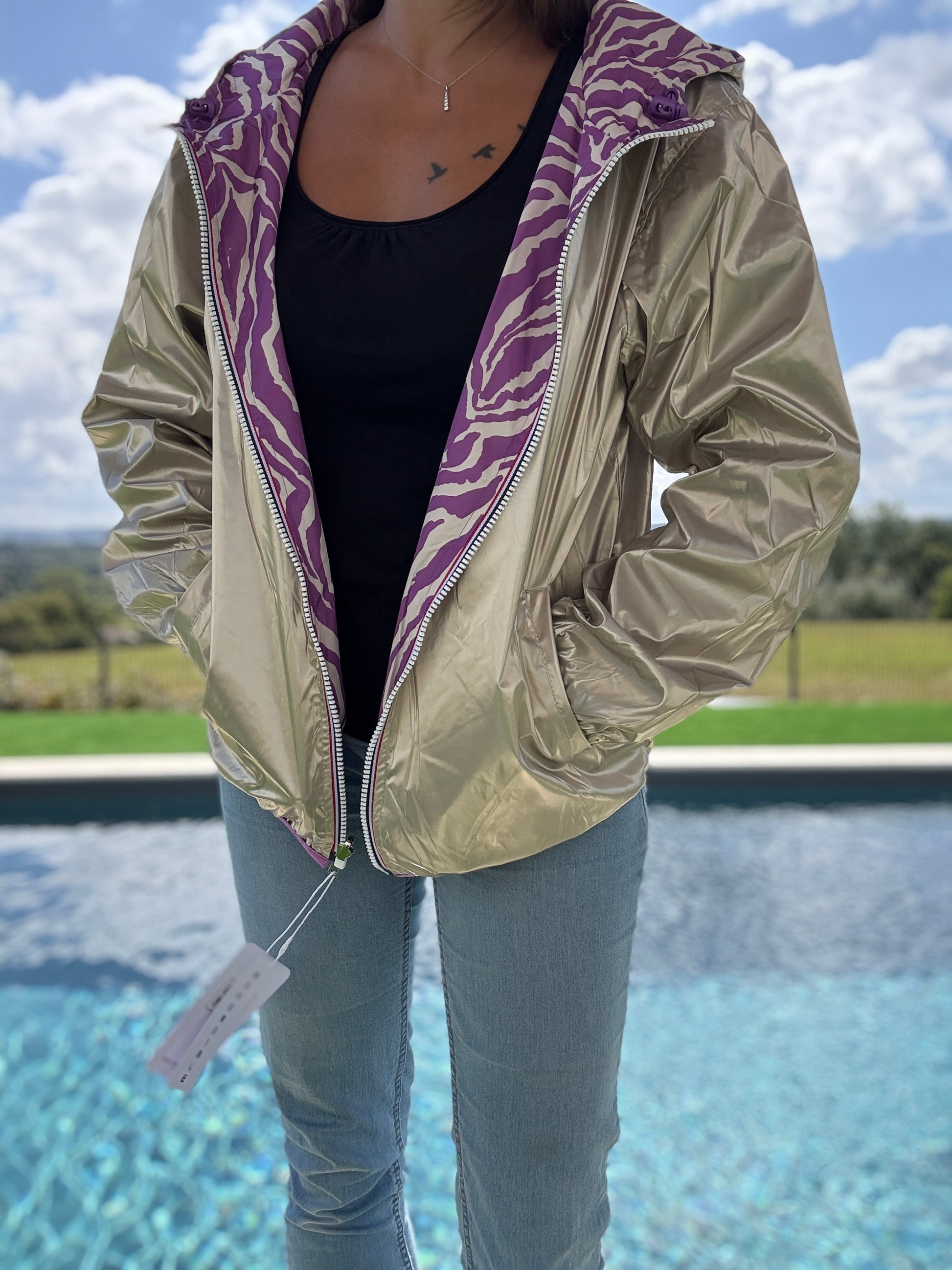 Escandelle - Manteau court haut des fesses imperméable zébré violet réversible doré
