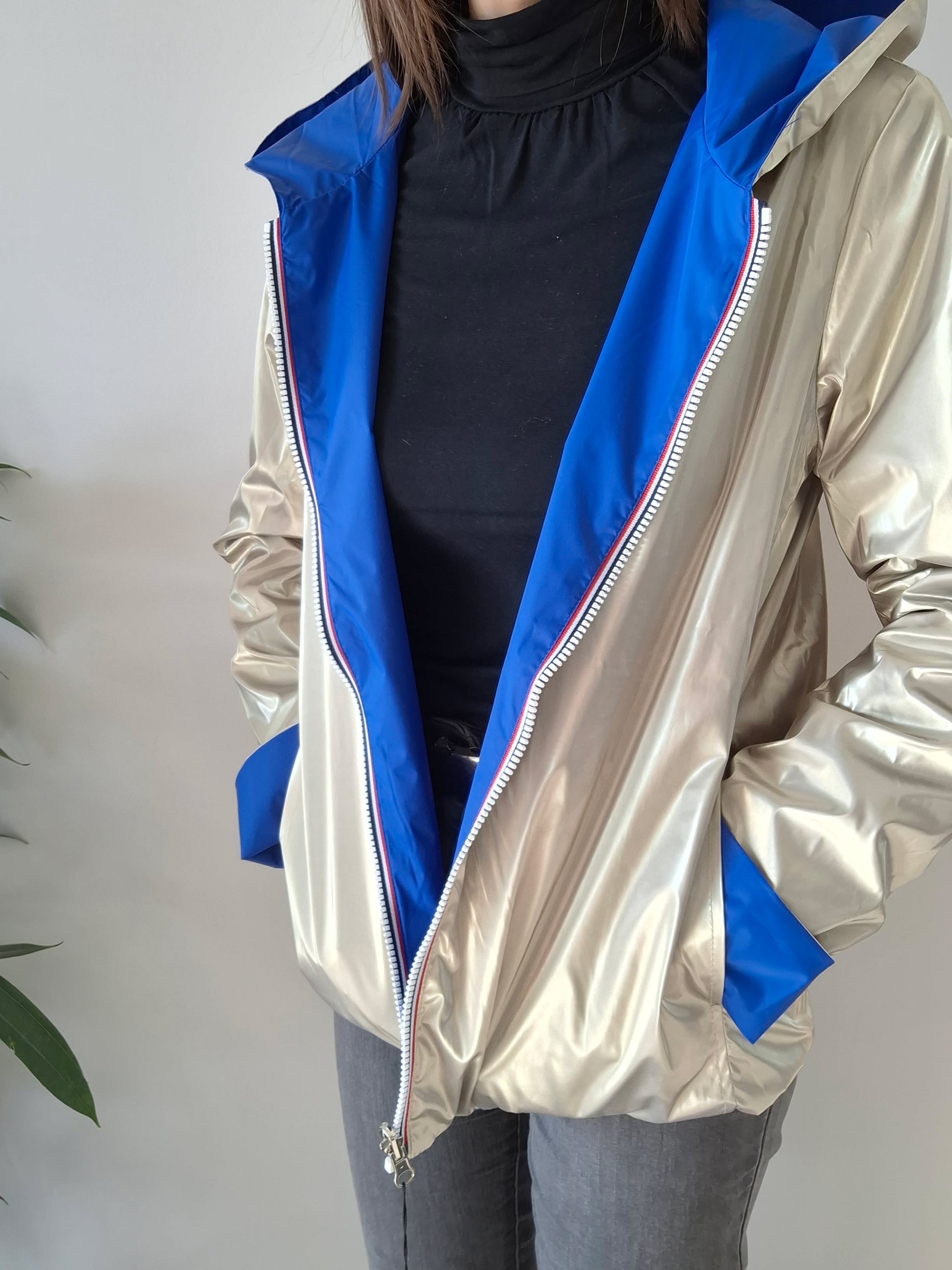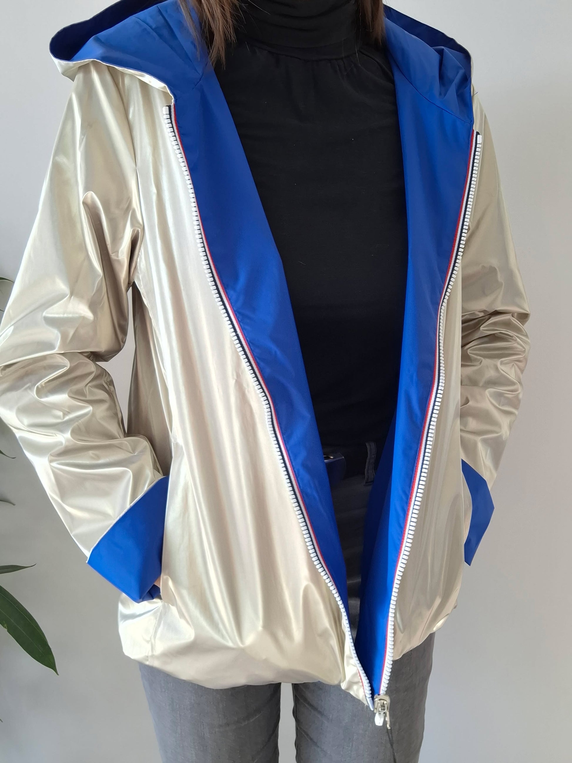 La veste imperméable et réversible présente une face bleu électrique et une face doré délicate, offrant deux options de style distinctes. Les manches et la capuche sont parfaitement proportionnées, et la capuche est garnie pour ajouter une couche supplémentaire de protection contre les intempéries.