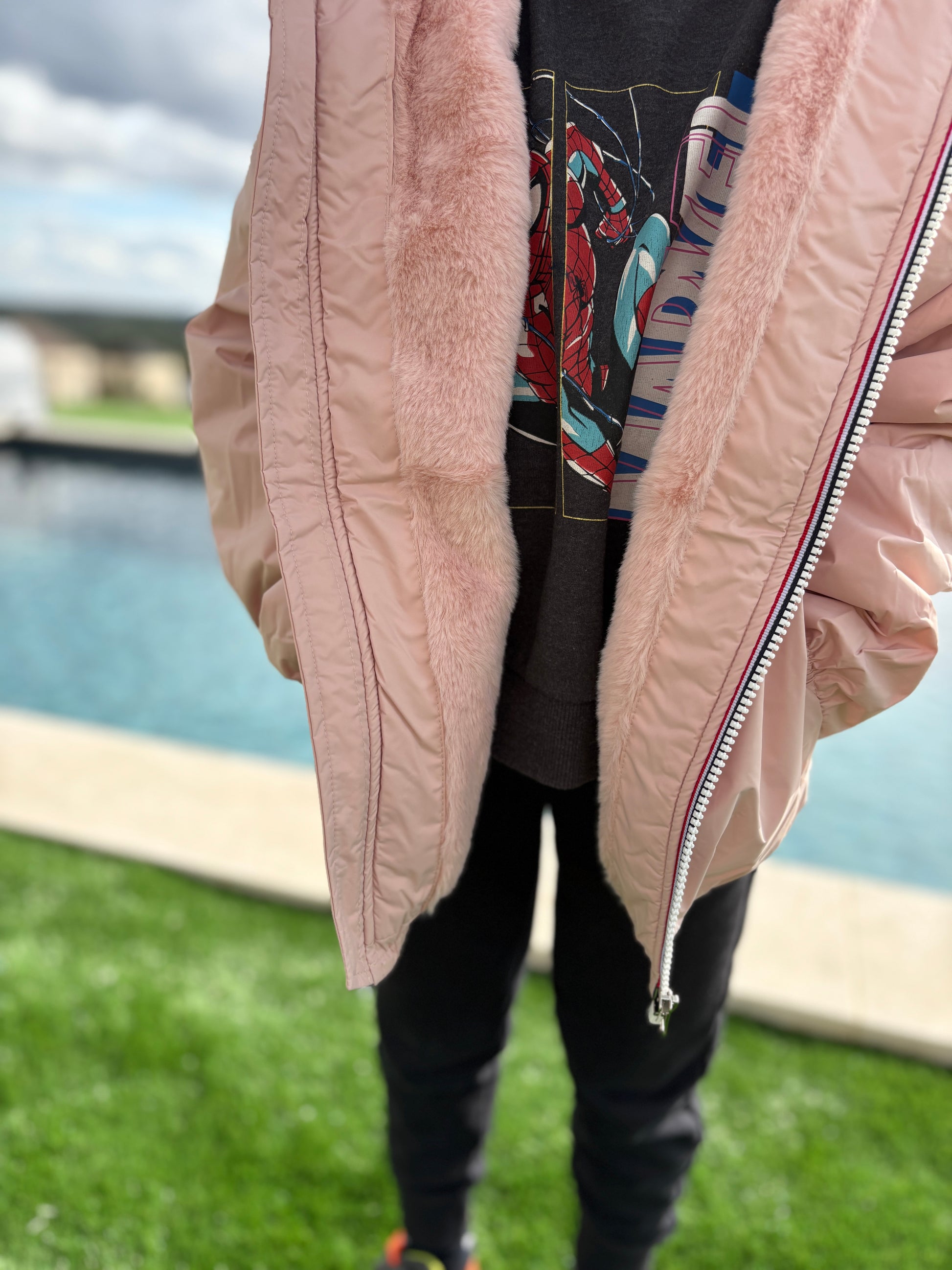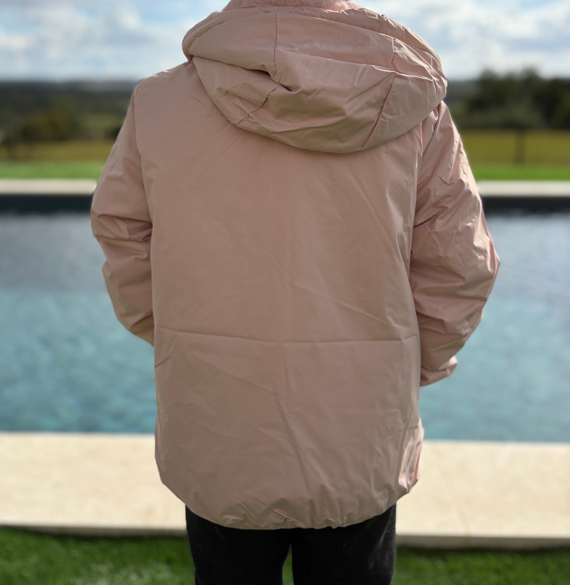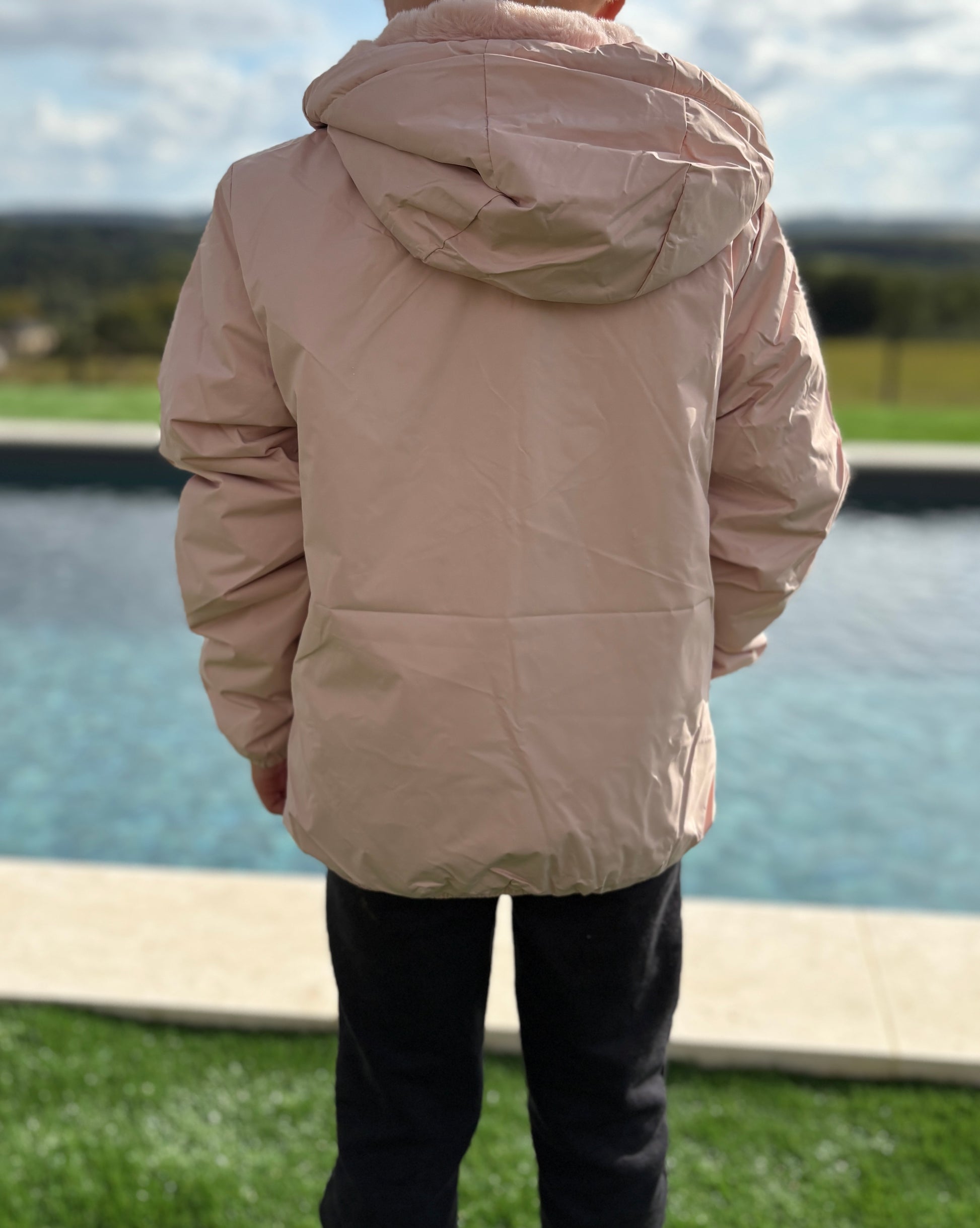 La veste présente une teinte rose tendre et est dotée d'une capuche pratique pour se protéger du vent et de la pluie. L'intérieur est doublé d'un tissu éclatant et moelleux, offrant confort et chaleur. La fermeture éclair robuste parcourt tout le devant, facilitant l'enfilage et le retrait. Les manches légèrement froncées ajoutent une touche élégante au design.