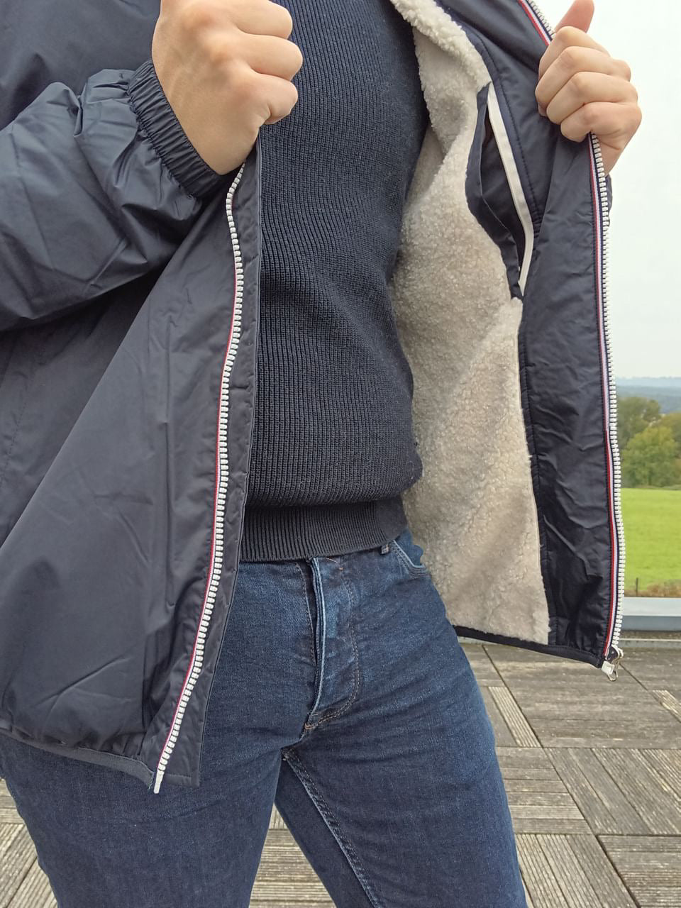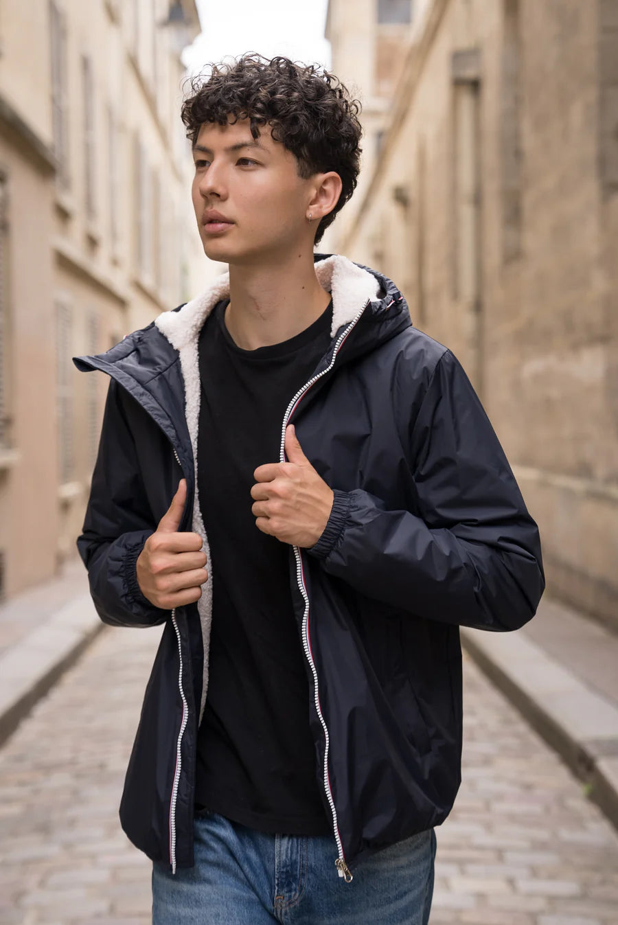 Ce blouson à capuche est de couleur bleu marine. Il dispose d'une doublure en sherpa blanche, offrant une isolation thermique supplémentaire.