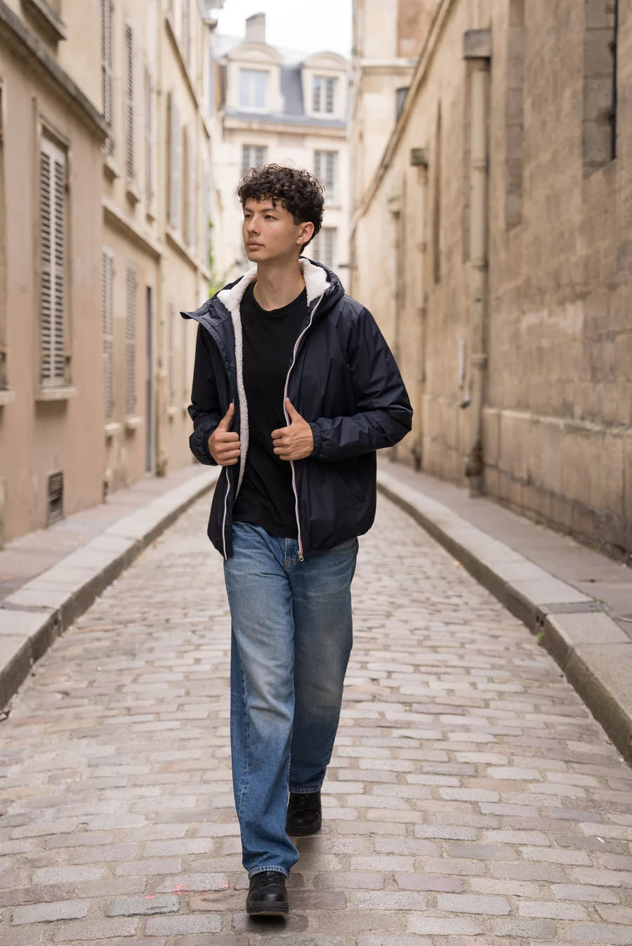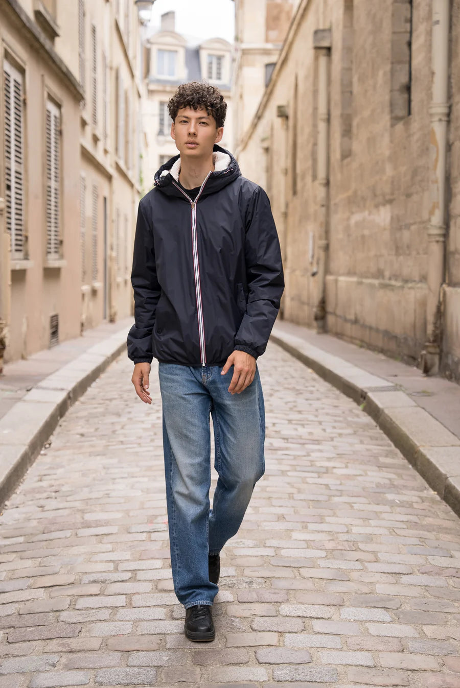 Laura Jo - Manteau imperméable bleu marine HOMME fourré court, doublé en sherpa blanc
