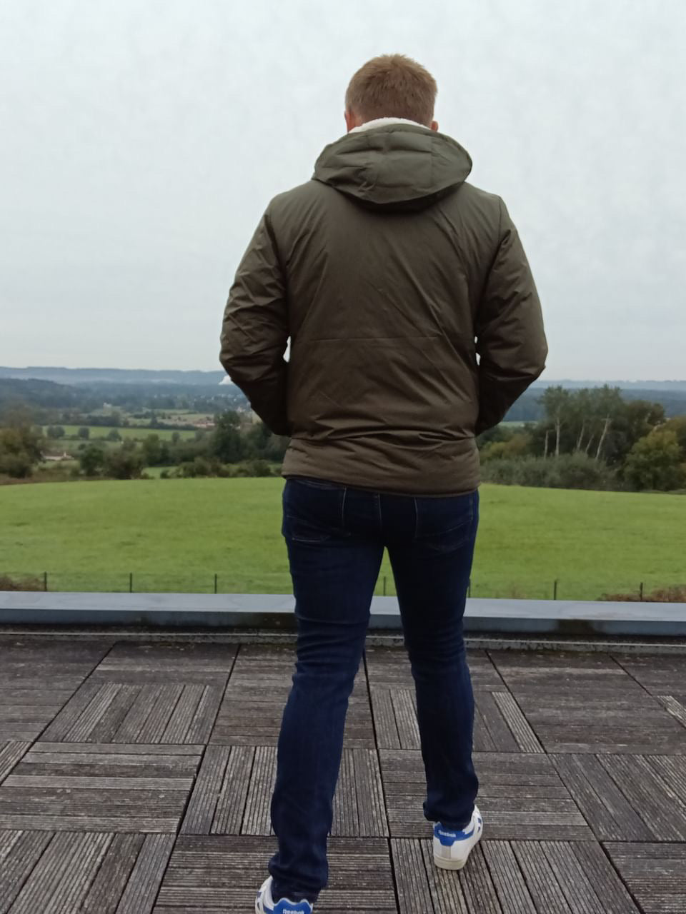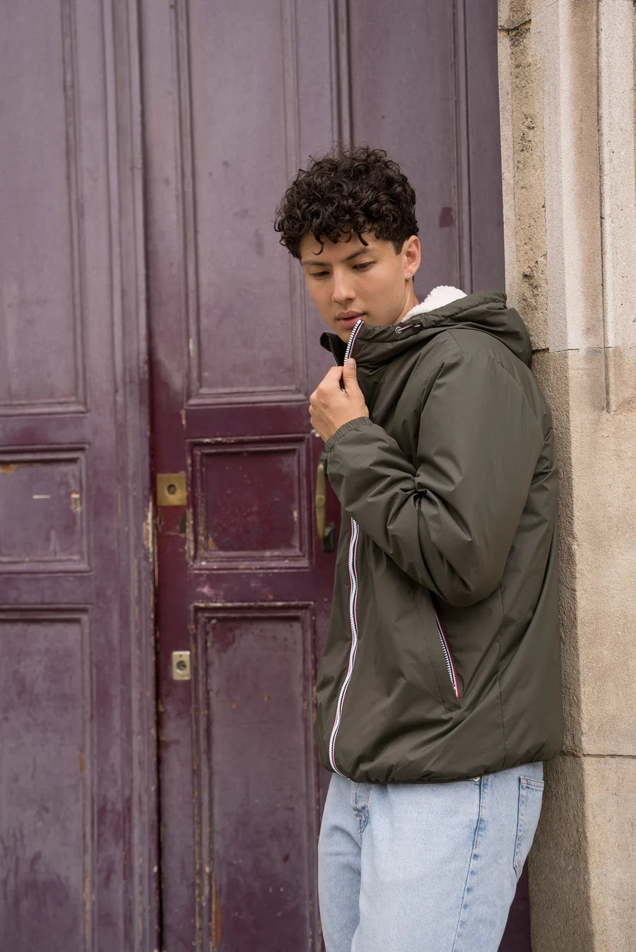 Ce blouson à capuche est de couleur kaki. Il dispose d'une doublure en sherpa blanche, offrant une isolation thermique supplémentaire.