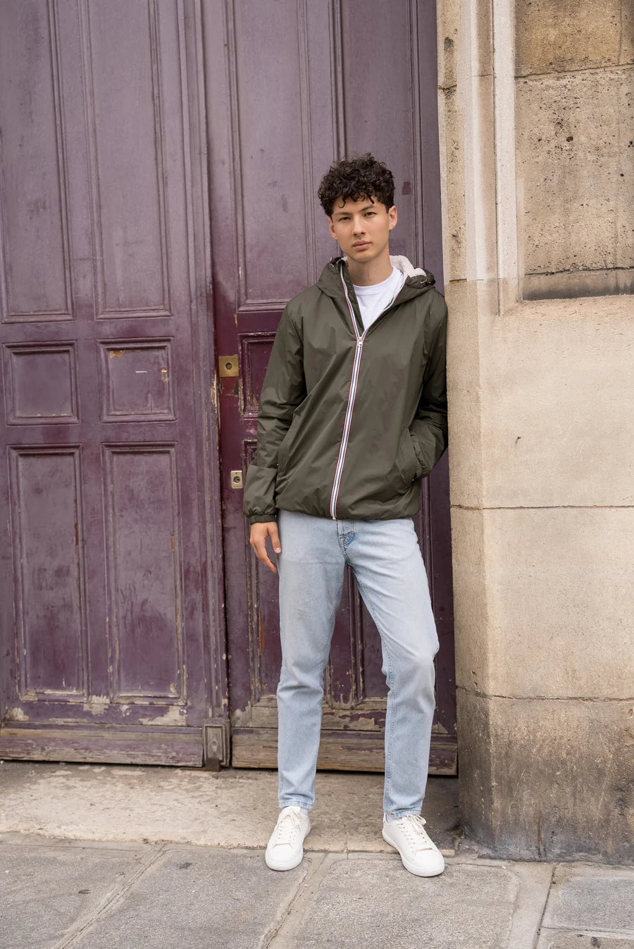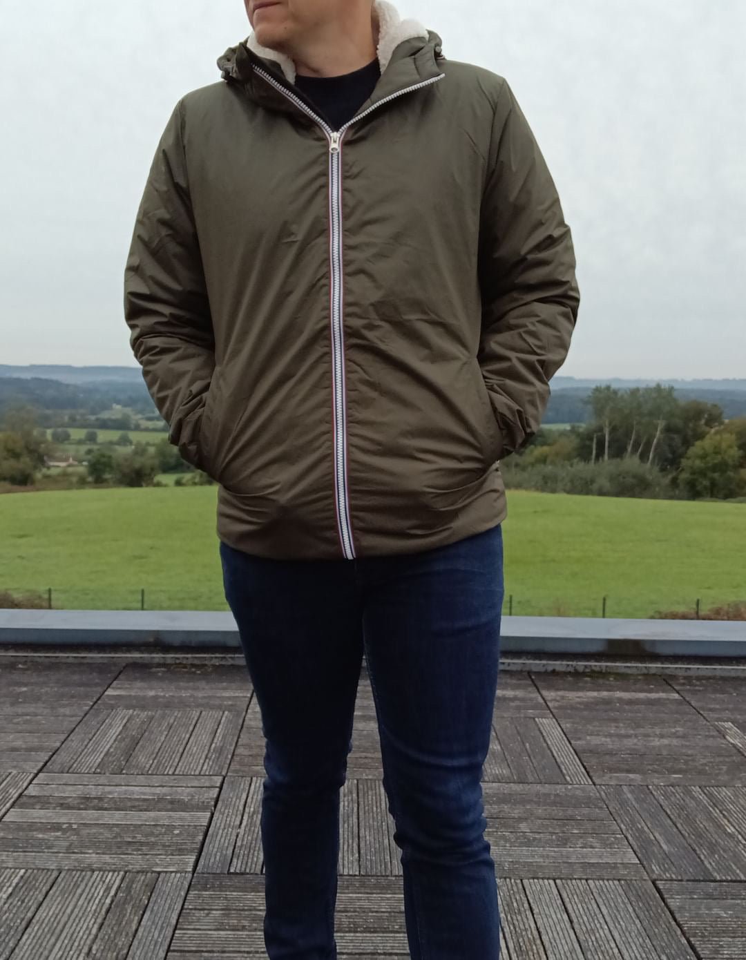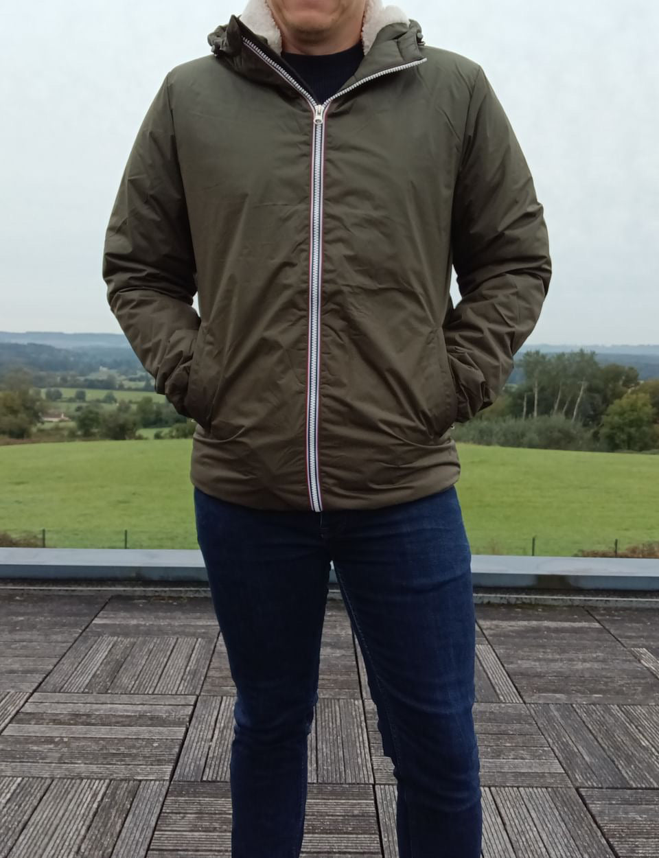 Laura Jo - Manteau imperméable kaki HOMME fourré court, doublé en sherpa blanc